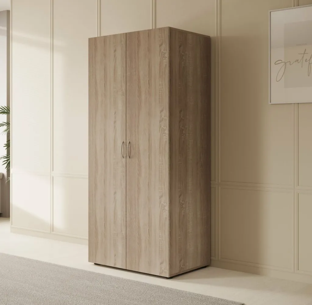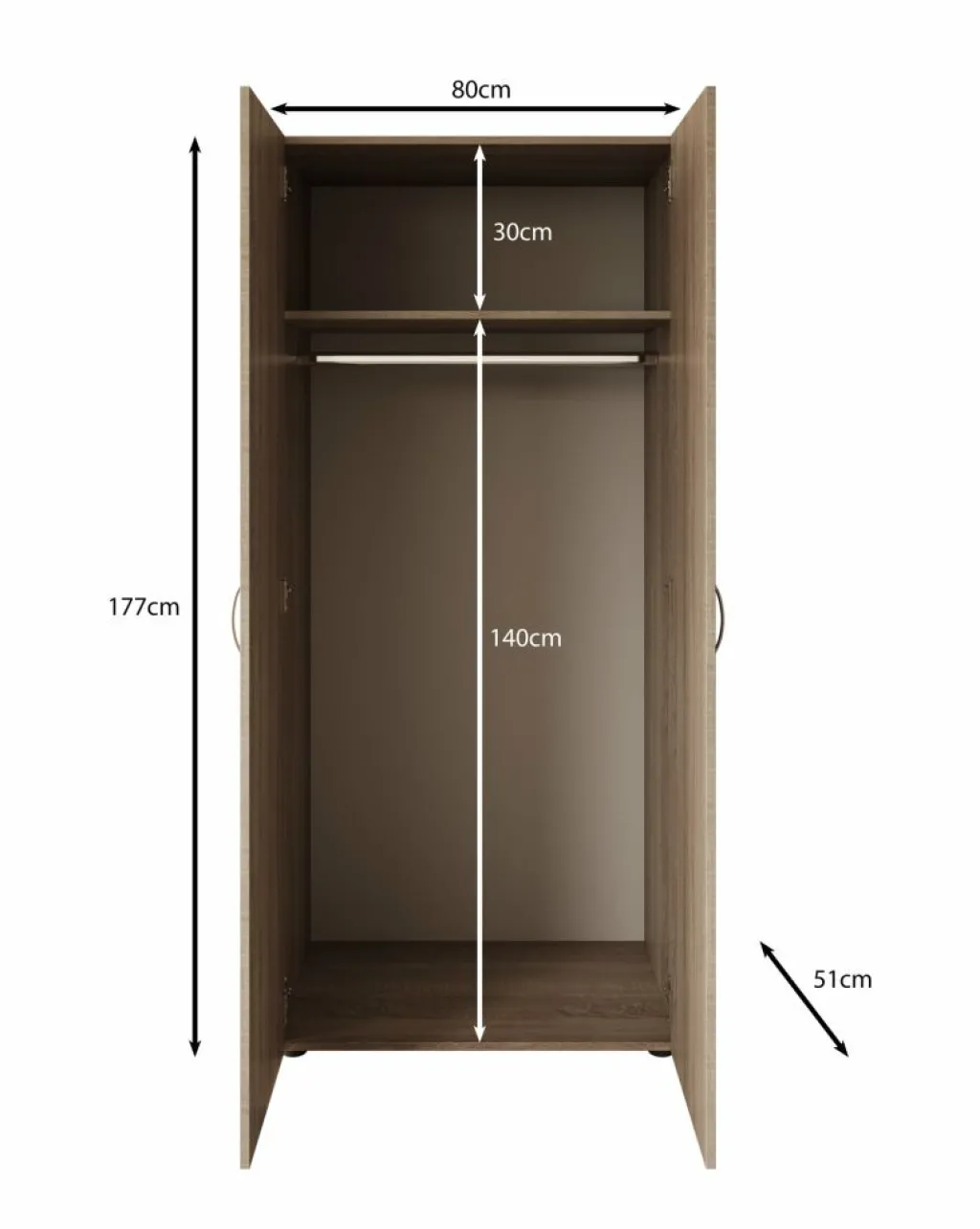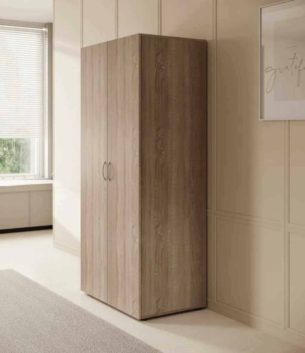 Kledingkast Serra is een moderne garderobekast in de kleur licht eiken. Dit model is voorzien van 2 scharnierdeuren die openen met zilveren handgrepen. De binnenkant van de kast bestaat uit 1 opbergvak en 1 kledingroede. De Serra staat op pootjes.