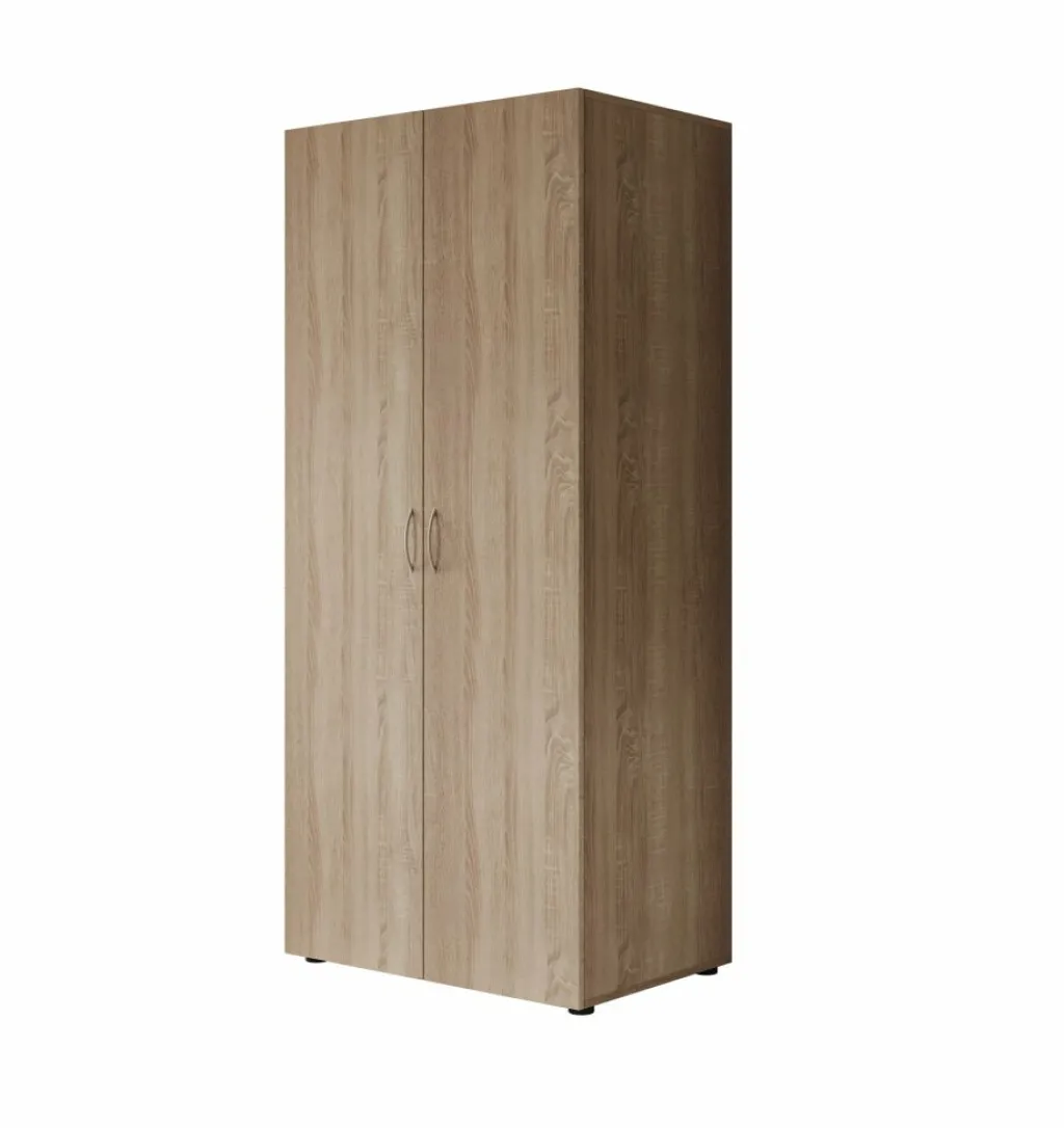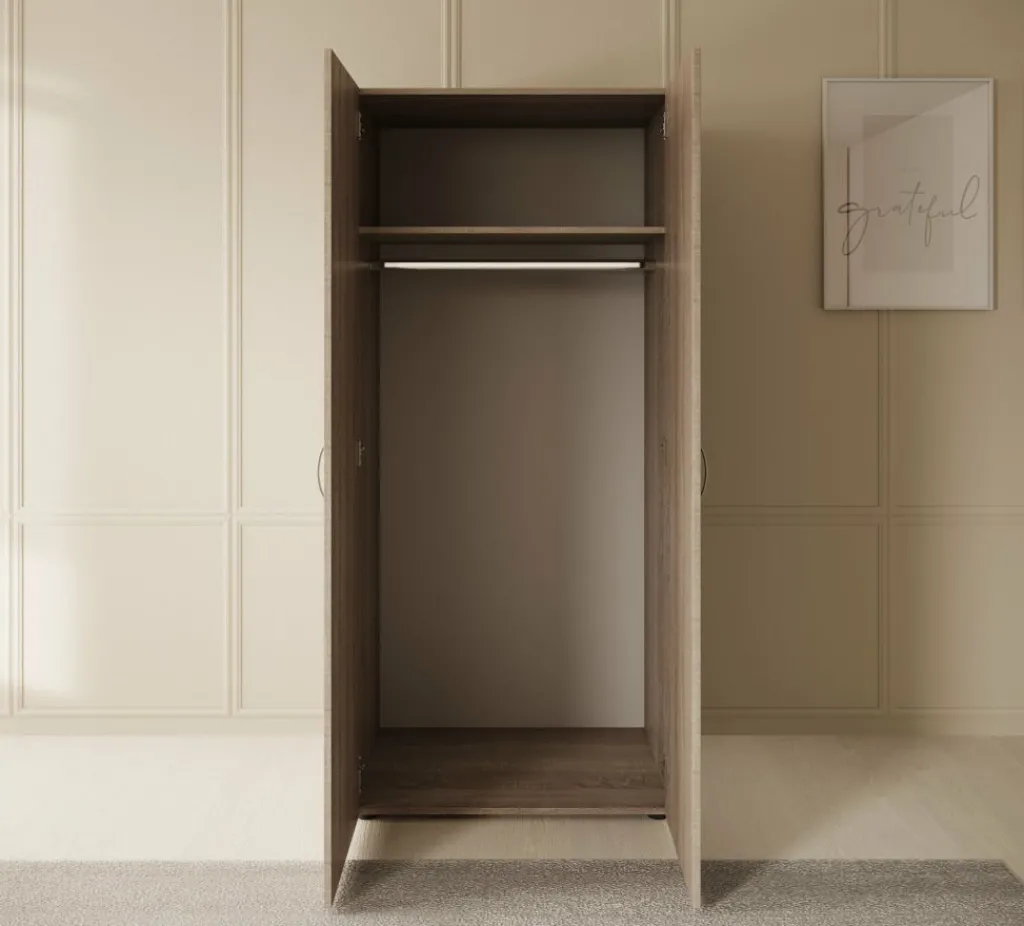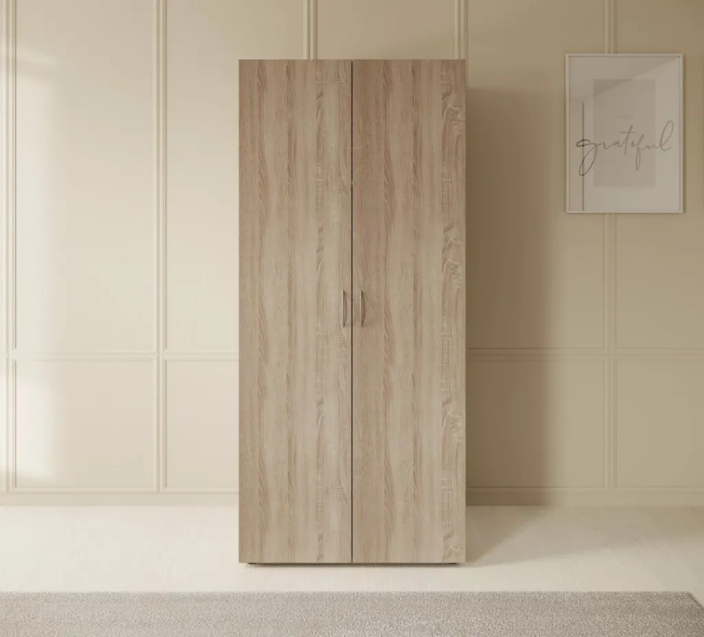 Kledingkast Serra is een moderne garderobekast in de kleur licht eiken. Dit model is voorzien van 2 scharnierdeuren die openen met zilveren handgrepen. De binnenkant van de kast bestaat uit 1 opbergvak en 1 kledingroede. De Serra staat op pootjes.
