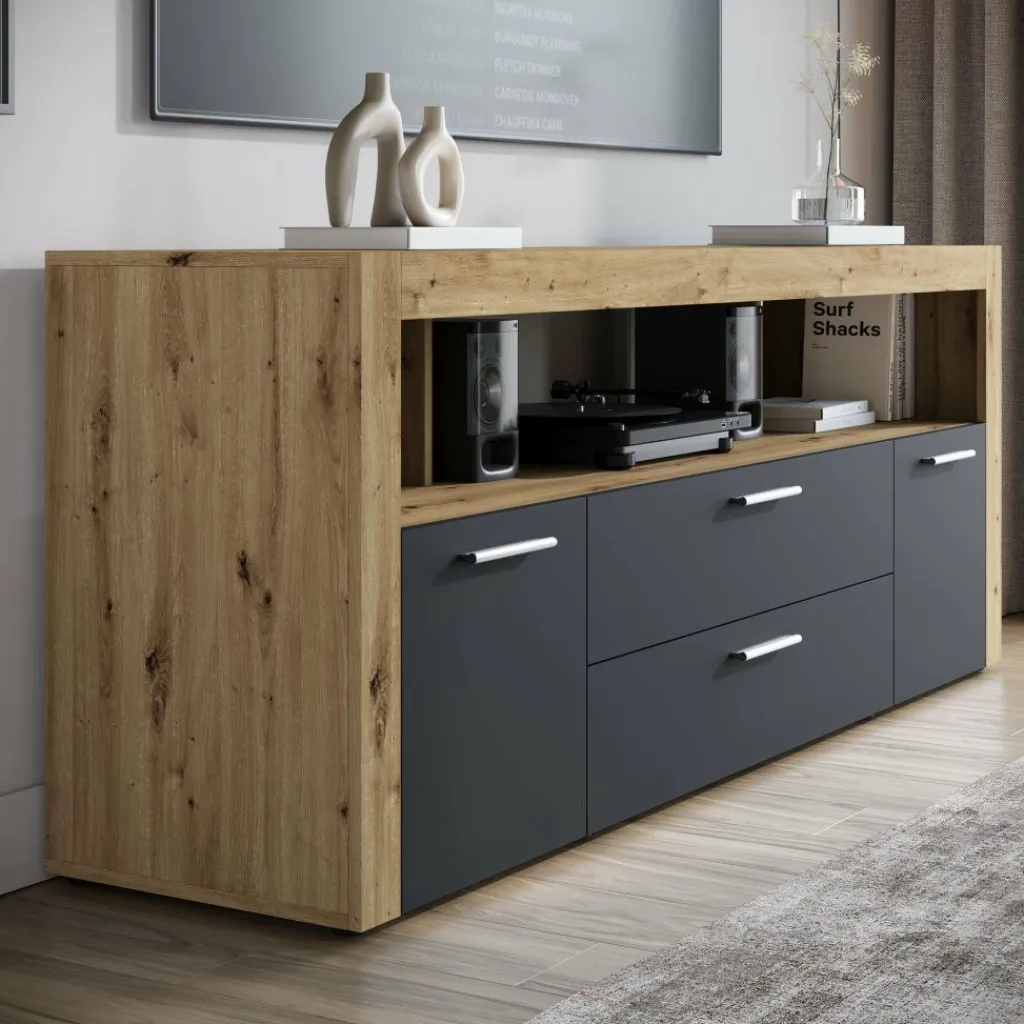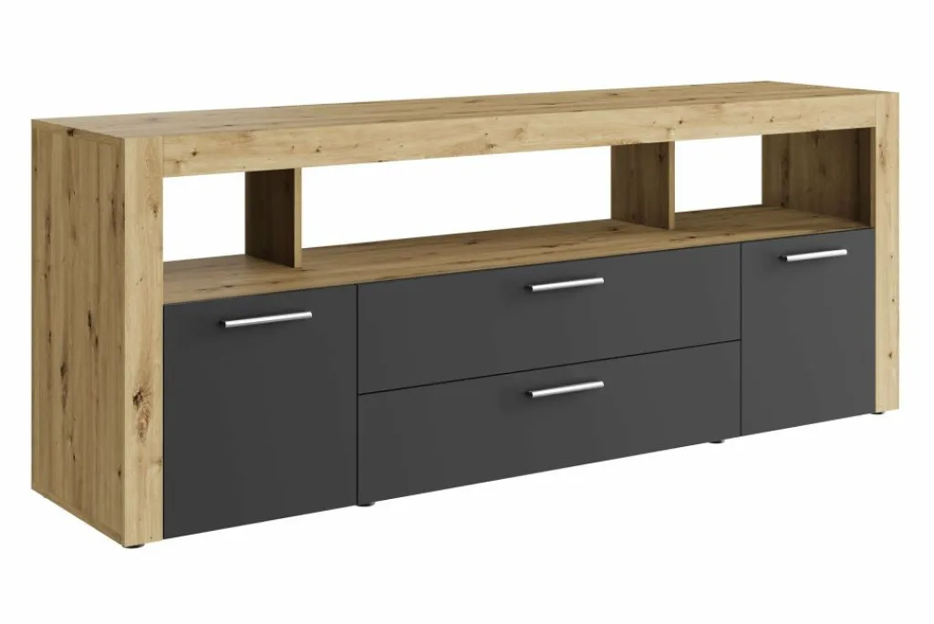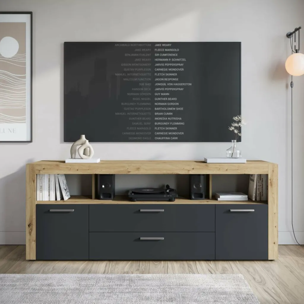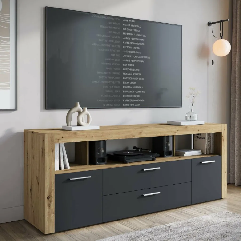 Dankzij het stevige ontwerp (breedte 180,6 cm) is er voldoende ruimte voor een grote televisie. De hele lage pootjes geven het geheel een subtiel zwevend effect.