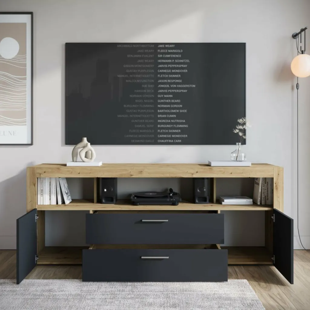 Achter de twee deuren berg je kabels, accessoires of spelcomputers netjes uit het zicht. De twee ruime lades zijn ideaal voor afstandsbedieningen, opladers of andere losse spullen. Bovenin vind je drie open vakken met plek voor bijvoorbeeld een tv-ontvanger, speaker of wat decoratie.