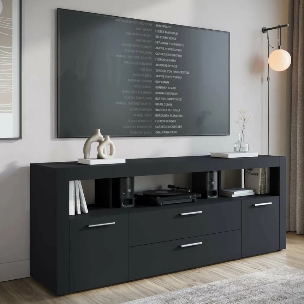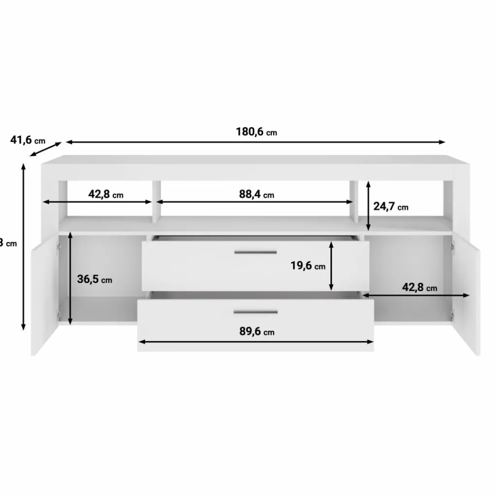 Dankzij het stevige ontwerp (breedte 180,6 cm) is er voldoende ruimte voor een grote televisie. De hele lage pootjes geven het geheel een subtiel zwevend effect.
