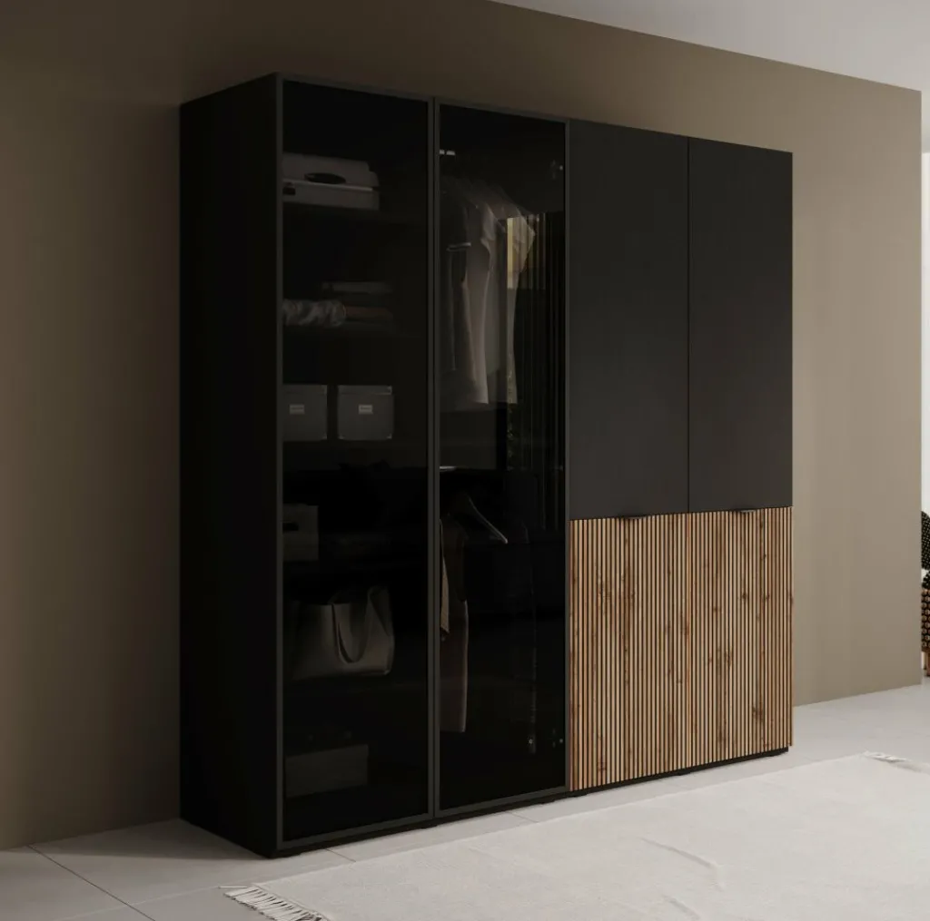 De Shelton kledingkast van 202 cm breed biedt praktische indeling en een moderne uitstraling, perfect voor in de slaapkamer, hal of bijkeuken.