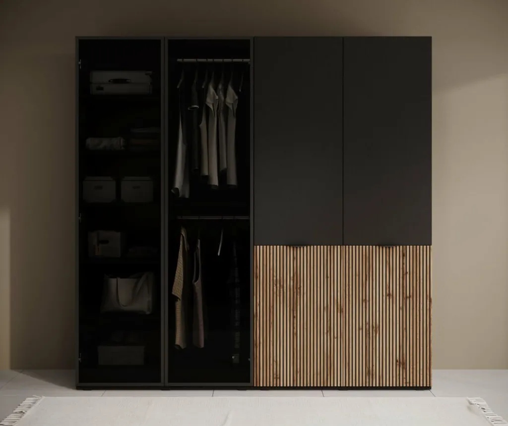 Deze kledingkast is voorzien van vier openslaande deuren (scharnierdeuren), waarmee je eenvoudig toegang hebt tot alle compartimenten. Achter de deuren vind je een slimme indeling met meerdere legplanken en een royale hangruimte. Ideaal voor het opbergen van zowel gevouwen kleding als hangende items zoals overhemden, jurken of jassen.