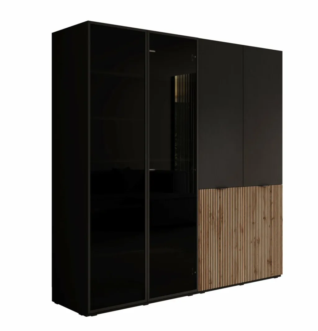De kast is uitgevoerd in een combinatie van mat zwart en Wotan eikenhout-look, wat zorgt voor een warme, eigentijdse uitstraling.