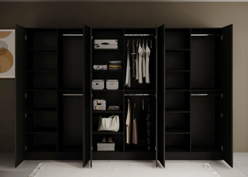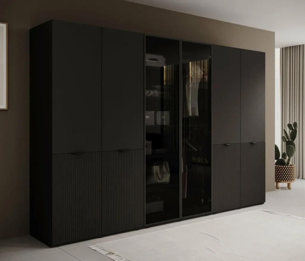De Kledingkast Shelton biedt een royale opbergruimte verdeeld over drie kastelementen. Het middelste deel is voorzien van twee zwarte glazen draaideuren met daarachter legplanken en een hanggedeelte. De twee buitenste delen hebben elk vier deuren, waarvan de onderste helft een verticale reliƫfstructuur heeft. Achter deze deuren vind je meerdere legplanken en dubbele hanggedeeltes, geschikt voor het overzichtelijk opbergen van kleding, schoenen en accessoires.