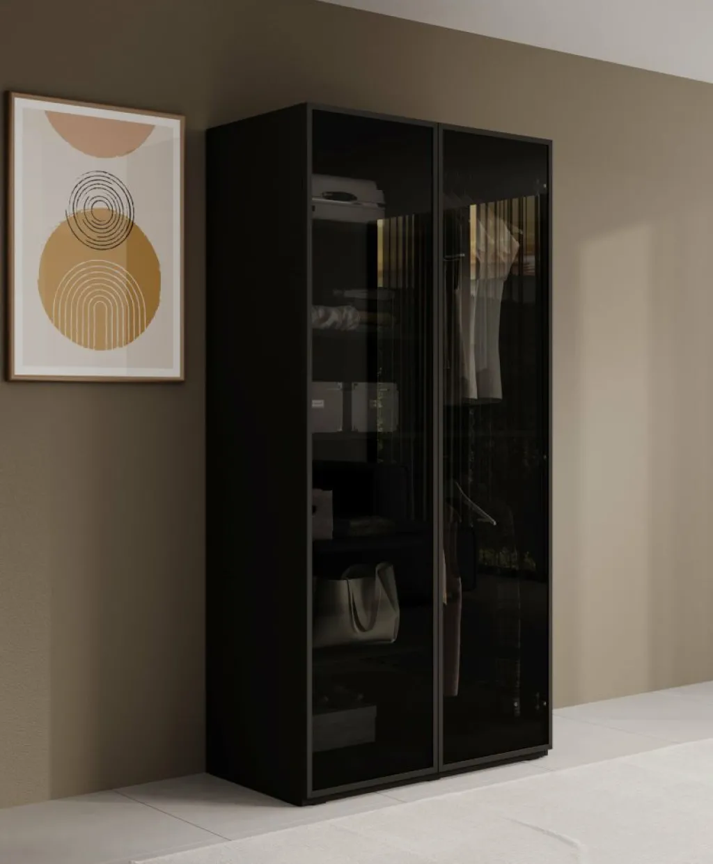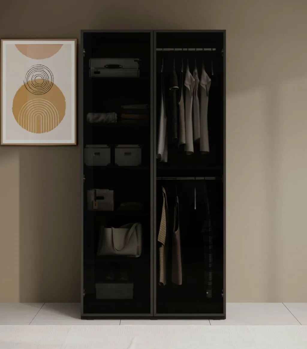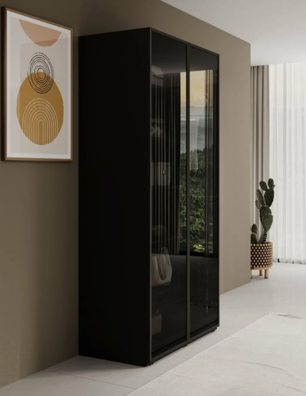 De Shelton kledingkast heeft twee grote deuren van rookglas die zorgen voor een moderne en strakke uitstraling. Het zwarte frame geeft de kast een industriële look. Binnenin biedt de kast veel opbergruimte met een stevige legplank en een kledingroede, handig voor het organiseren van kleding, schoenen of accessoires. De deuren zijn greeploos waardoor de kast strak oogt. Dankzij de glazen deuren blijft de inhoud subtiel zichtbaar, waardoor je jouw favoriete kledingstukken mooi kunt presenteren.