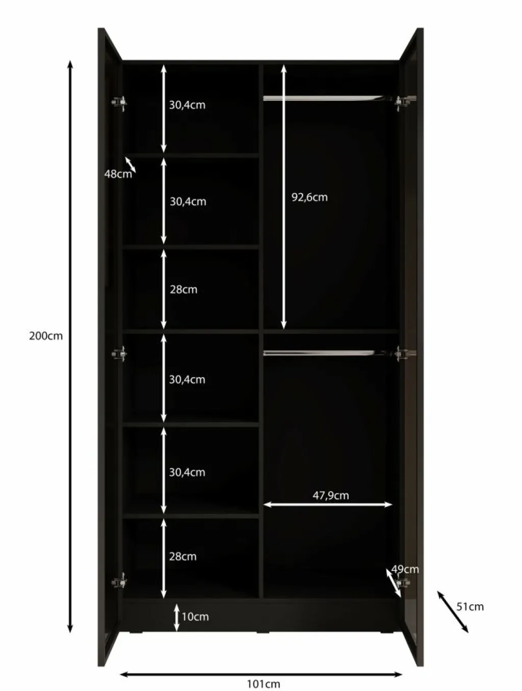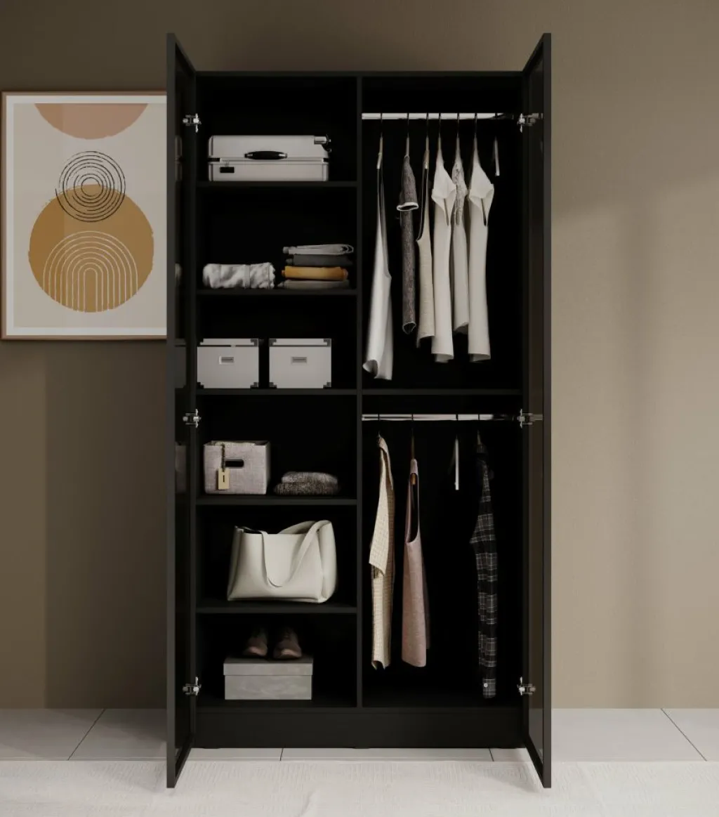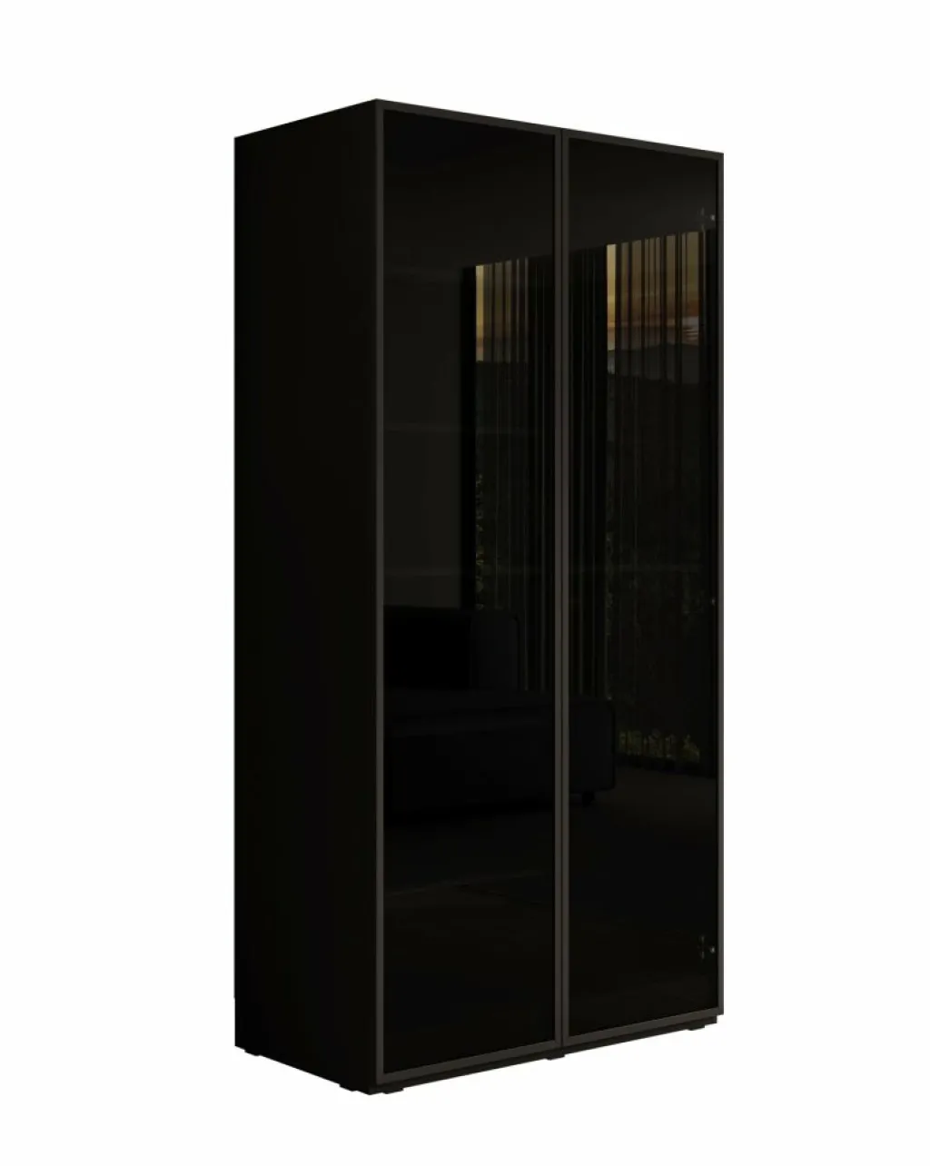 De Shelton kledingkast heeft twee grote deuren van rookglas die zorgen voor een moderne en strakke uitstraling. Het zwarte frame geeft de kast een industriële look. Binnenin biedt de kast veel opbergruimte met een stevige legplank en een kledingroede, handig voor het organiseren van kleding, schoenen of accessoires. De deuren zijn greeploos waardoor de kast strak oogt. Dankzij de glazen deuren blijft de inhoud subtiel zichtbaar, waardoor je jouw favoriete kledingstukken mooi kunt presenteren.
