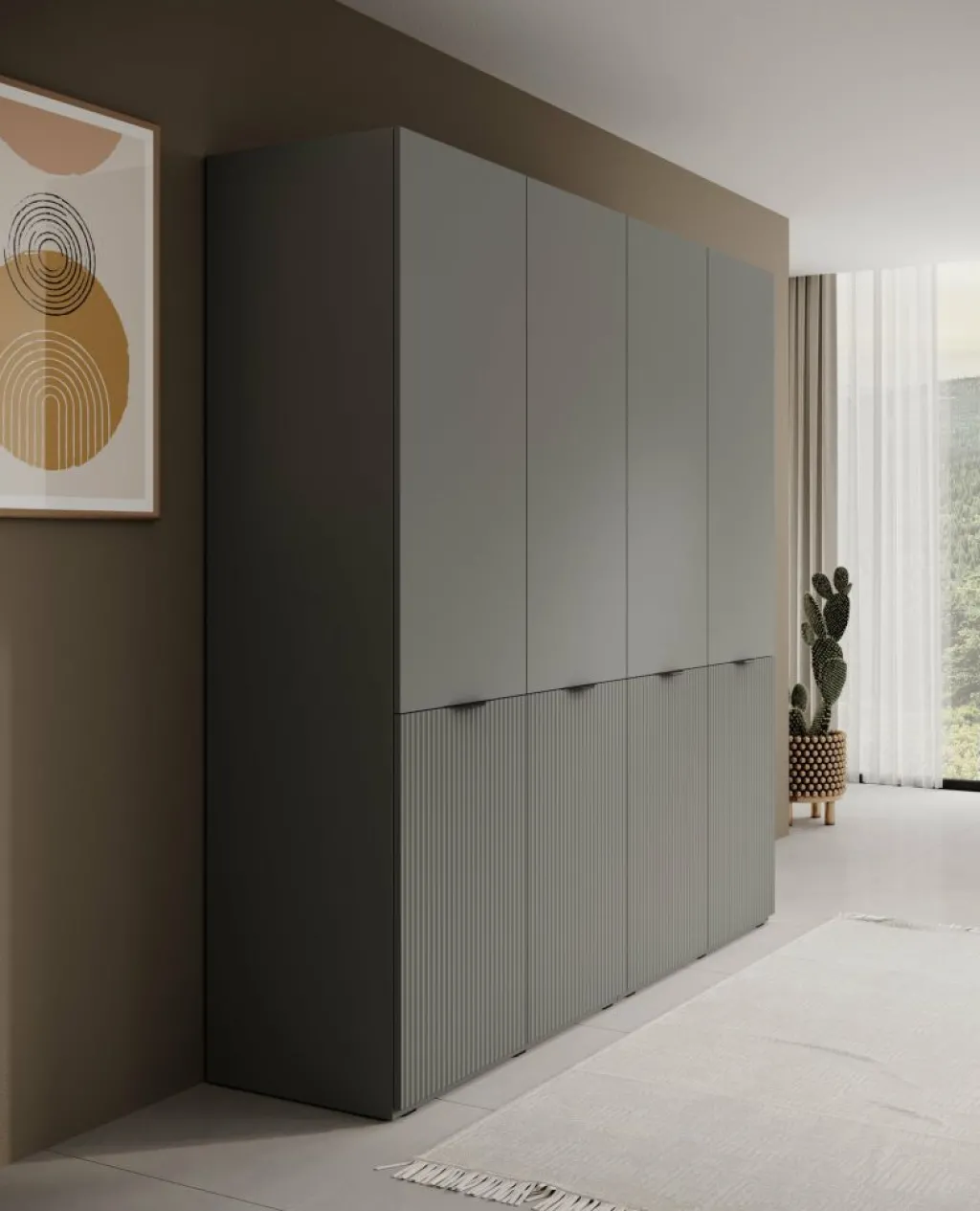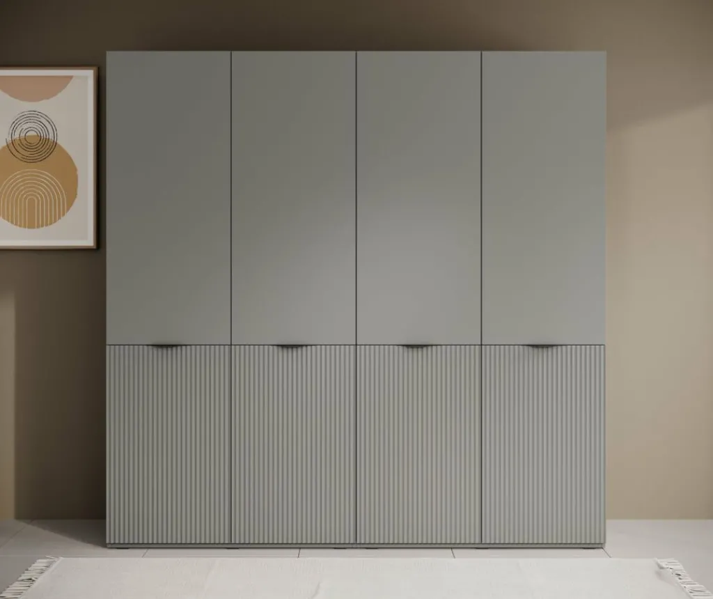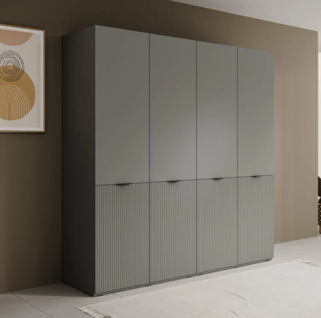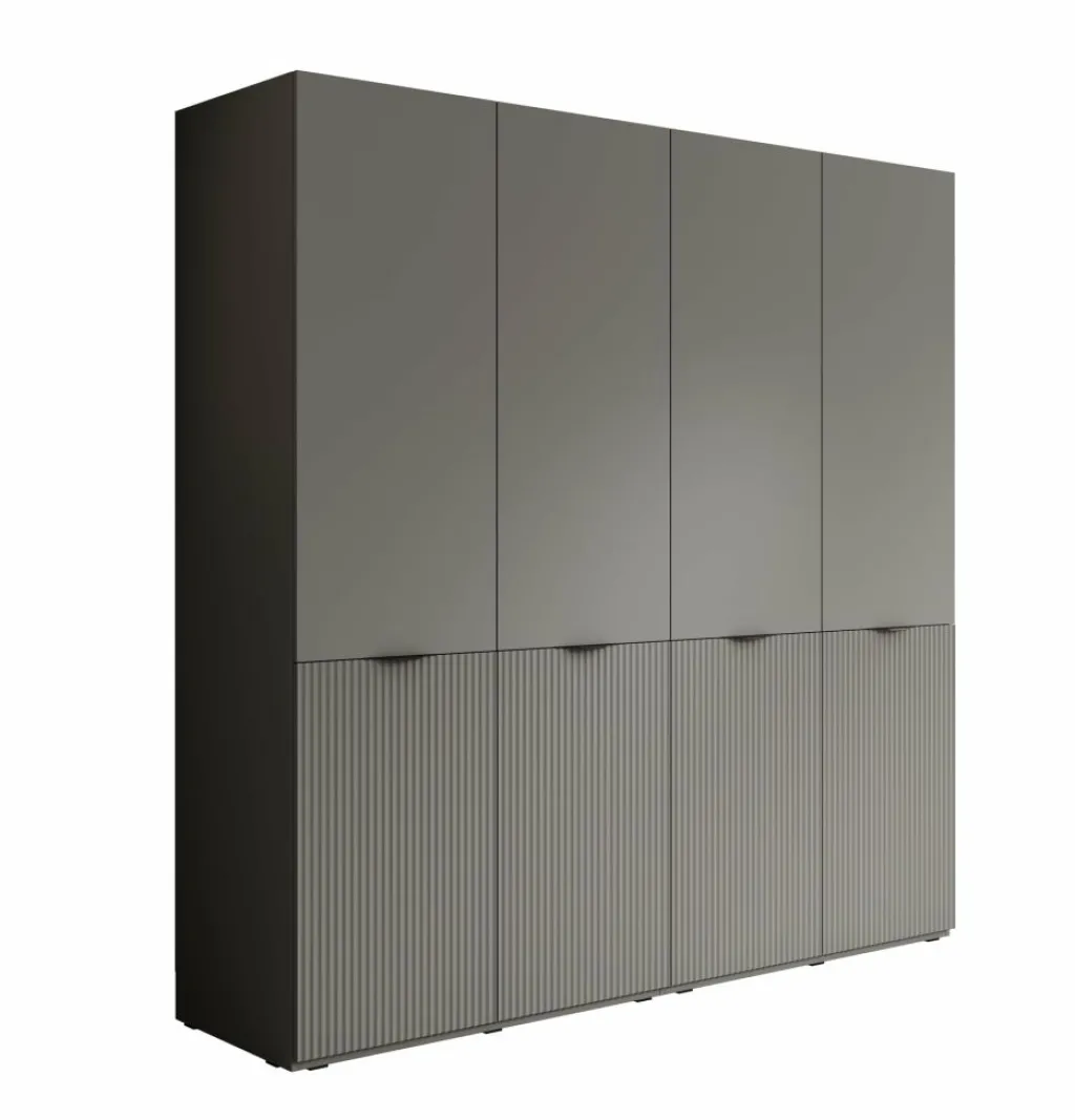 De Kledingkast Shelton biedt veel opbergruimte in een strak vormgegeven ontwerp. De kast is uitgevoerd in grijs met verticale lijnen op de onderste deuren voor een subtiel accent. Met een breedte van 202 cm en een hoogte van 200 cm is dit een ruime oplossing voor het opbergen van kleding en accessoires.
