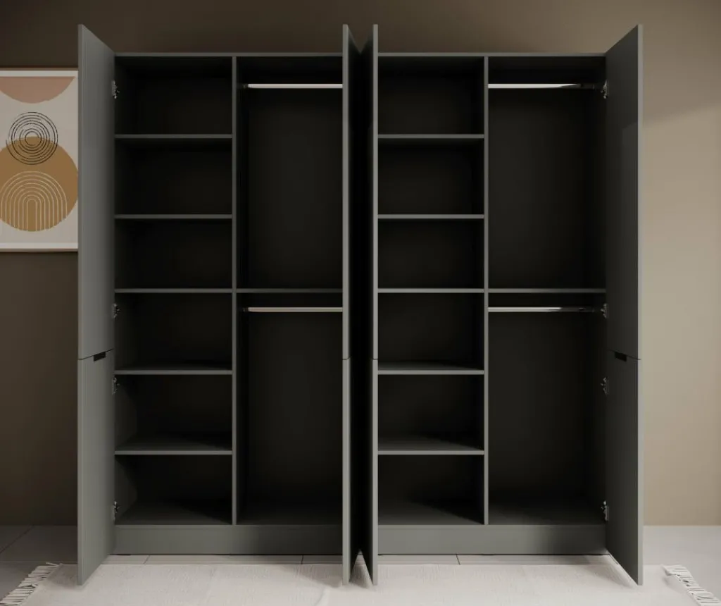 Achter de vier draaideuren vind je een praktische combinatie van legplanken en hangruimte. De kast beschikt over meerdere vakken van verschillende hoogtes, waardoor er plaats is voor zowel gevouwen kleding als grotere items. Daarnaast zijn er twee roedes voor het ophangen van shirts, jurken en jassen.