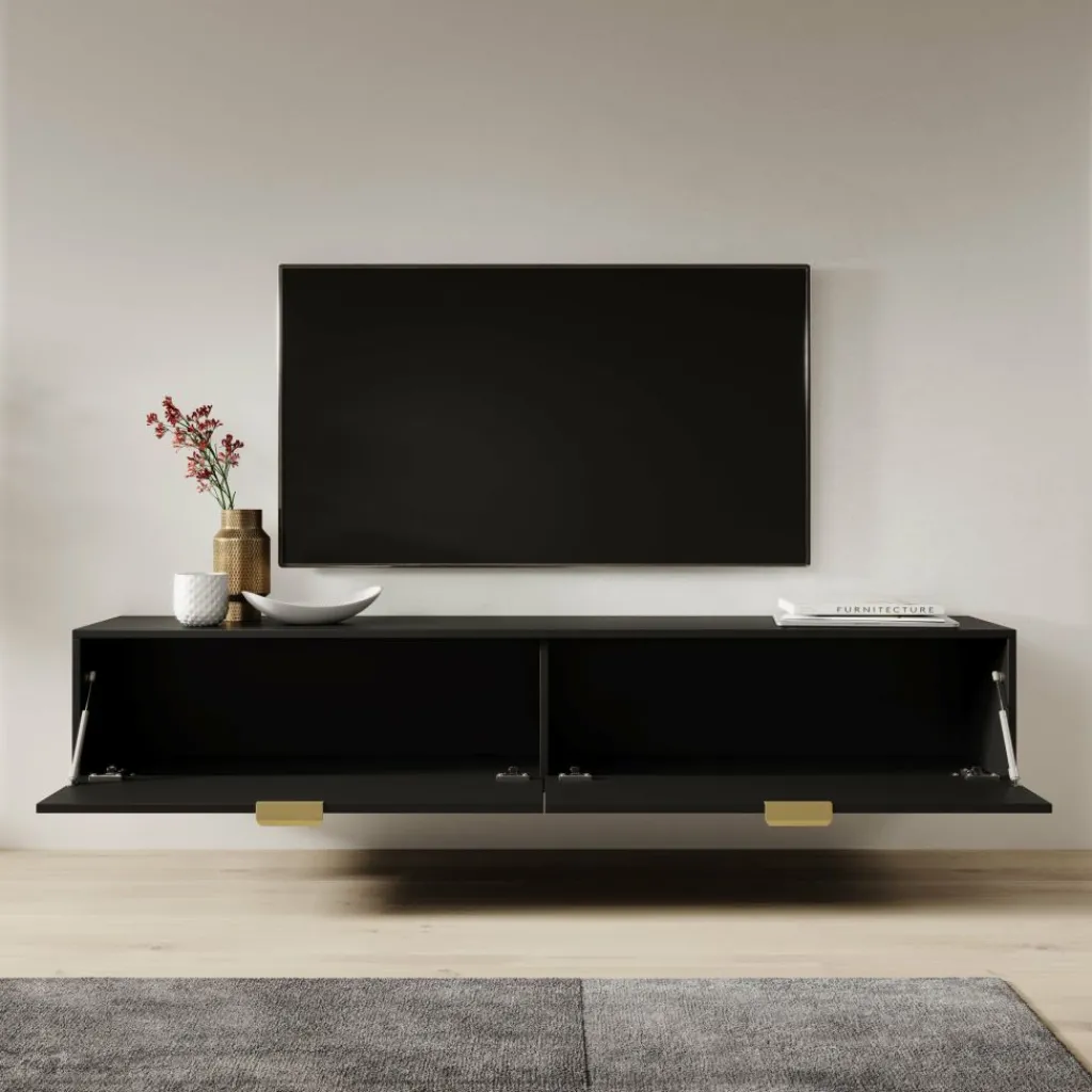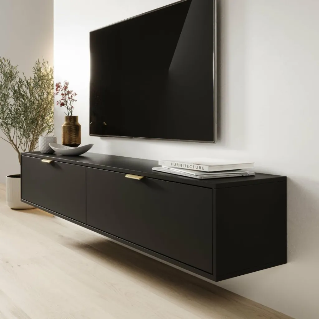Breng luxe en modern design samen in jouw woonkamer met het Silas TV-meubel in zwart. Dit stijlvolle zwevende meubel van 175 cm breed biedt niet alleen voldoende ruimte voor je televisie, maar ook praktische opbergruimte.