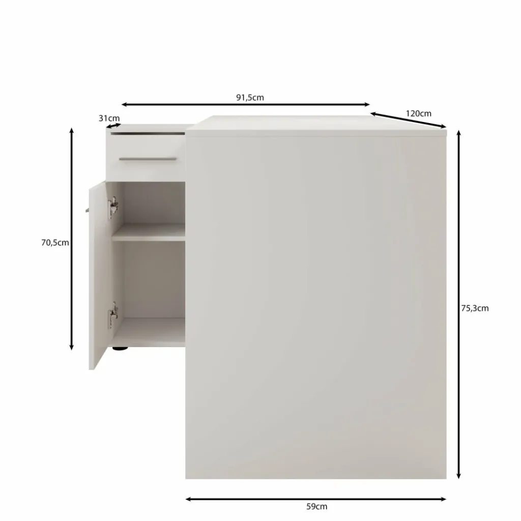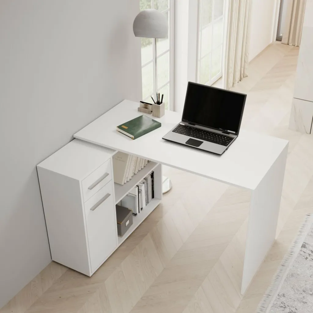 Aan de linkerzijde vind je twee open vakken voor boeken, mappen of decoratie. Daarnaast beschikt het bureau over een lade voor kleine kantoorbenodigdheden en een kastje met verstelbare plank voor extra opbergruimte. Het blad biedt voldoende ruimte voor een laptop, schrijfgerei en accessoires, waardoor je comfortabel en overzichtelijk kunt werken.