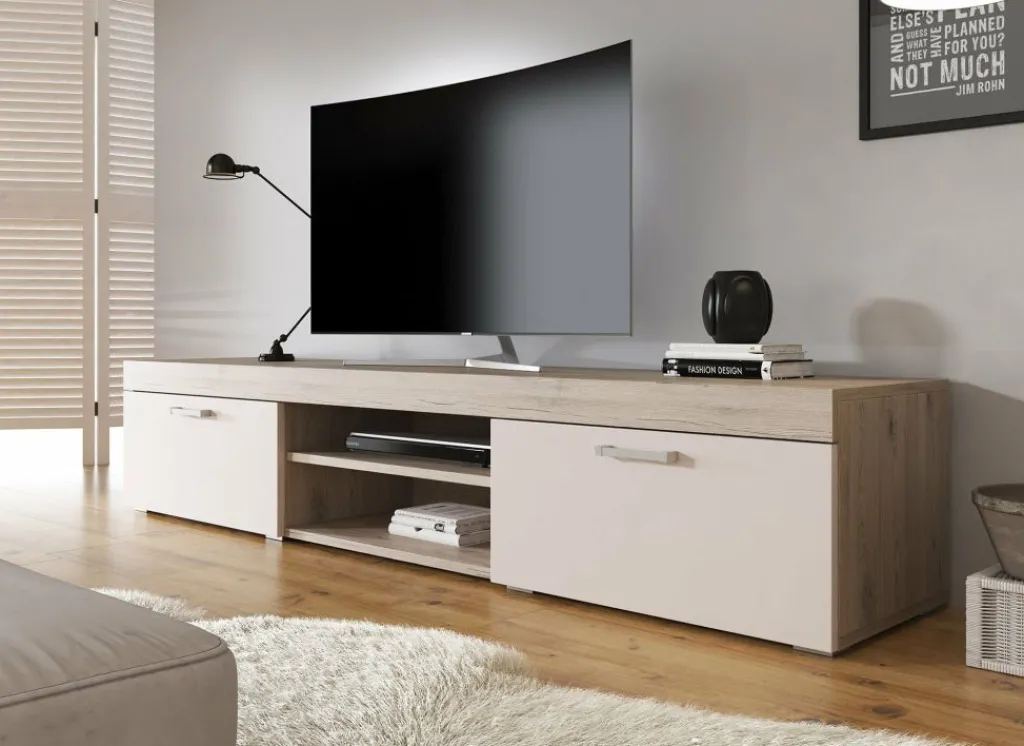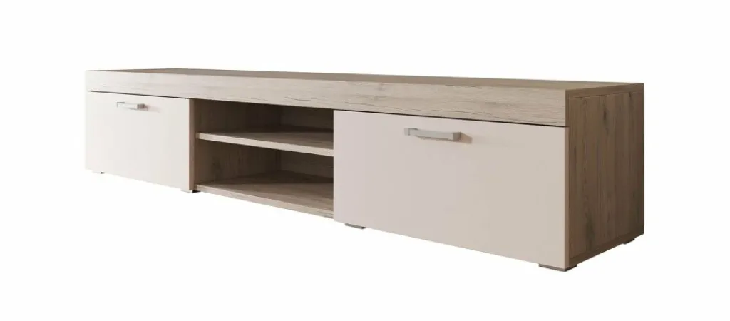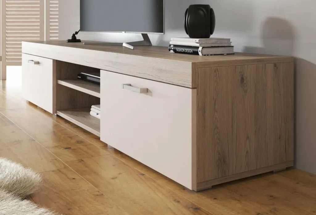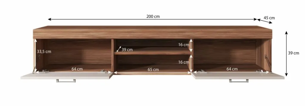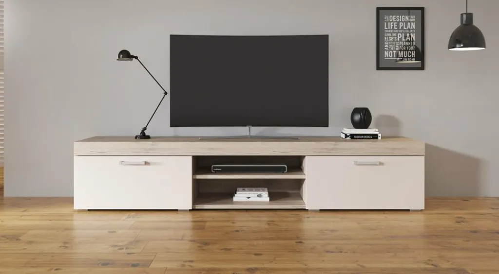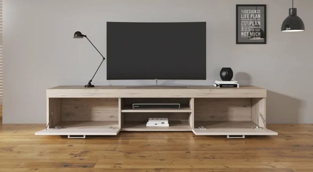 Dit tv-meubel beschikt over twee open vakken in het midden. Handig voor receivers en ander apparatuur. Daarnaast bevinden zich 2 opbergvakken welke afsluitbaar zijn met een klepdeur. Het meubel bestaat uit een geheel van 200 cm.