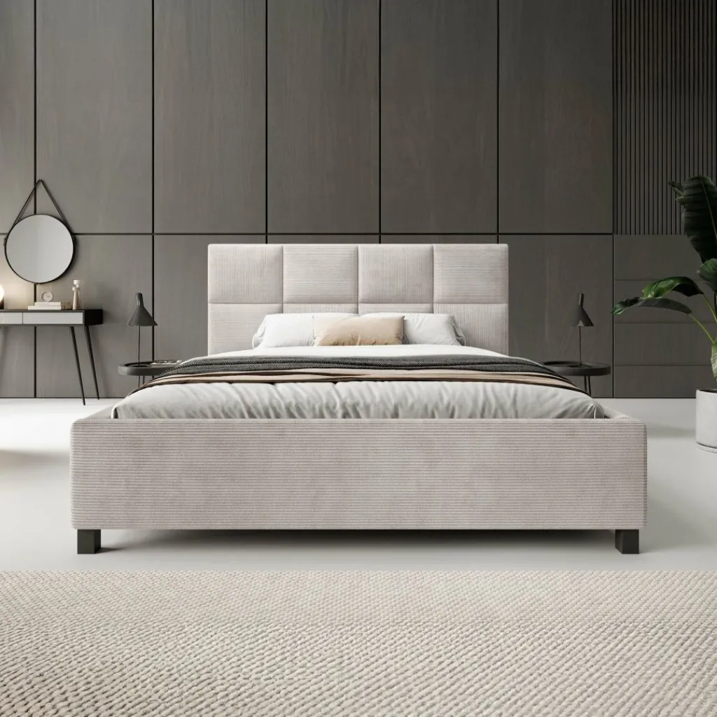 Het tweepersoonsbed Soline combineert eigentijds design met een luxueuze uitstraling. Bekleed in een zachte ribstof in beige, straalt dit bed warmte en elegantie uit, passend in zowel moderne als klassieke slaapkamers.