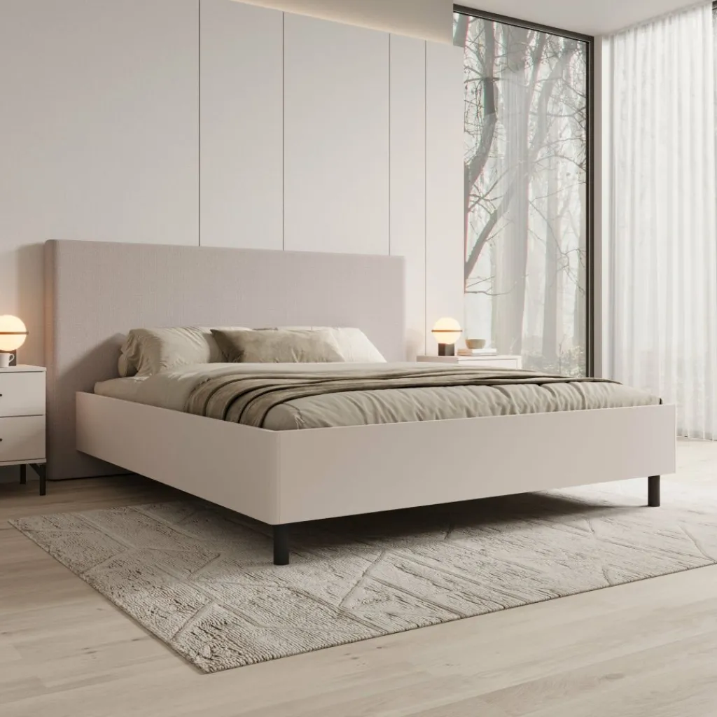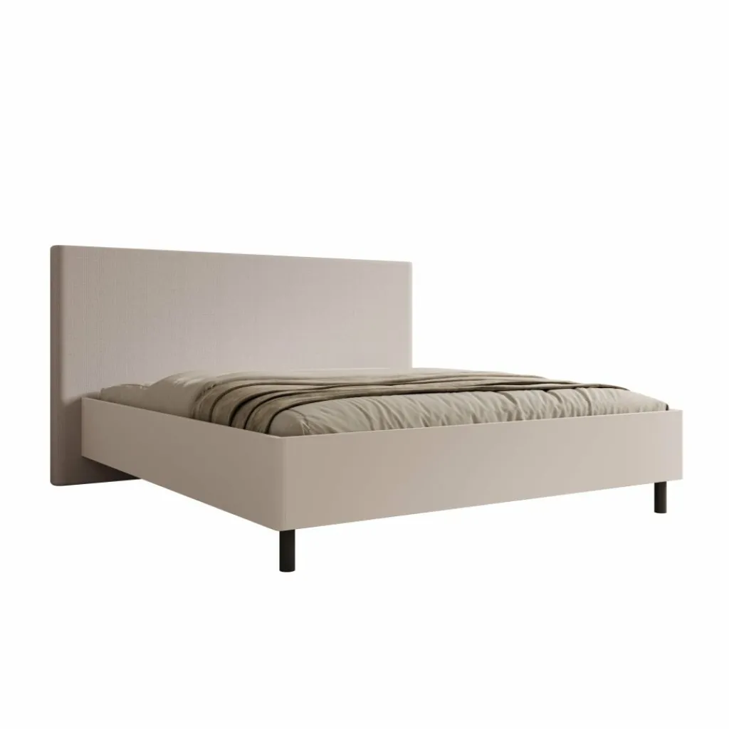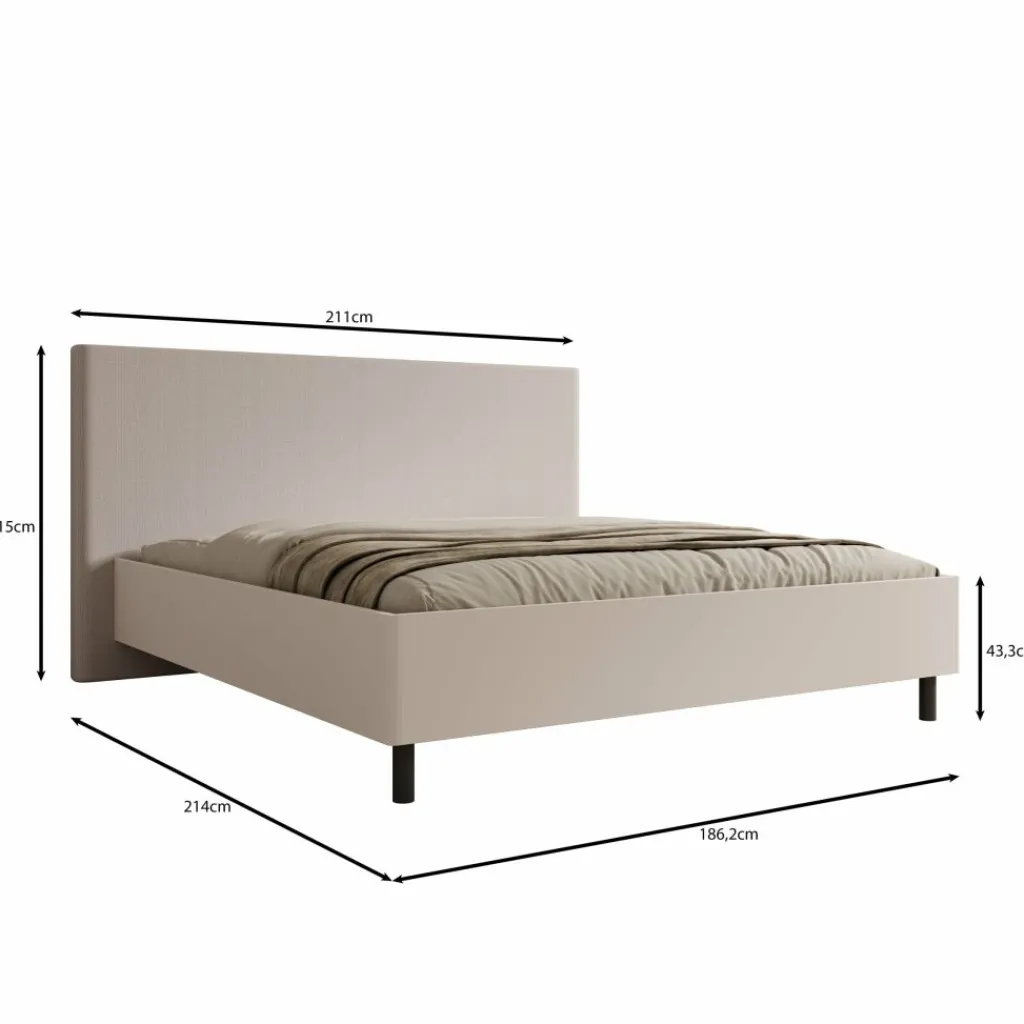 Het bedframe staat op slanke zwarte poten, wat zorgt voor een vrij vloerbeeld en extra ruimte onder het bed. Dit maakt schoonmaken eenvoudiger en houdt de slaapkamer overzichtelijk. De beige bekleding vormt een neutrale basis en is goed te combineren met uiteenlopende kleuren en materialen.