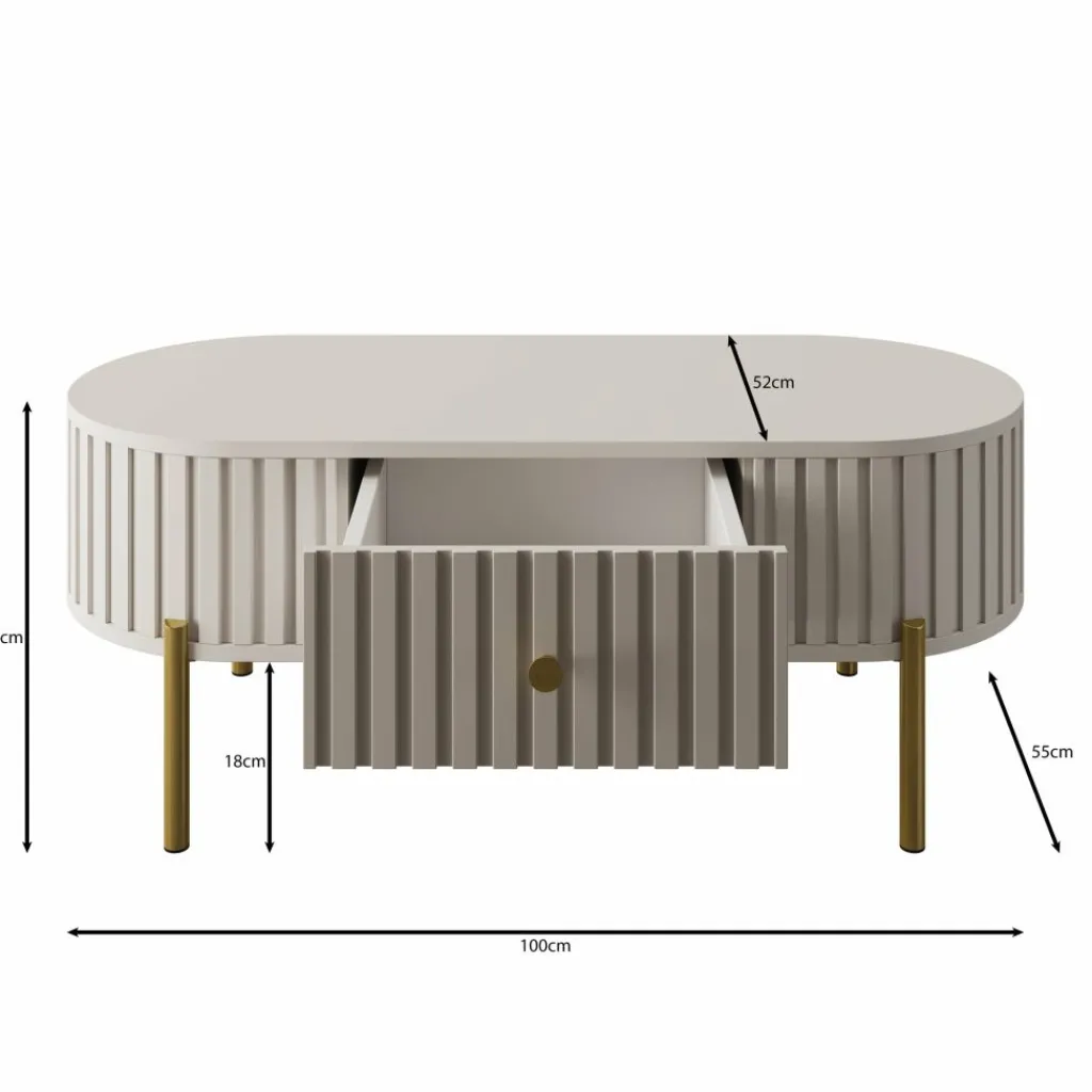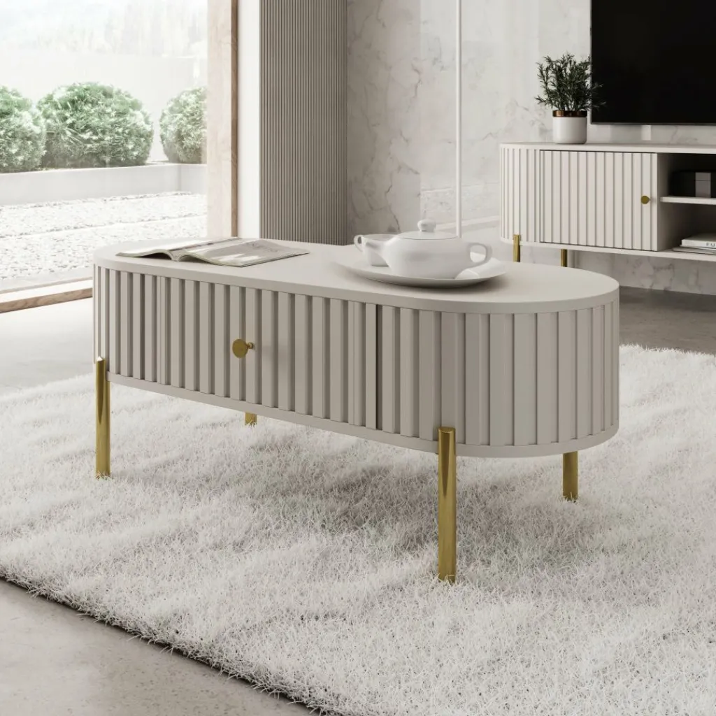 De Sorenna salontafel geeft je woonkamer een luxe uitstraling met zijn afgeronde vorm en verticale lijnstructuur. De beige kleur oogt rustig en past moeiteloos in zowel moderne als stijlvolle interieurs. De tafel staat op slanke goudkleurige metalen poten voor een chique accent.