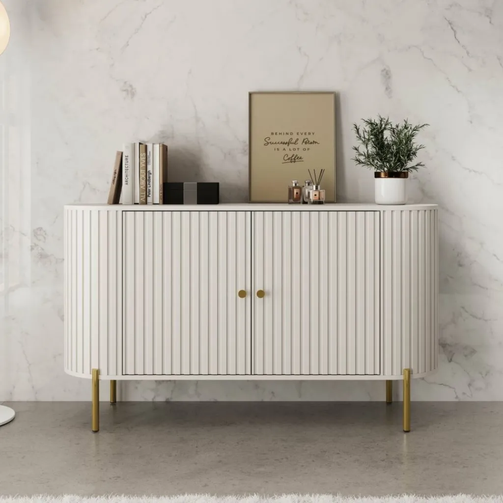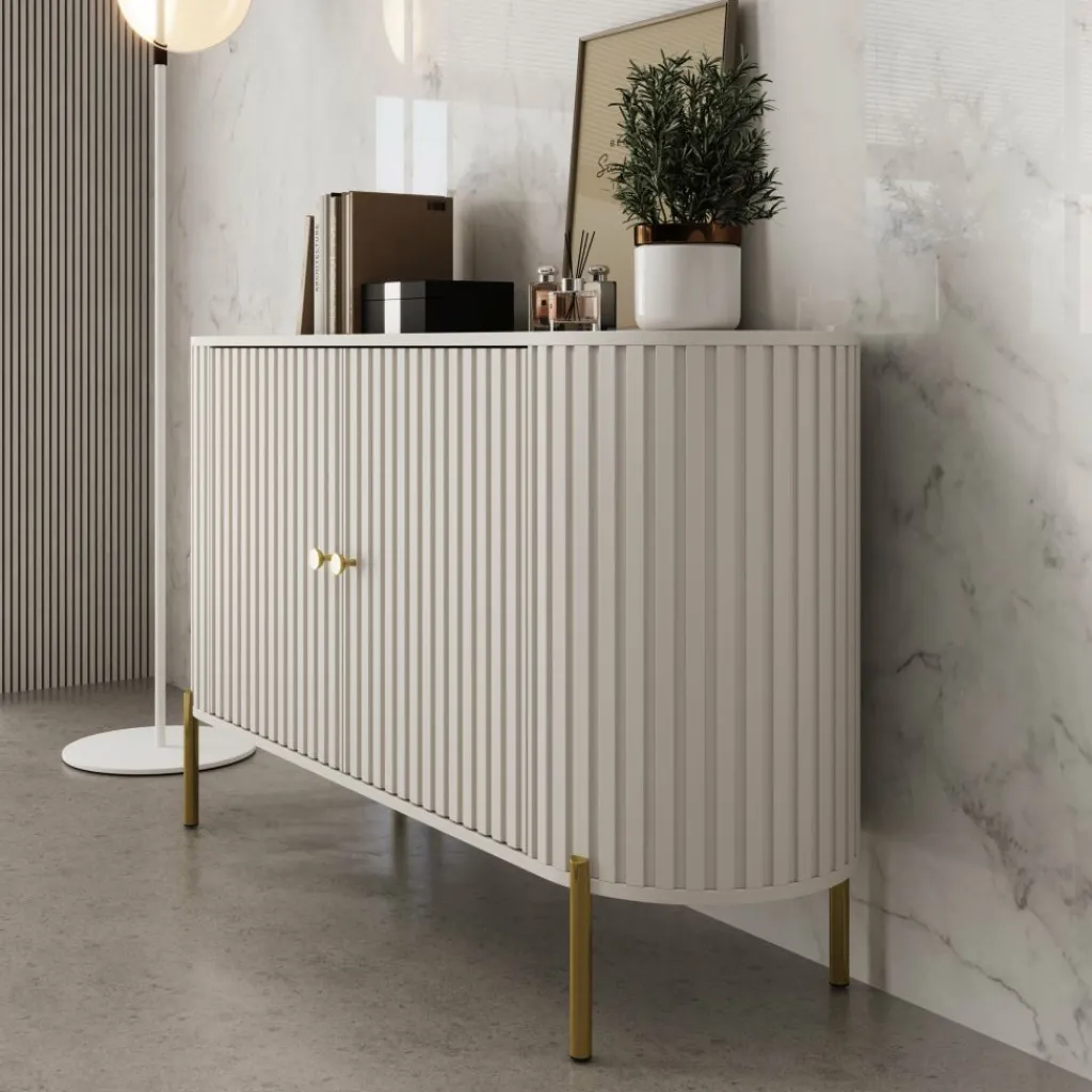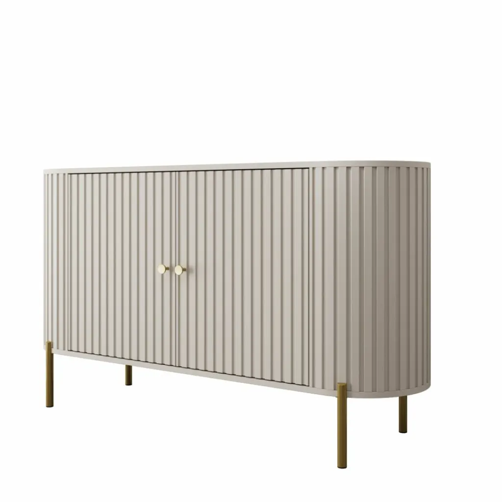 Het Sorenna dressoir in beige is een stijlvolle opberger met een luxe uitstraling. De verticale latstructuur aan de voorzijde geeft het meubel karakter, terwijl de slanke goudkleurige poten zorgen voor een moderne afwerking. Dankzij de twee draaideuren met ronde greep open je het dressoir eenvoudig en heb je direct toegang tot de ruime opbergvakken met tussenplank. Handig voor servies, glaswerk, papieren en andere items die je graag uit het zicht bewaart.