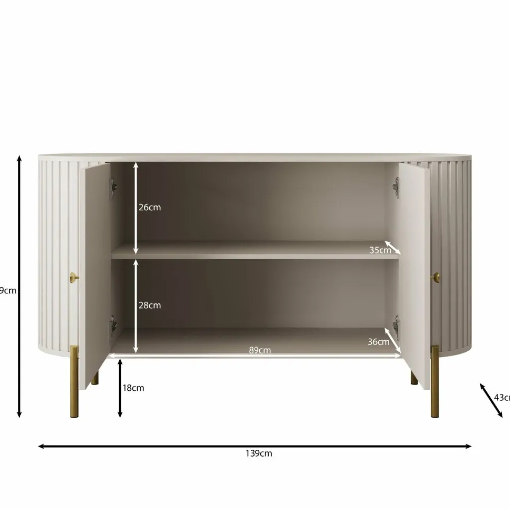 Met een breedte van 139 cm en een hoogte van 79 cm past dit dressoir goed in de woonkamer, eetkamer of hal. De zachte beige kleur maakt het gemakkelijk te combineren met verschillende woonstijlen, van modern tot elegant en hotel chic. Gebruik het bovenblad voor decoratie, boeken of geurkaarsen om je interieur compleet te maken.