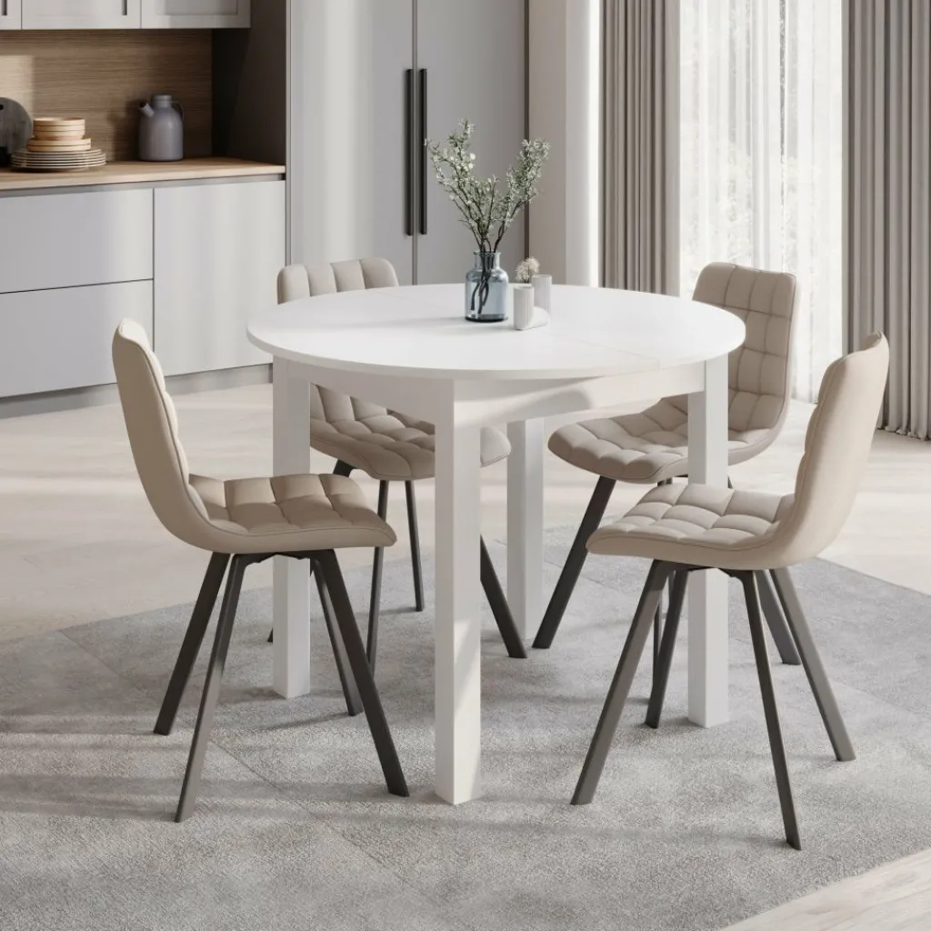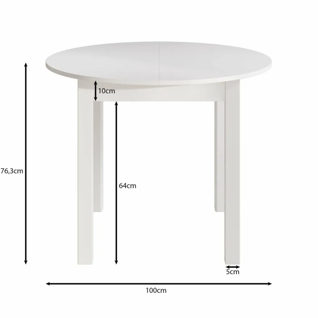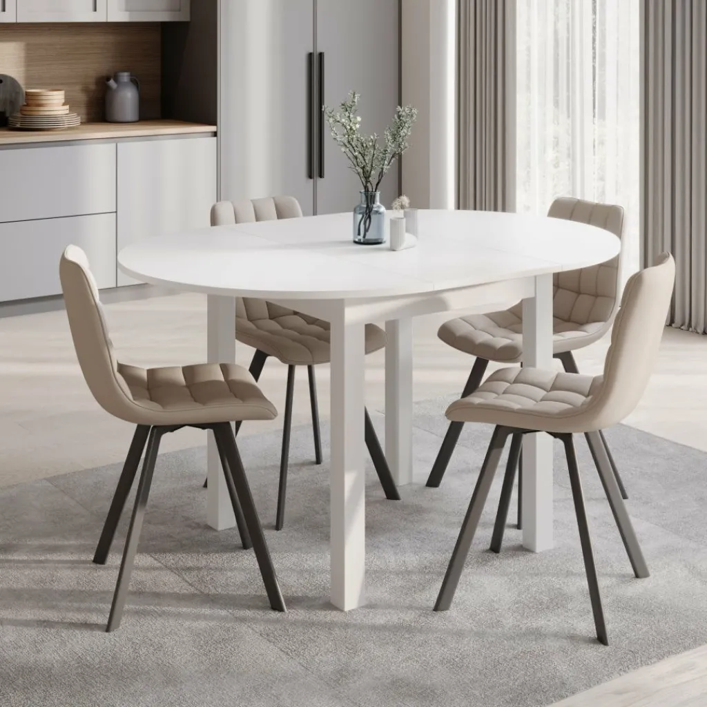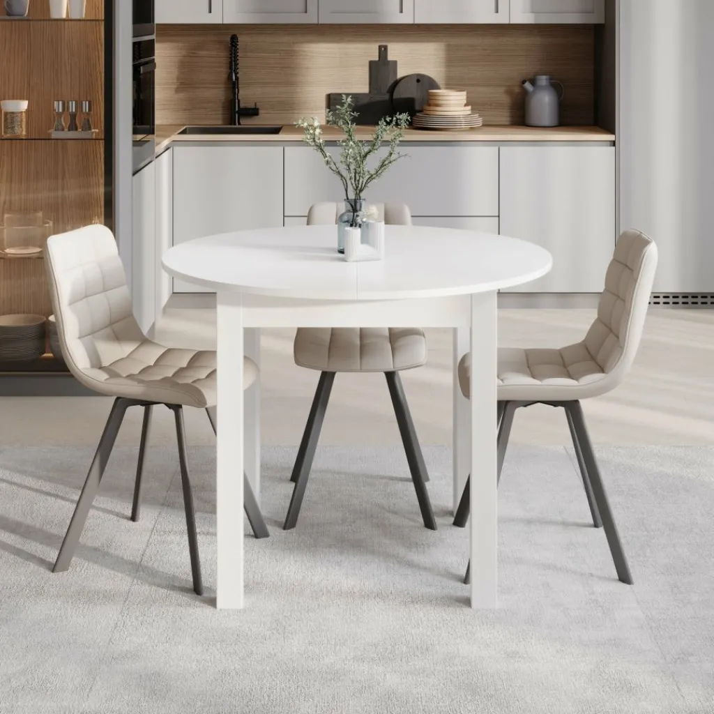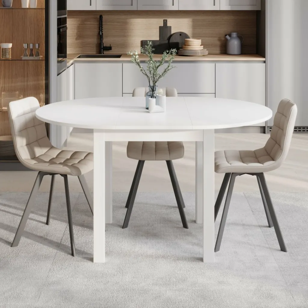 Deze eettafel is uitgevoerd in helder wit, wat zorgt voor een frisse uitstraling die moeiteloos aansluit bij uiteenlopende interieurs. Het stevige onderstel biedt stabiliteit, terwijl de uitschuifbare bladinzet het formaat van 100 cm naar een royale 140 cm brengt. Zo heb je altijd voldoende ruimte wanneer er gasten aanschuiven.