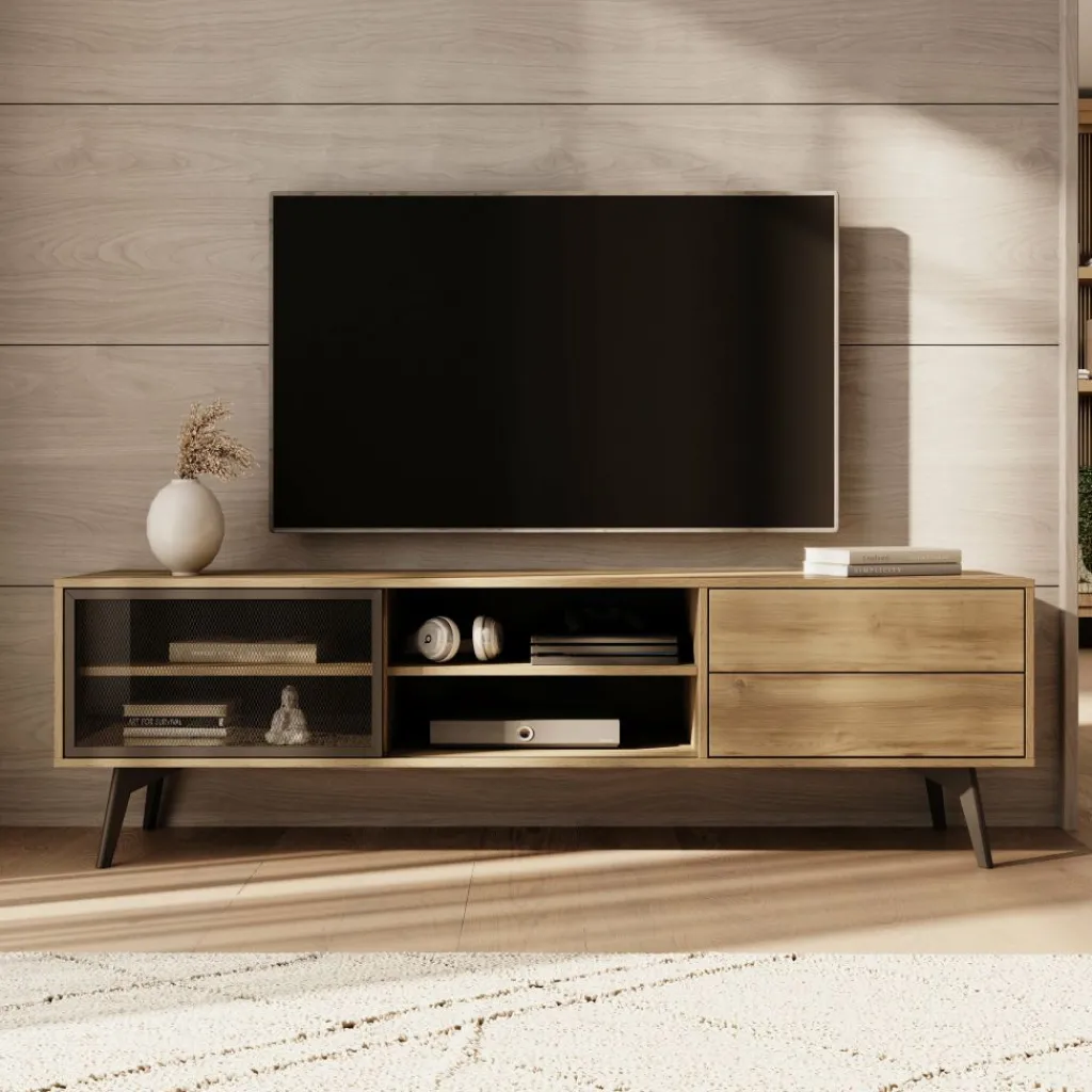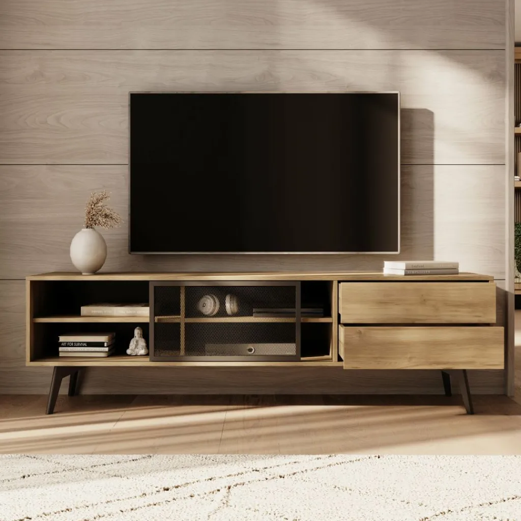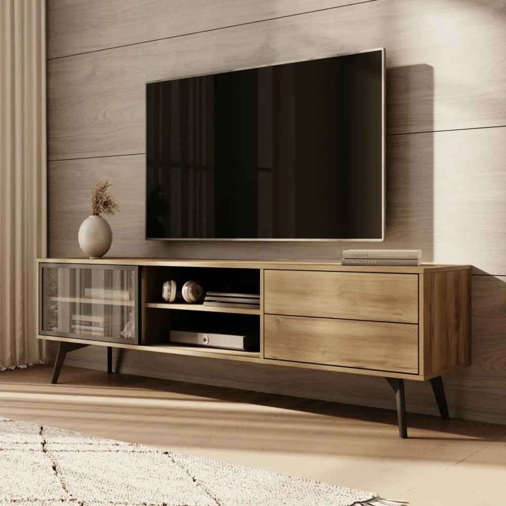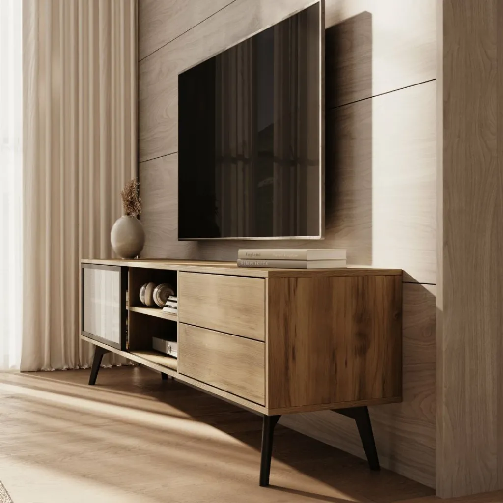 Het tv-meubel staat op hoge, zwarte pootjes.