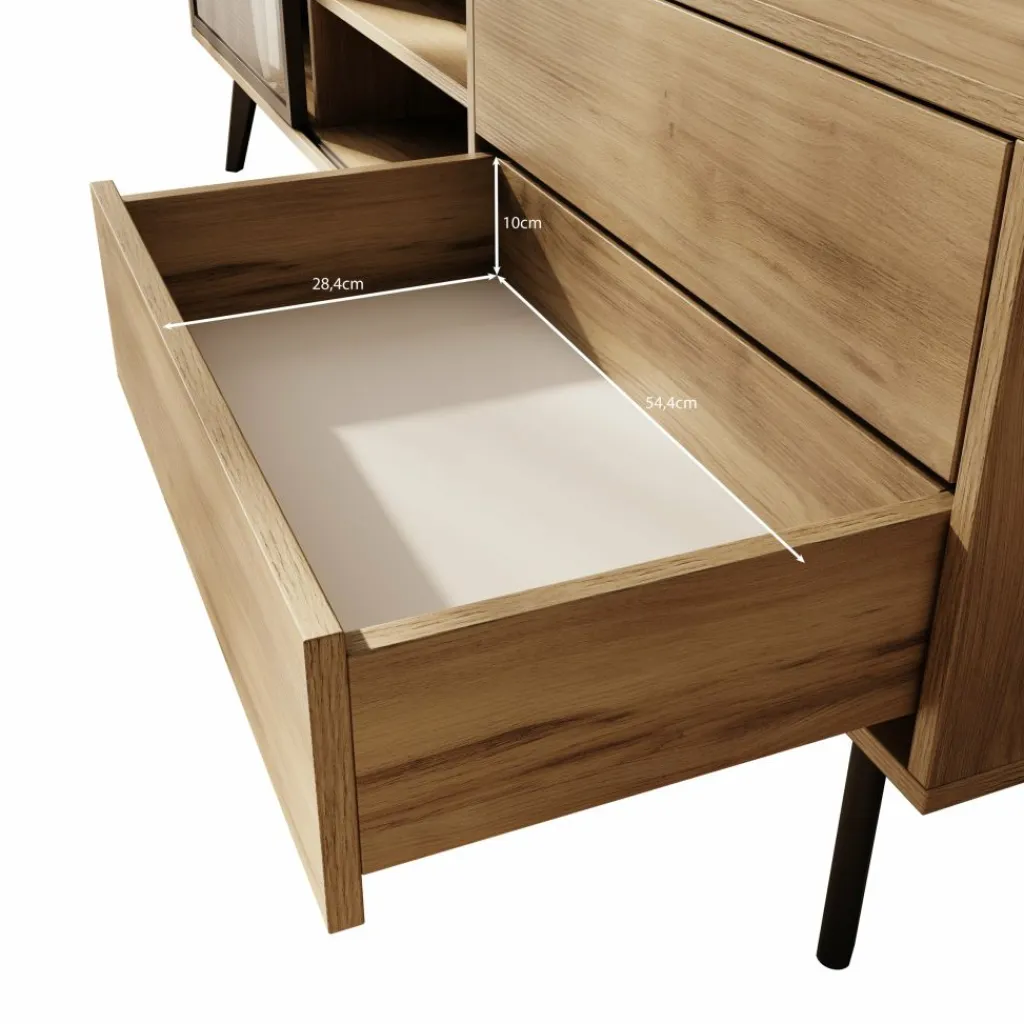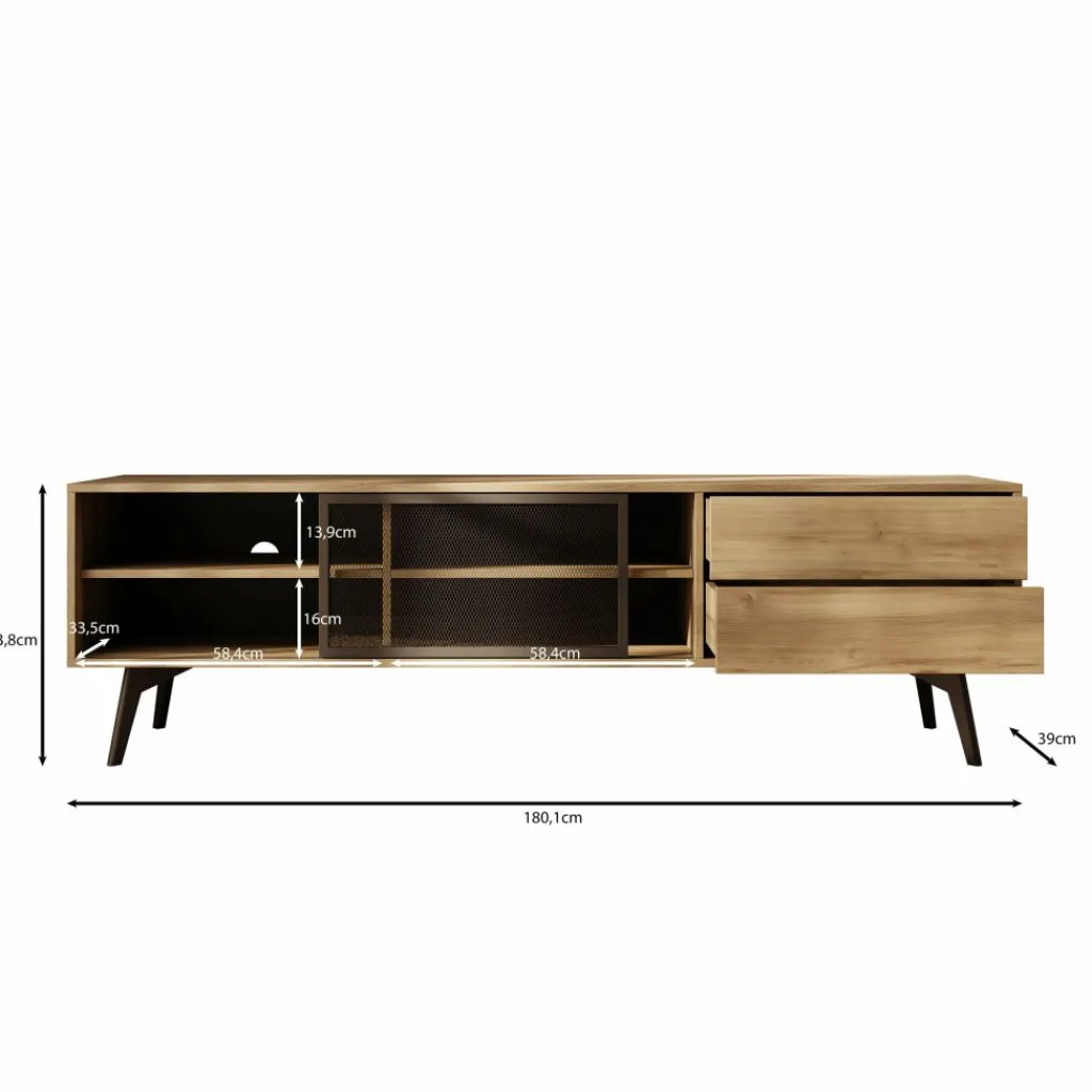 TV-meubel Spa is een opbergkast voor onder de tv in een moderne, industriële stijl. Het meubel is gemaakt van een stevige spaanplaat constructie met duurzaam FSC keurmerk in eiken kleur.