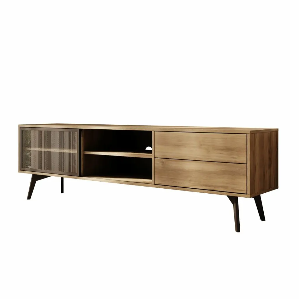 TV-Meubel Spa heeft 2 schuifdeuren met getint glas, met daarachter 4 opbergvakken. Daarnaast bevinden zich 2 greeploze push to open lades.
