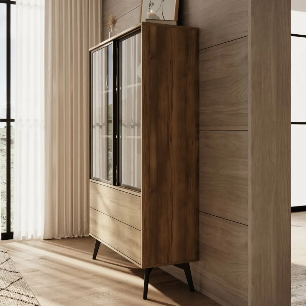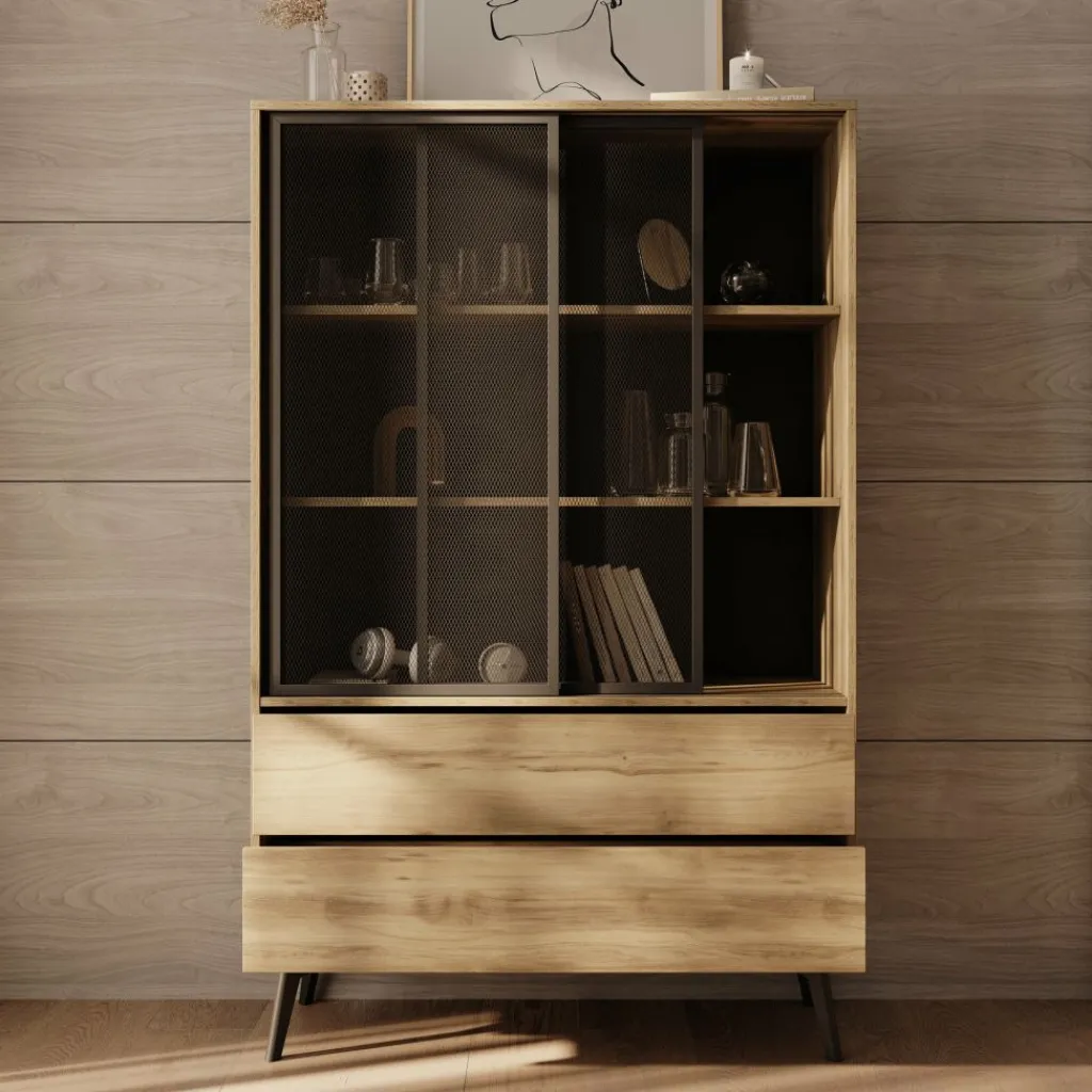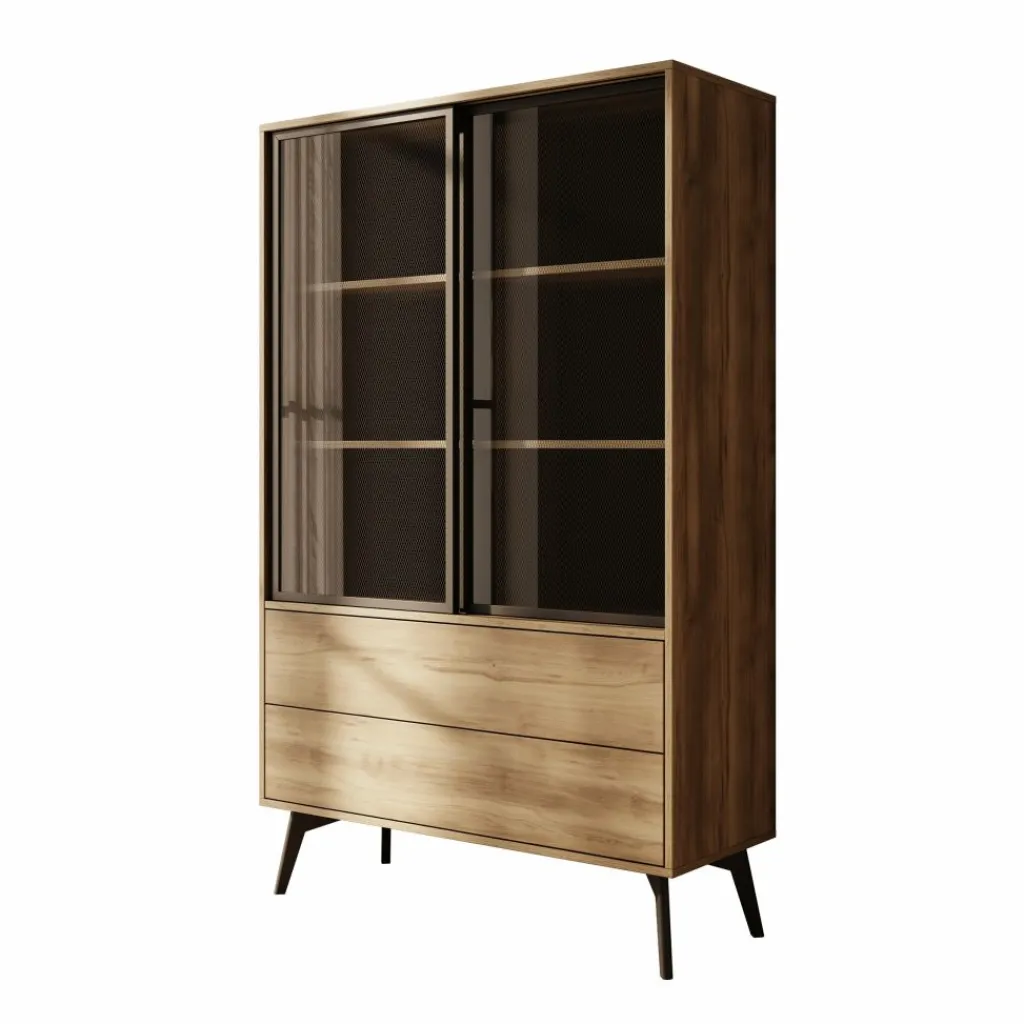 Vitrinekast Spa is een opbergkast in moderne, industriële stijl. De kast beschikt over 2 schuifdeuren met getint glas, met daarachter 2 legplanken. Daaronder bevinden zich 2 greeploze push-to-open lades. De Spa kast staat op zwarte, hoge pootjes.