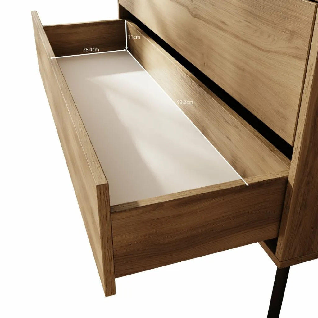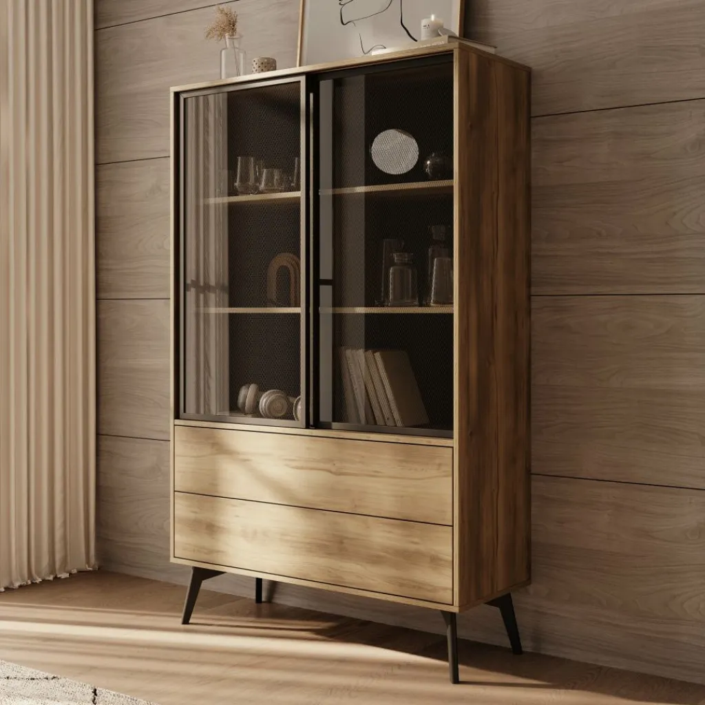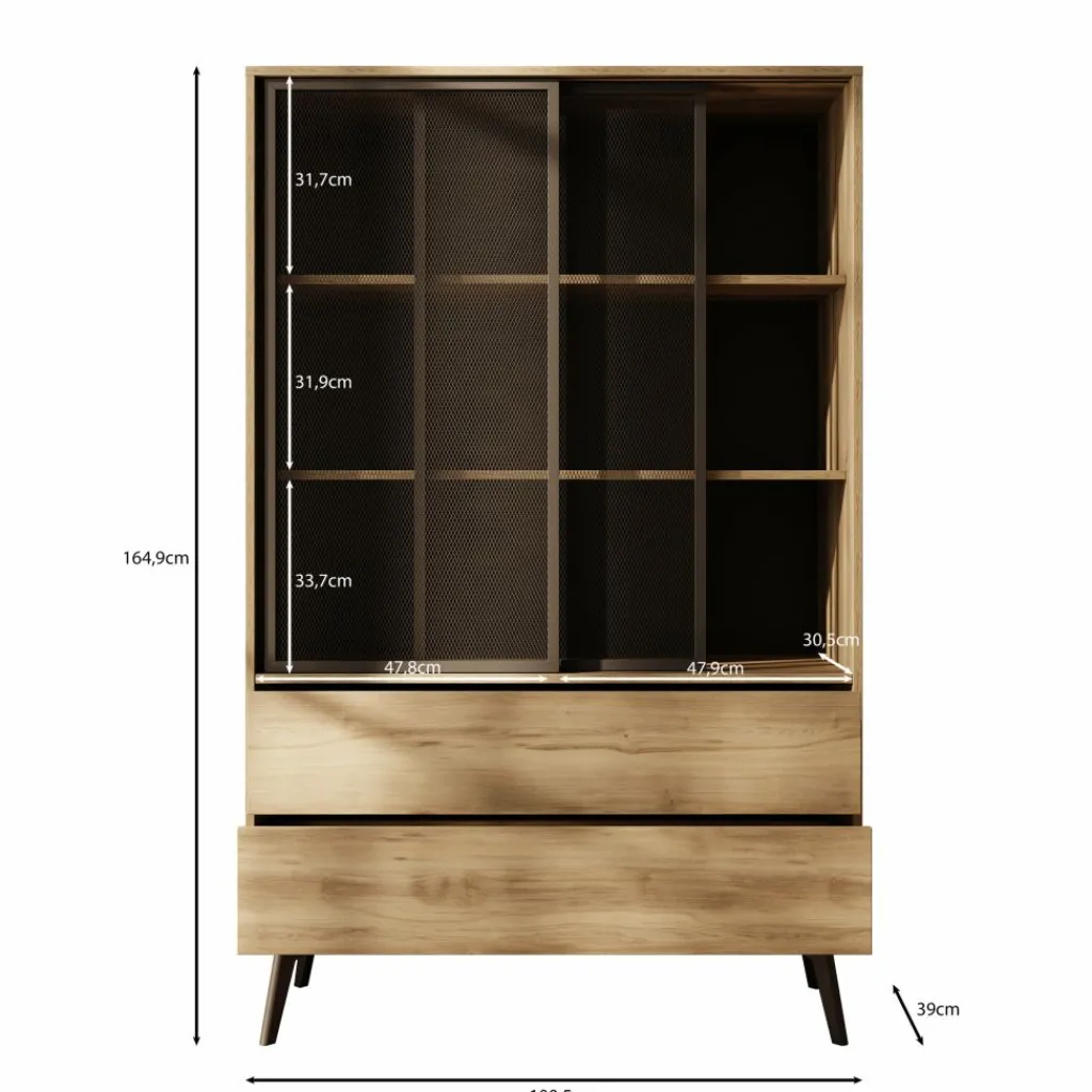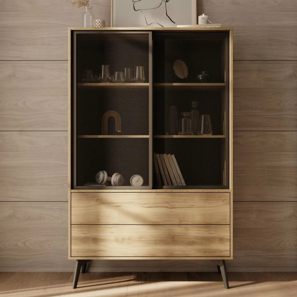 Vitrinekast Spa is een opbergkast in moderne, industriële stijl. De kast beschikt over 2 schuifdeuren met getint glas, met daarachter 2 legplanken. Daaronder bevinden zich 2 greeploze push-to-open lades. De Spa kast staat op zwarte, hoge pootjes.