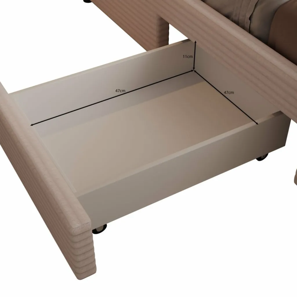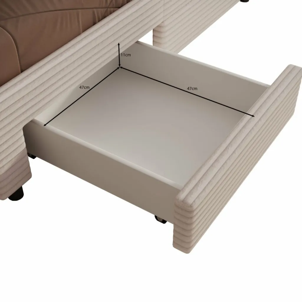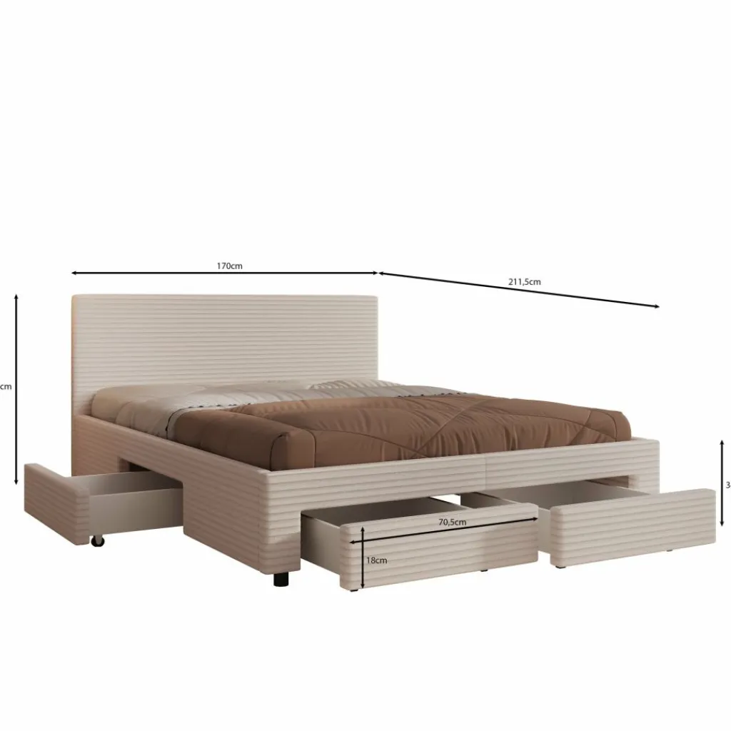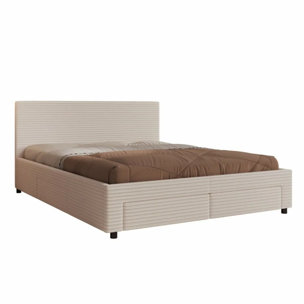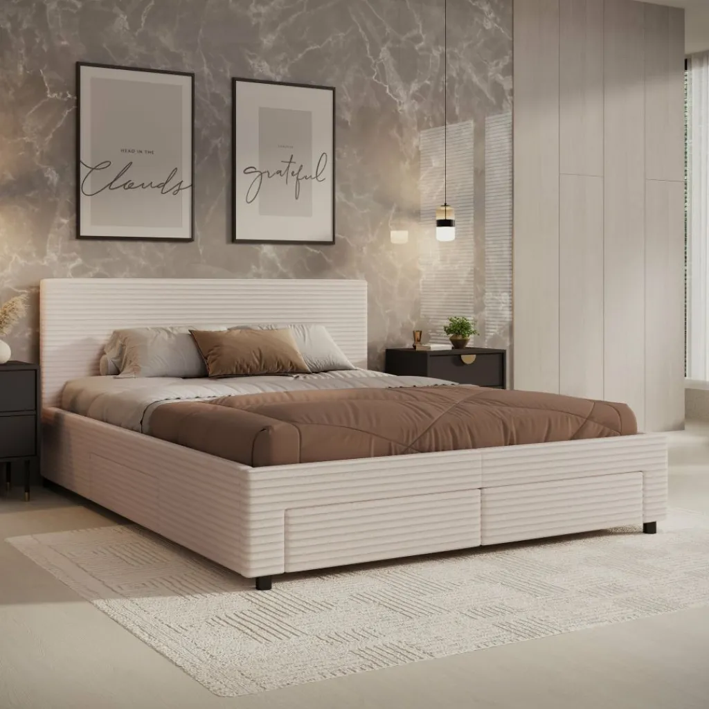 Het Suente bed van 160×200 cm biedt de perfecte balans tussen comfort en functionaliteit. Bekleed met zachte ribstof in een stijlvolle beige tint, zorgt dit bed voor een moderne en sfeervolle uitstraling in de slaapkamer. Onder het bed bevinden zich 4 ruime lades waarin je eenvoudig beddengoed, kussens of accessoires opbergt. Dankzij het formaat is dit bed uitermate geschikt voor stellen die van een wat compacter tweepersoonsbed houden.
