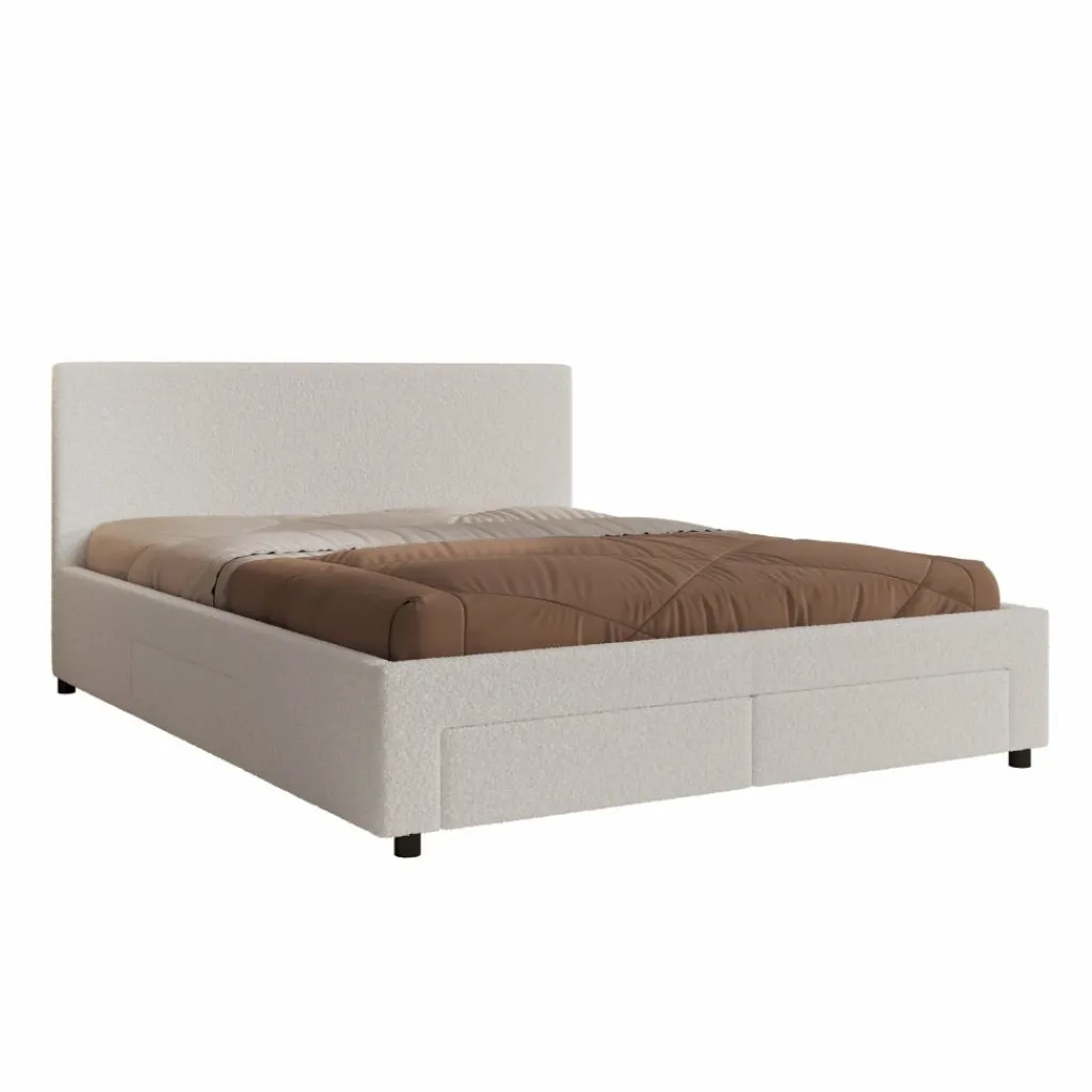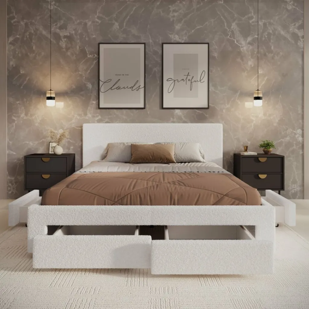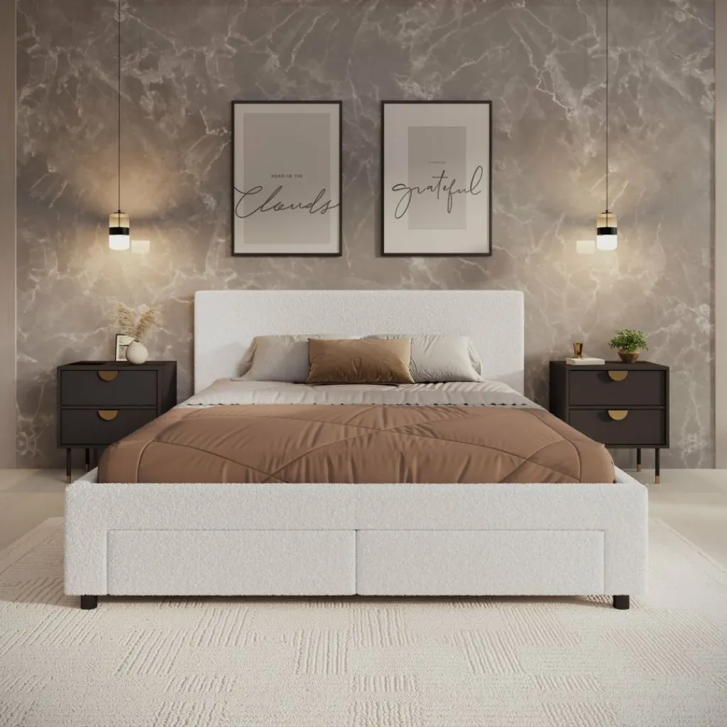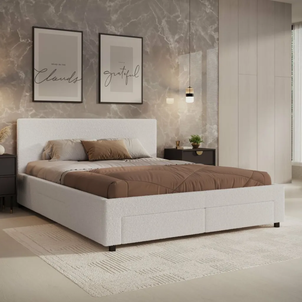 Het Suente tweepersoonsbed van 160×200 cm combineert comfort, luxe en slimme opbergruimte. Met zijn zachte witte teddystof en strakke vormgeving brengt dit bed een warme en moderne sfeer in elke slaapkamer. Het subtiel afgewerkte hoofdbord met verticale stiksels zorgt voor een stijlvolle uitstraling.