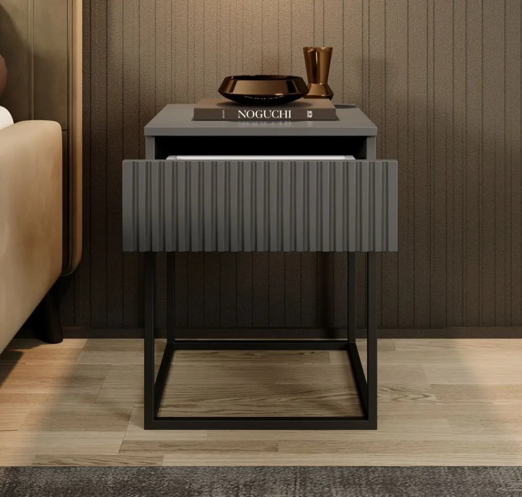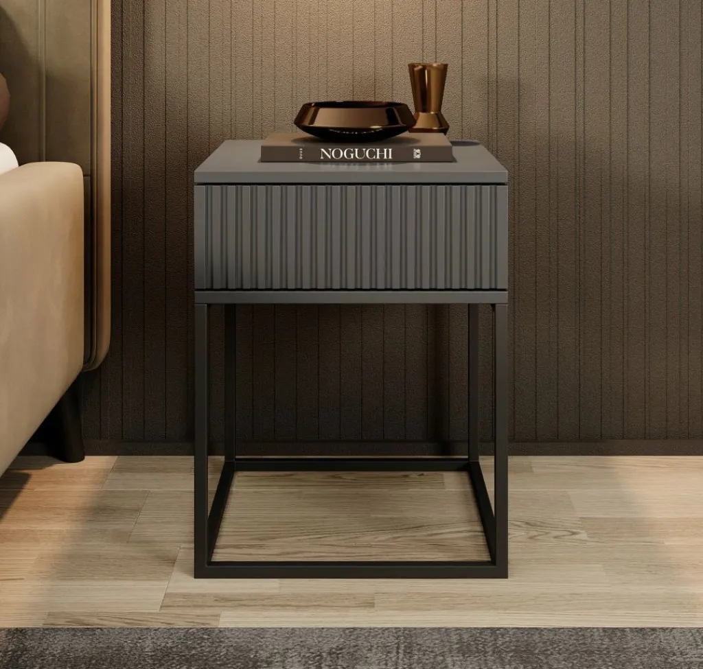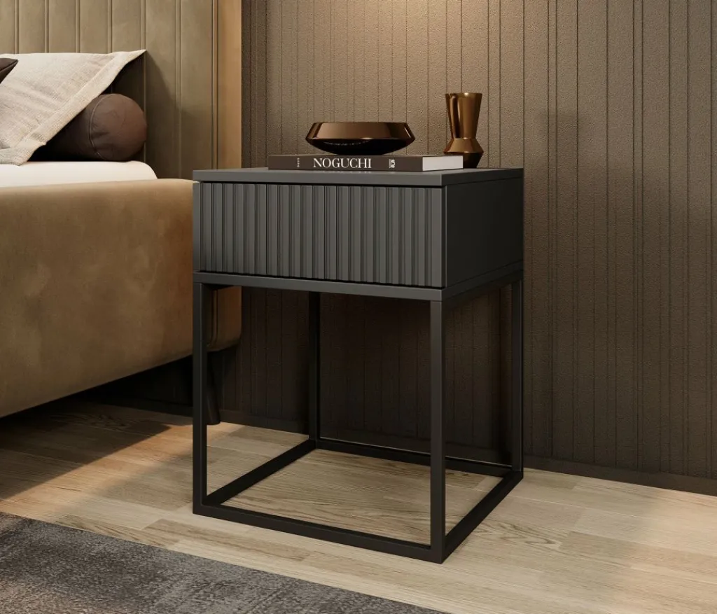 Nachtkastje Sylvester is een opbergkastje voor naast het bed. De Sylvester beschikt over 1 lade die opent met het push to open systeem. De voorkant van de lade heeft een lattenpatroon. Het nachtkastje staat op een zwart onderstel dat gemaakt is van metaal.