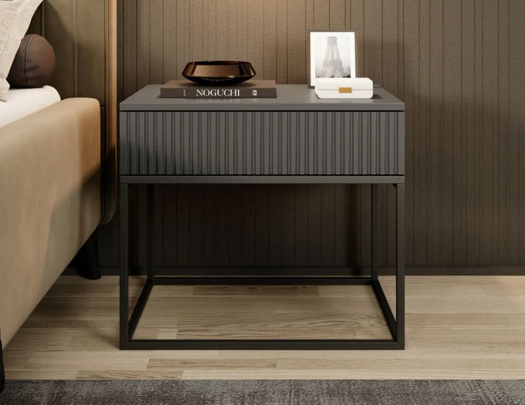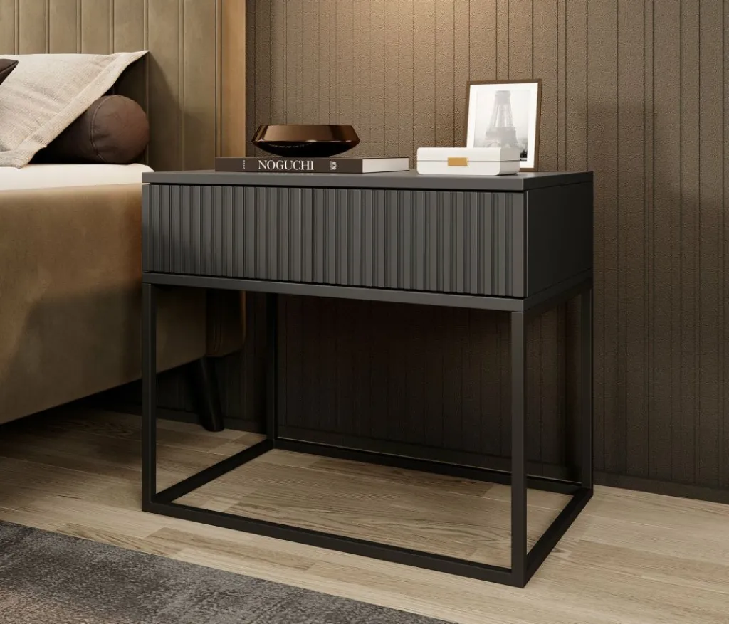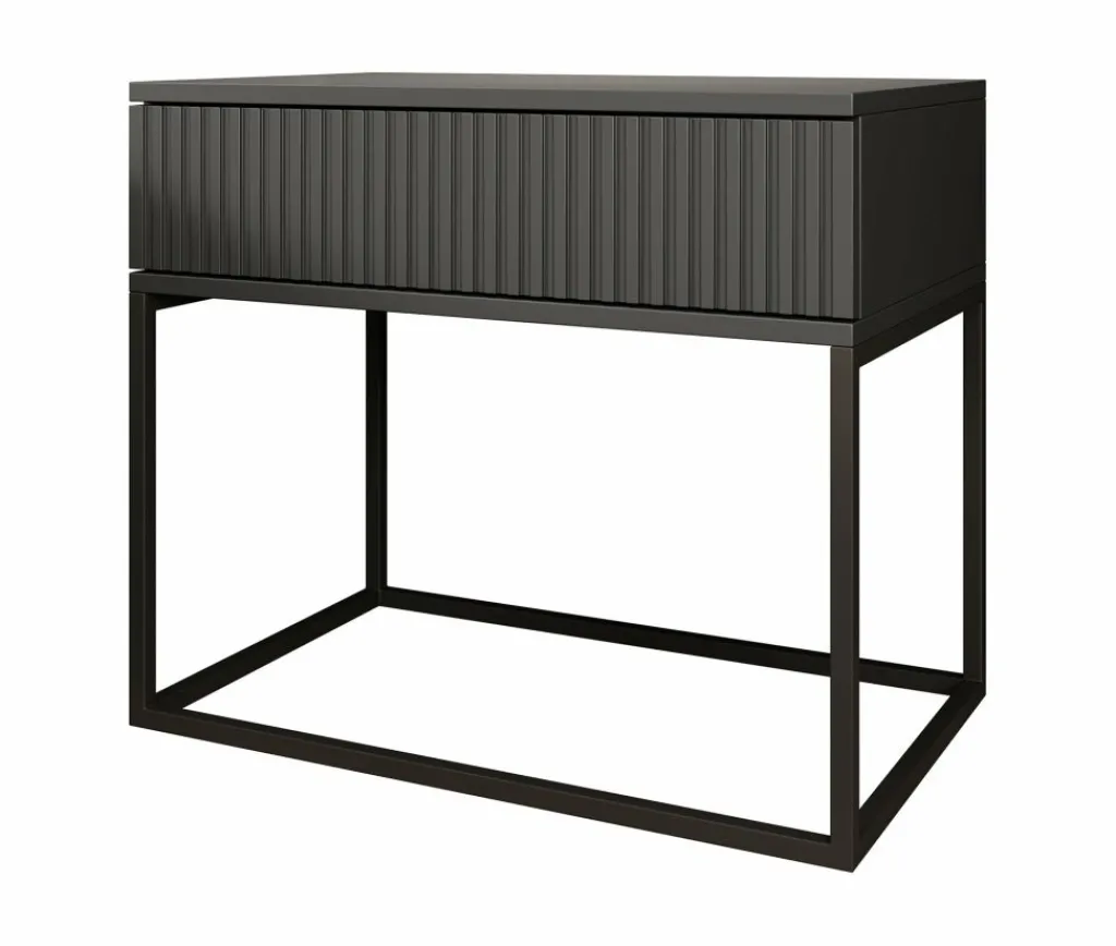 Nachtkastje Sylvester is een opbergkastje voor naast het bed. De Sylvester beschikt over 1 lade die opent met het push to open systeem. De voorkant van de lade heeft een lattenpatroon. Het nachtkastje staat op een zwart onderstel dat gemaakt is van metaal.