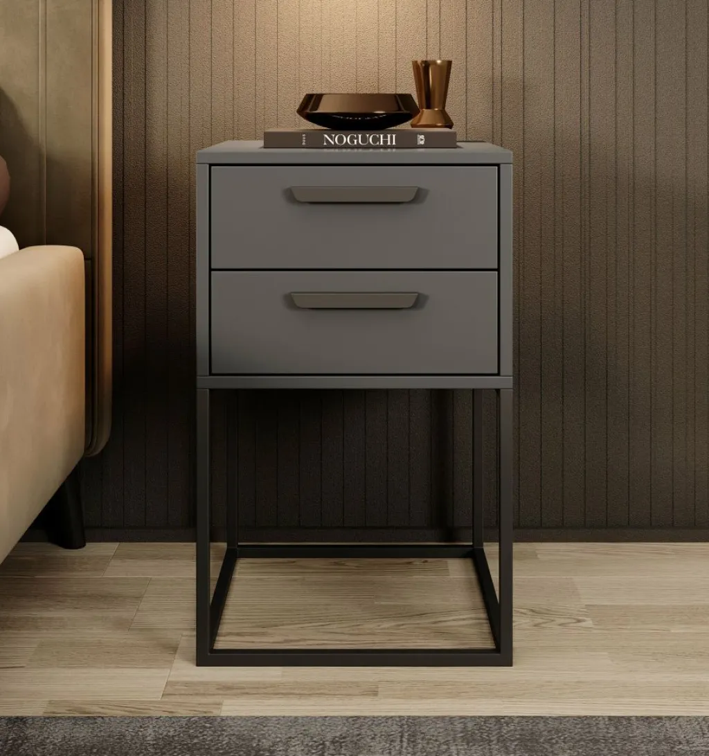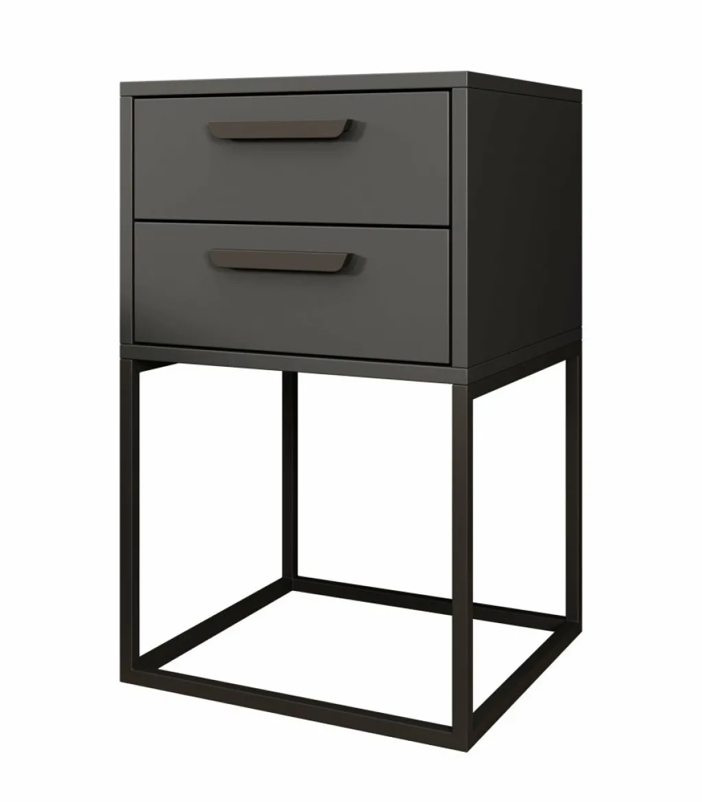 Nachtkastje Sylvester is een opbergkastje voor naast het bed. De Sylvester beschikt over 2 lades die openen met zwarte handgrepen. Het nachtkastje staat op een zwart onderstel dat gemaakt is van metaal.