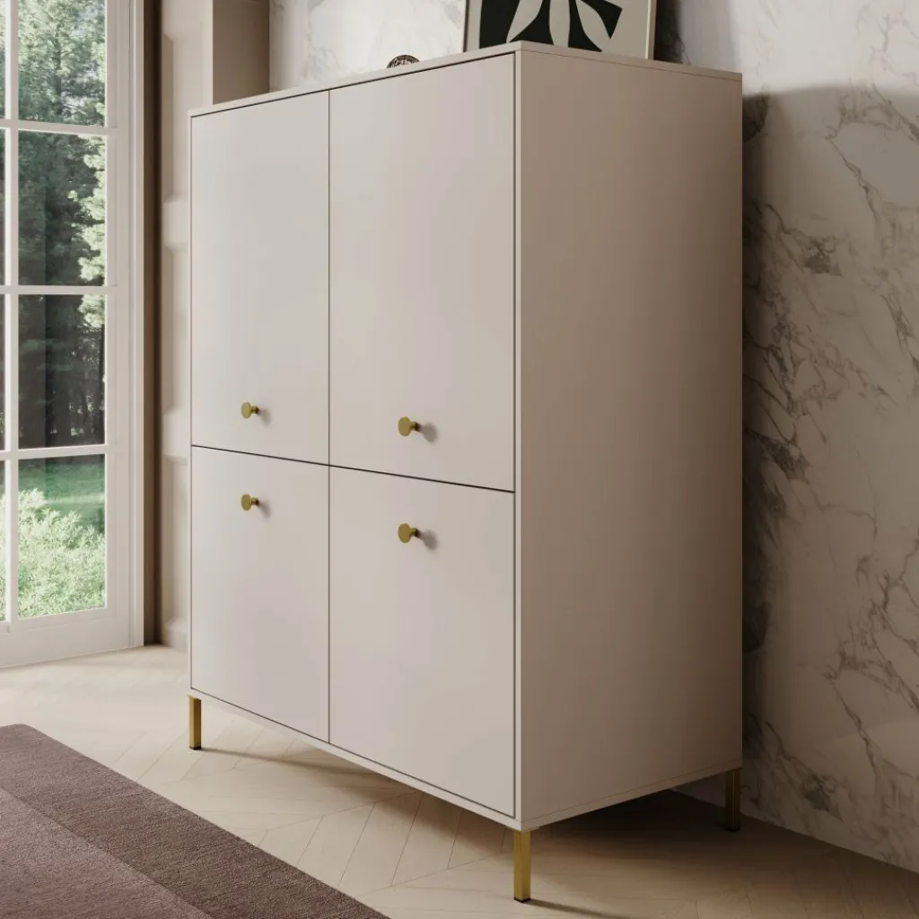 Het dressoir is uitgevoerd met vier deuren, elk voorzien van een ronde goudkleurige knop. Achter de deuren bevindt zich een indeling met meerdere vaste legplanken, waardoor er in totaal acht vakken ontstaan. Deze indeling maakt het eenvoudig om servies, woonaccessoires, administratie of andere spullen overzichtelijk op te bergen.