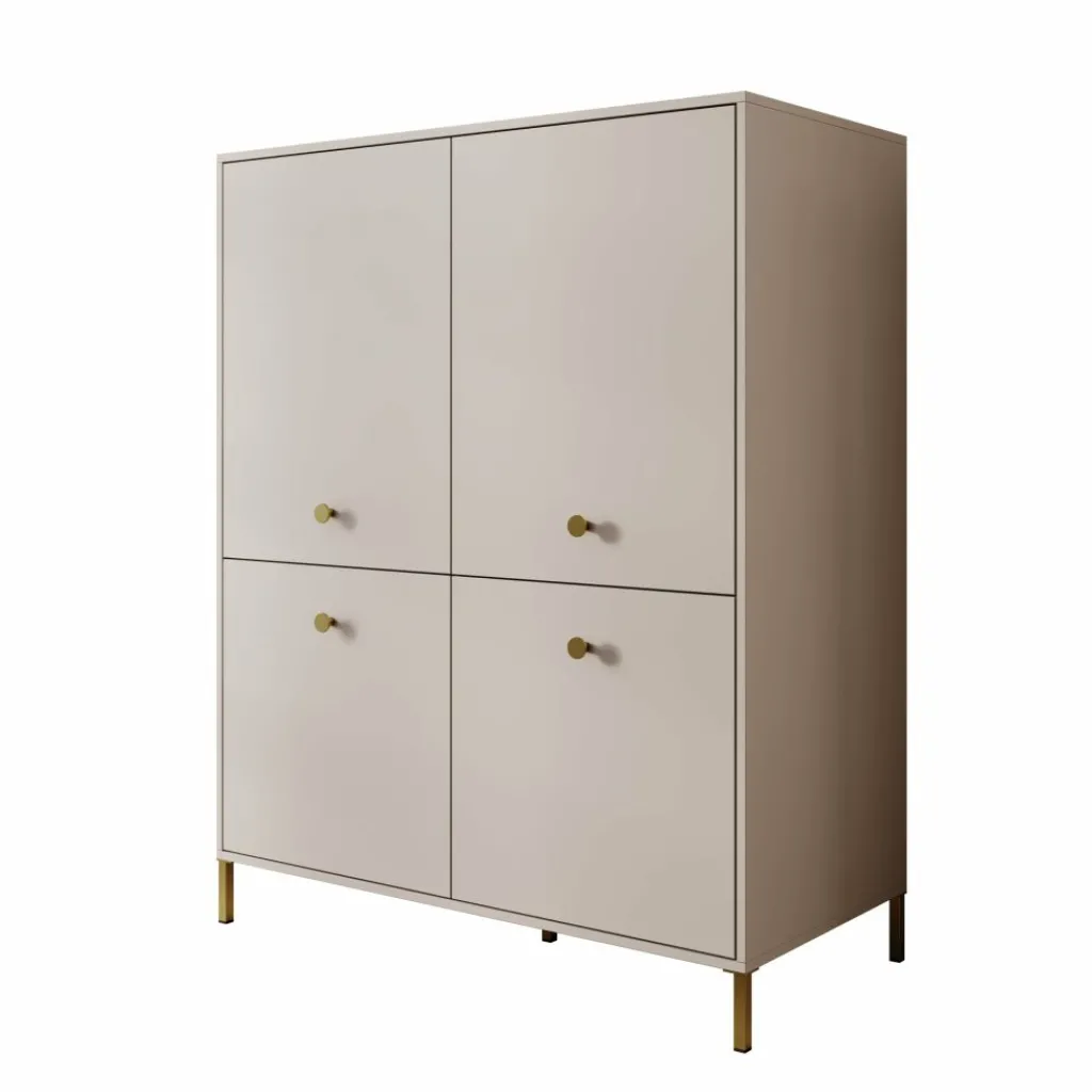 Syran staat op slanke metalen poten in goudkleur, wat zorgt voor een stabiele plaatsing en ruimte onder het meubel. De beige afwerking in combinatie met de metalen accenten sluit goed aan bij andere meubels uit de Syran serie en maakt het dressoir makkelijk te combineren binnen verschillende interieurs.