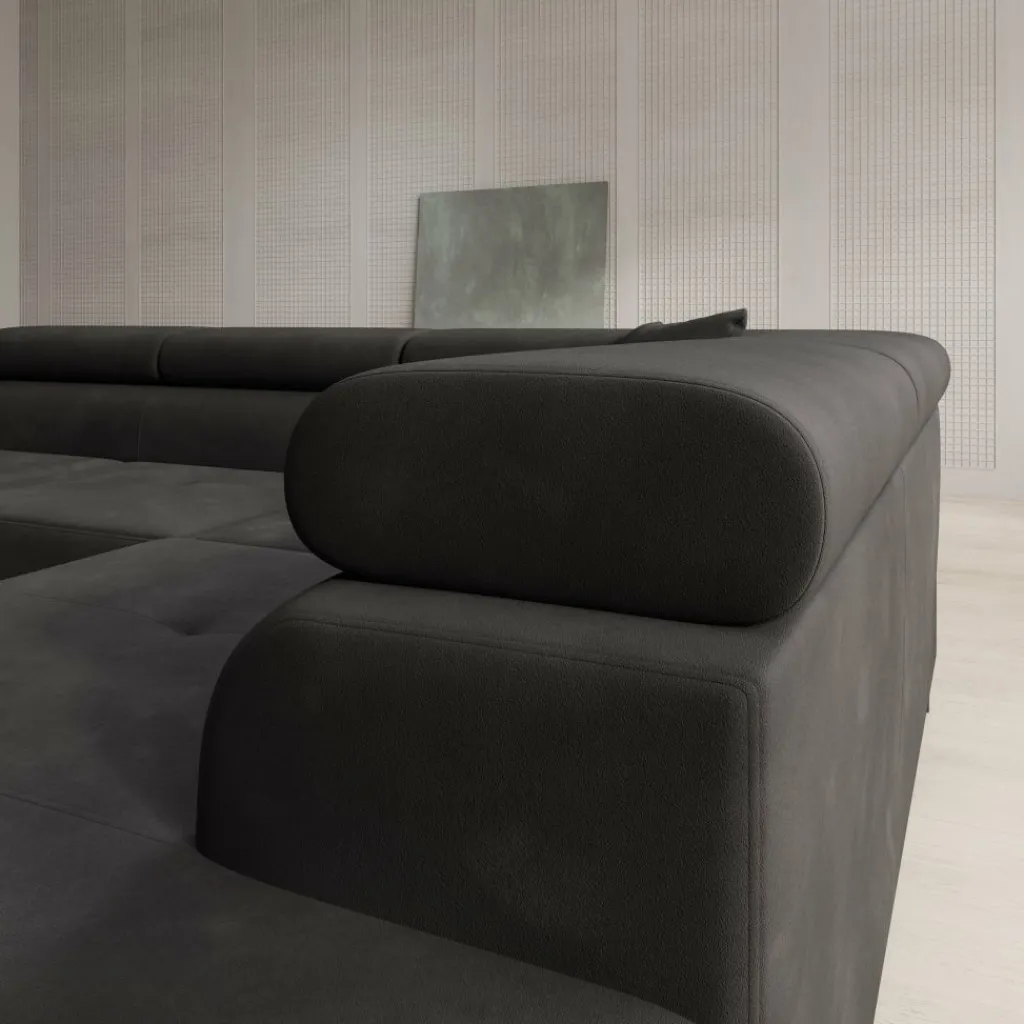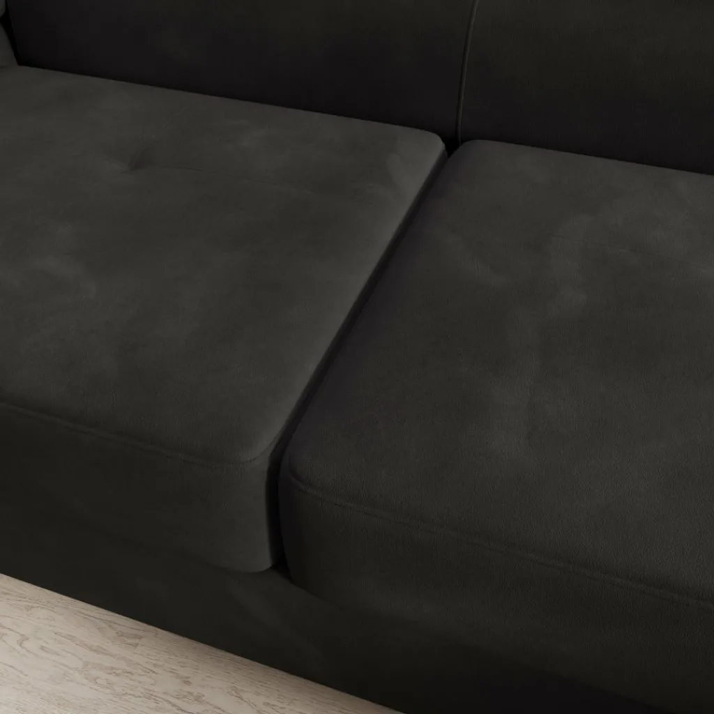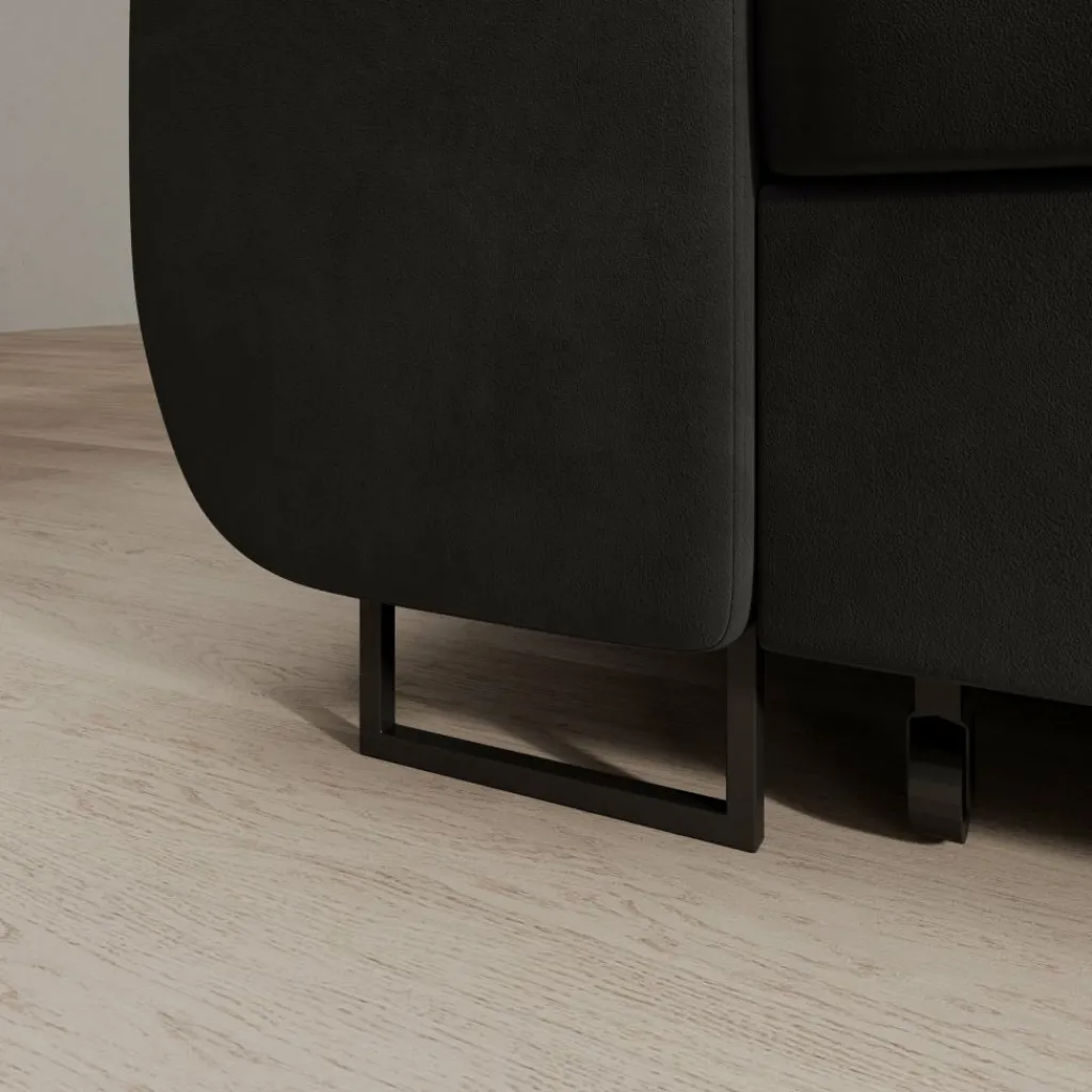 De bekleding is uitgevoerd in zwart velvet en heeft een egale, diepe kleur met een subtiele glans. De brede zitkussens en lage ruglijn vormen één strak geheel. De verstelbare hoofdsteunen maken het mogelijk om de rughoogte per zitplaats aan te passen. De chaise longue biedt extra ligruimte en maakt ontspannen zitten of languit liggen mogelijk.