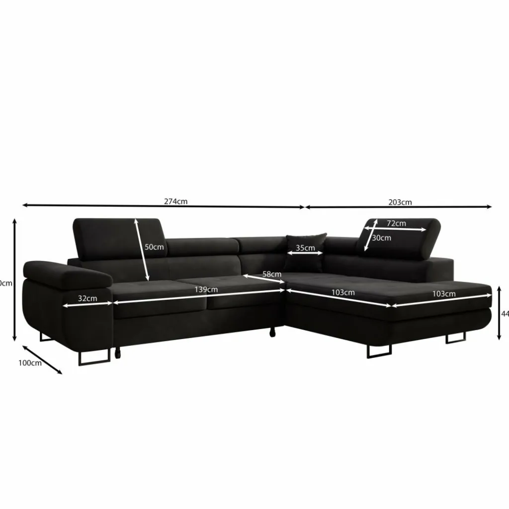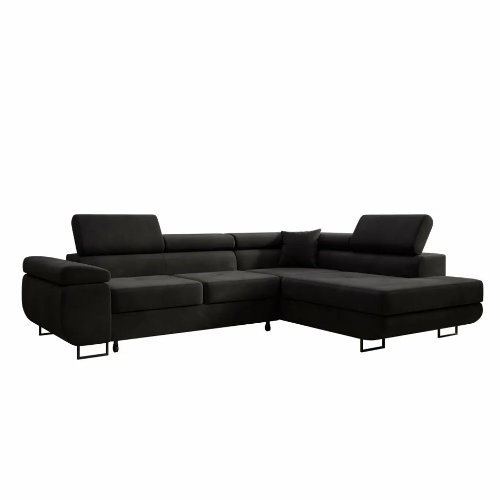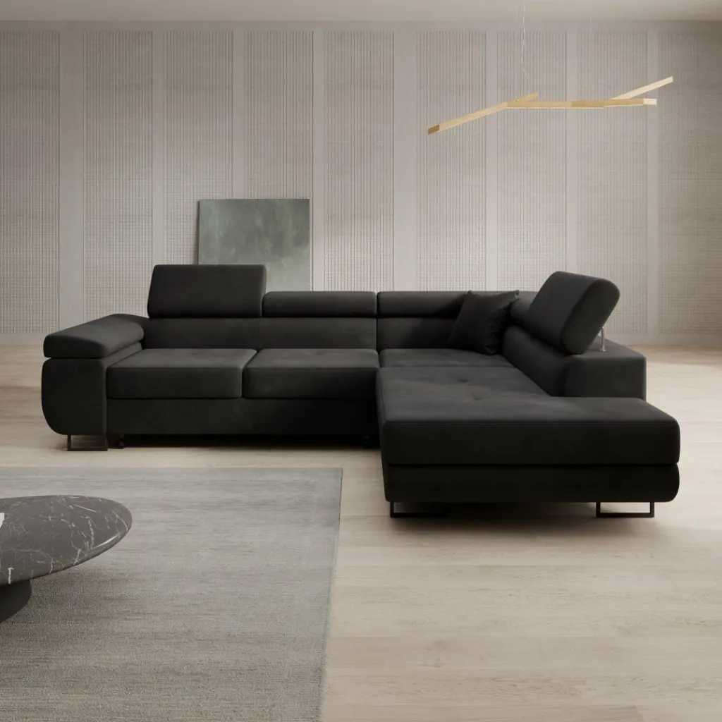 De bekleding is uitgevoerd in zwart velvet en heeft een egale, diepe kleur met een subtiele glans. De brede zitkussens en lage ruglijn vormen één strak geheel. De verstelbare hoofdsteunen maken het mogelijk om de rughoogte per zitplaats aan te passen. De chaise longue biedt extra ligruimte en maakt ontspannen zitten of languit liggen mogelijk.
