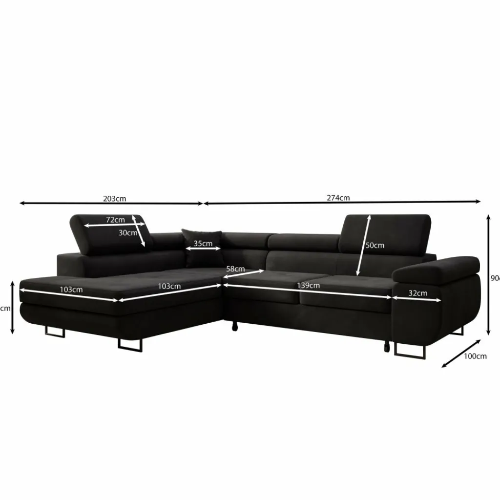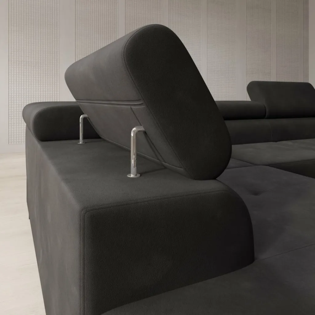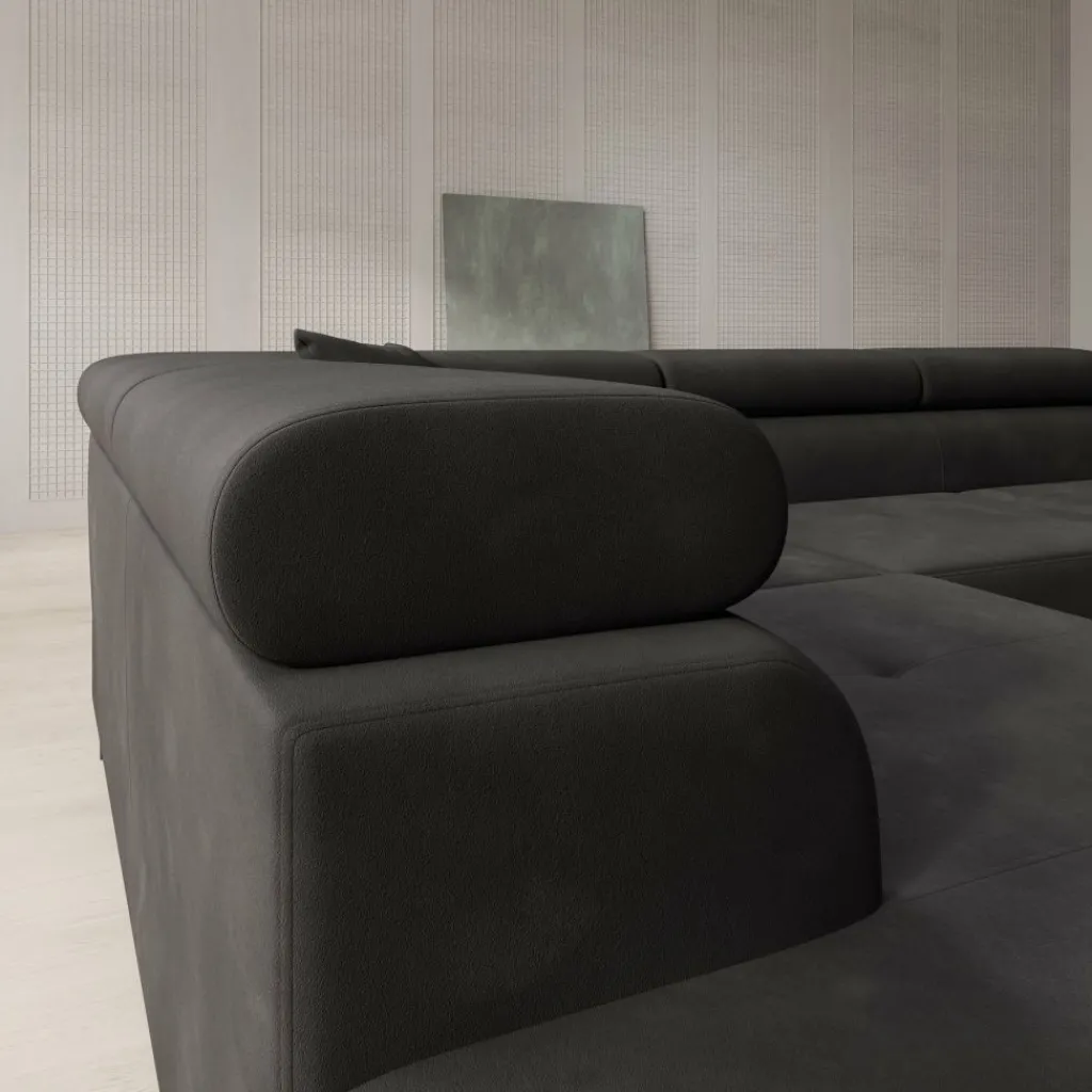 De bekleding is uitgevoerd in zwart velvet, wat zorgt voor een egale, diepe kleur met een subtiele glans. De brede zitkussens en lage ruglijn geven de bank een strak geheel. De verstelbare hoofdsteunen maken het mogelijk om de rughoogte aan te passen per zitplaats. De chaise longue biedt extra ligruimte en maakt ontspannen zitten of languit liggen mogelijk.