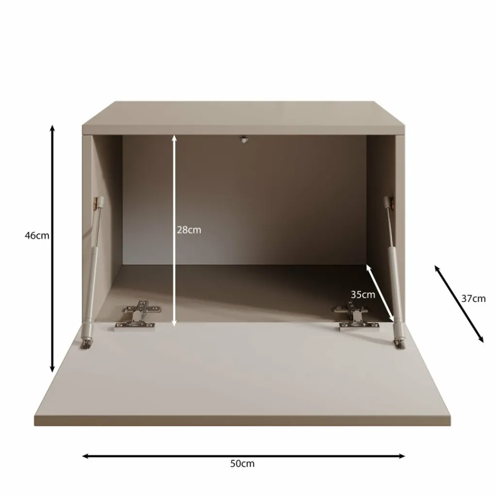 Het Tactica nachtkastje in beige heeft een strak ontwerp met een klepdeur die is afgewerkt met een horizontaal golvend reliëf. Dankzij het formaat van 50×37 cm en de hoogte van 46 cm past het kastje goed naast de meeste bedden. Achter de klep bevindt zich een ruime opbergruimte voor boeken, opladers of andere items die je binnen handbereik wilt houden.