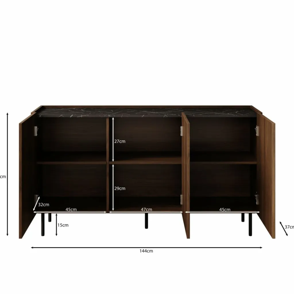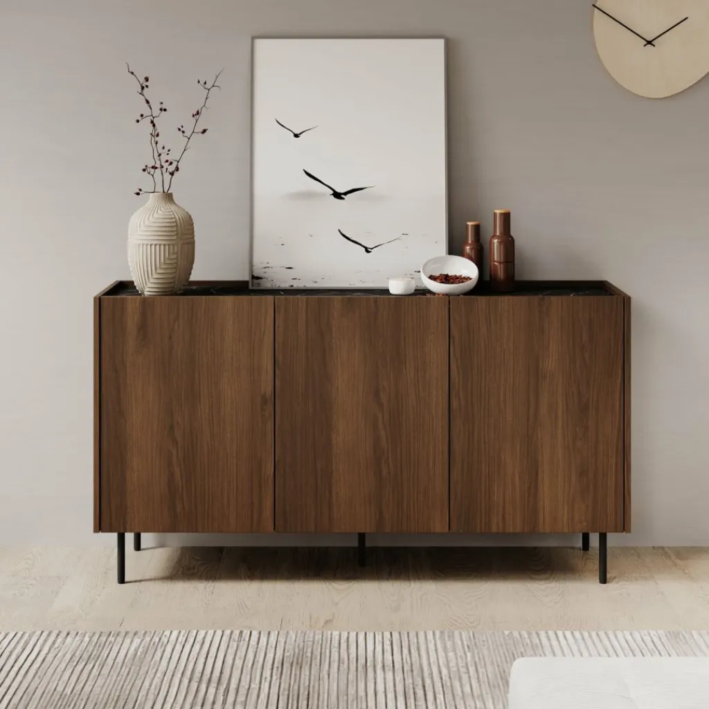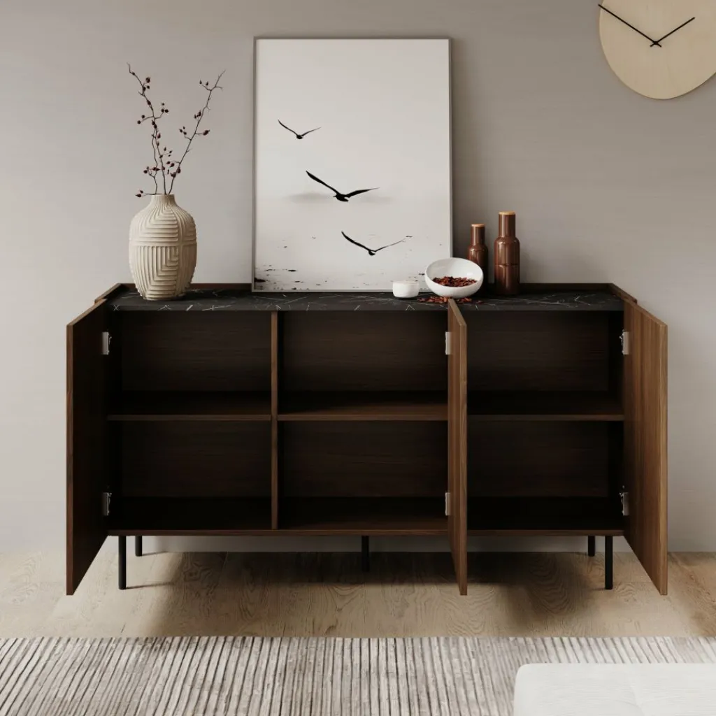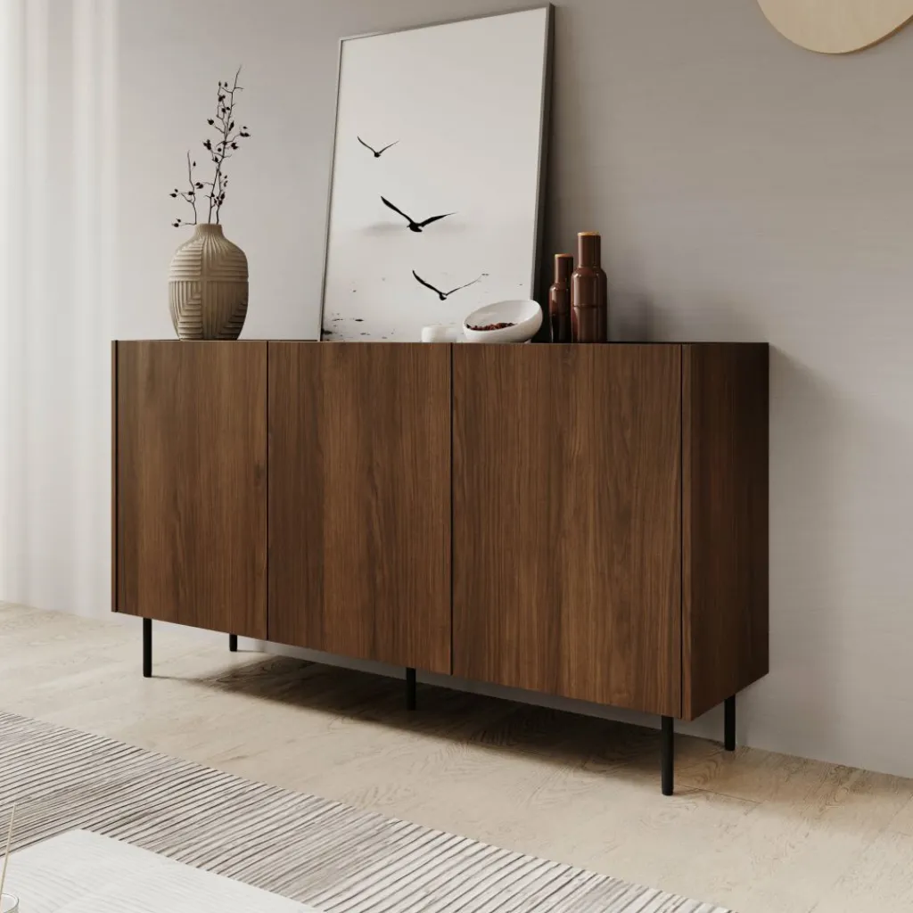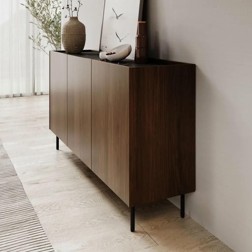 De Tahiti dressoir in donker eikenlook heeft een strak ontwerp met een warme houtlook afwerking. De rechte lijnen en het rustige front zorgen voor een moderne en verzorgde uitstraling in je interieur.