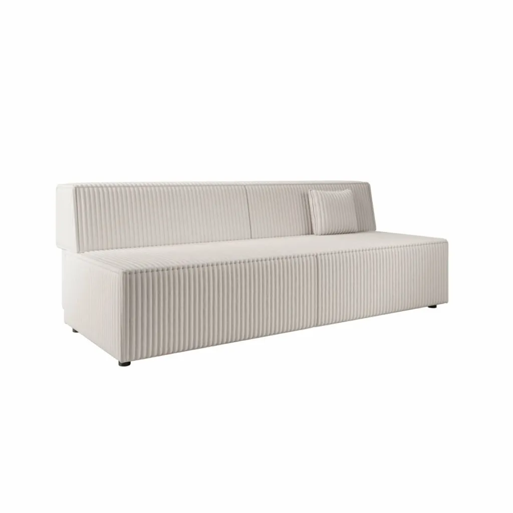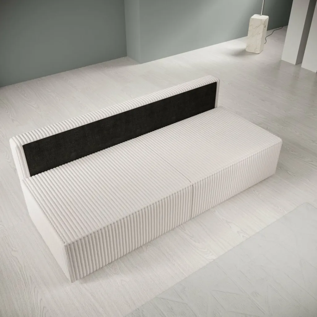 Tarella slaapbank is een compacte 3-zitsbank uitgevoerd in een beige fluffy teddystof en heeft een afmeting van 202x94x74 cm. Het ontwerp is recht en strak, met een doorlopende ribstructuur die zichtbaar is op zowel de zitting als de rugleuning.