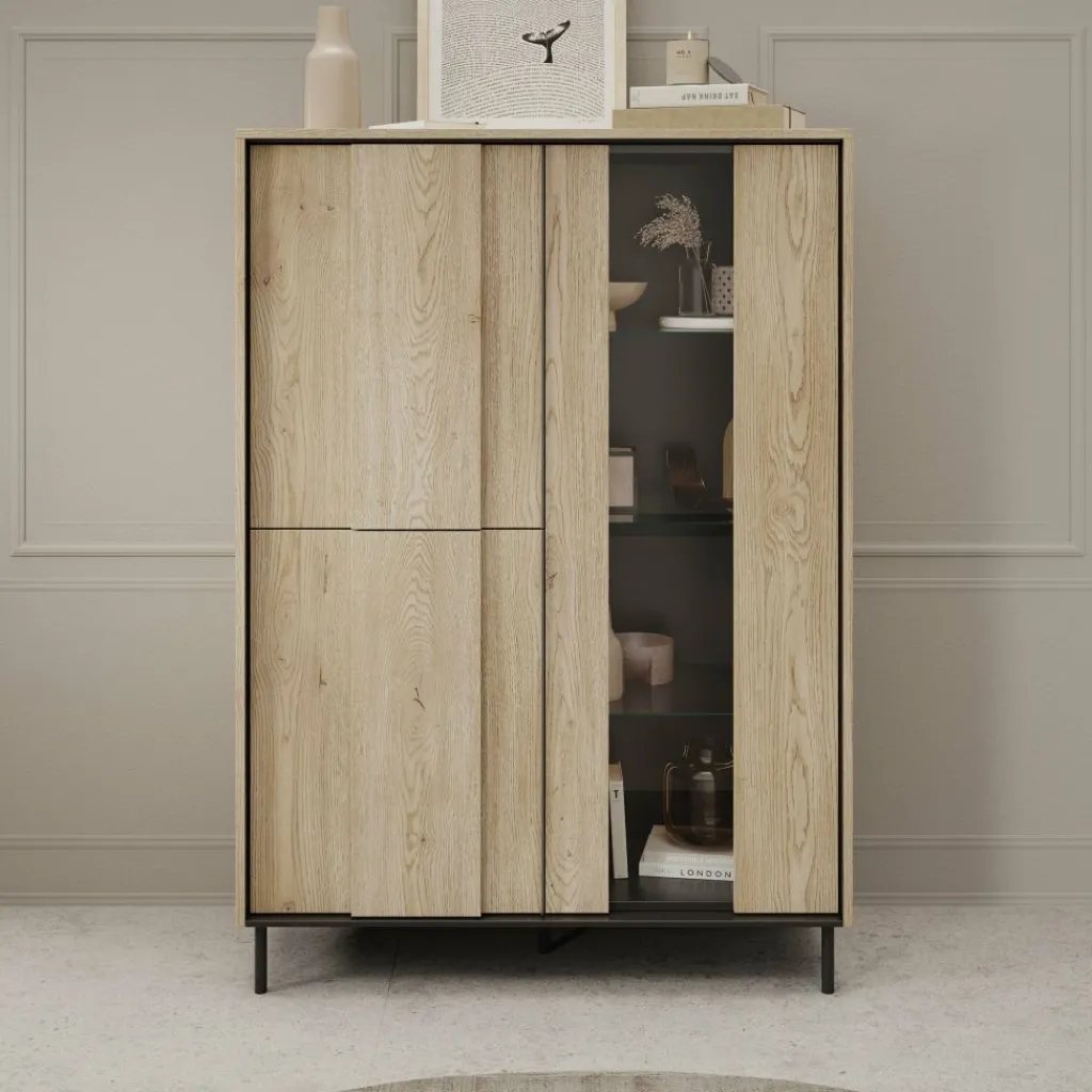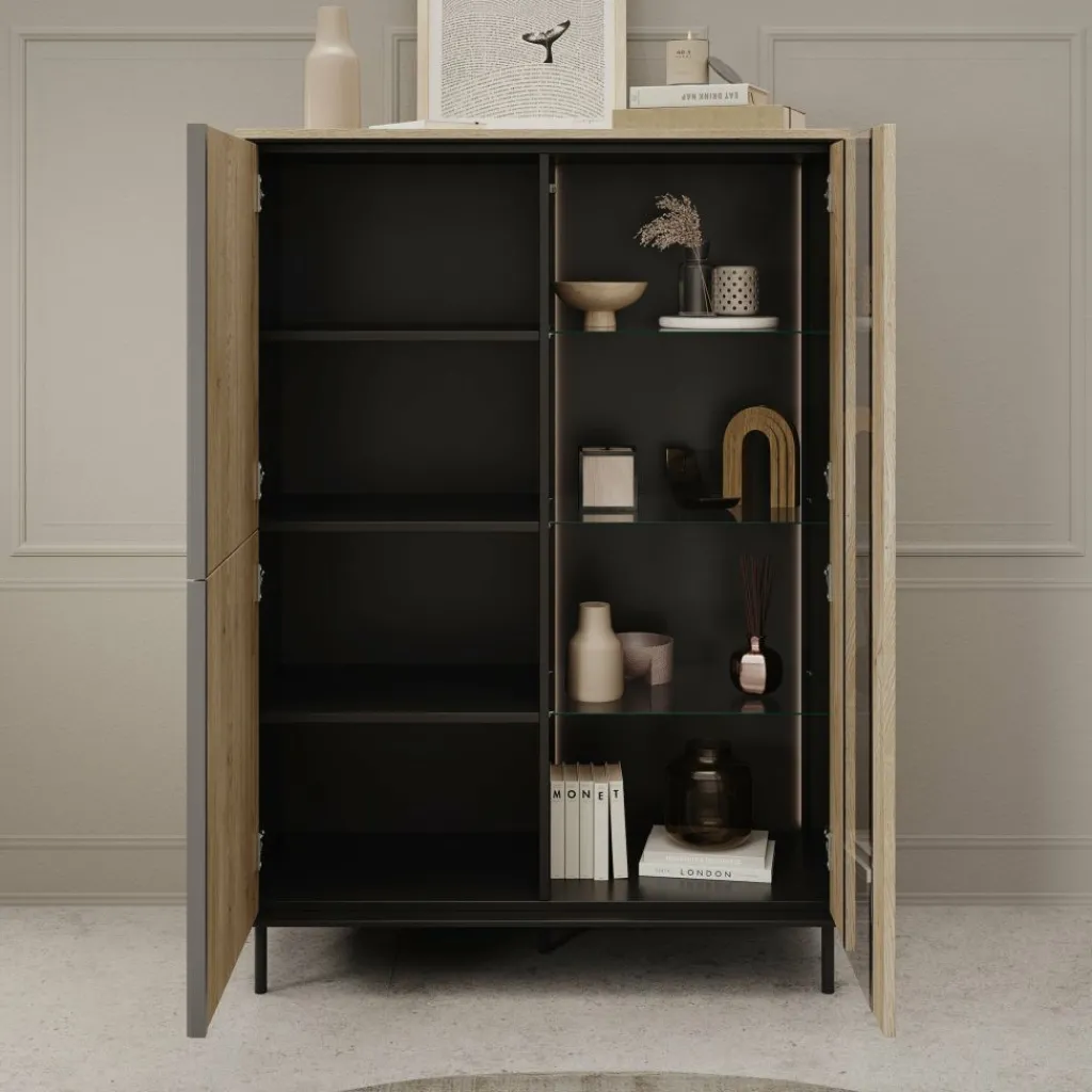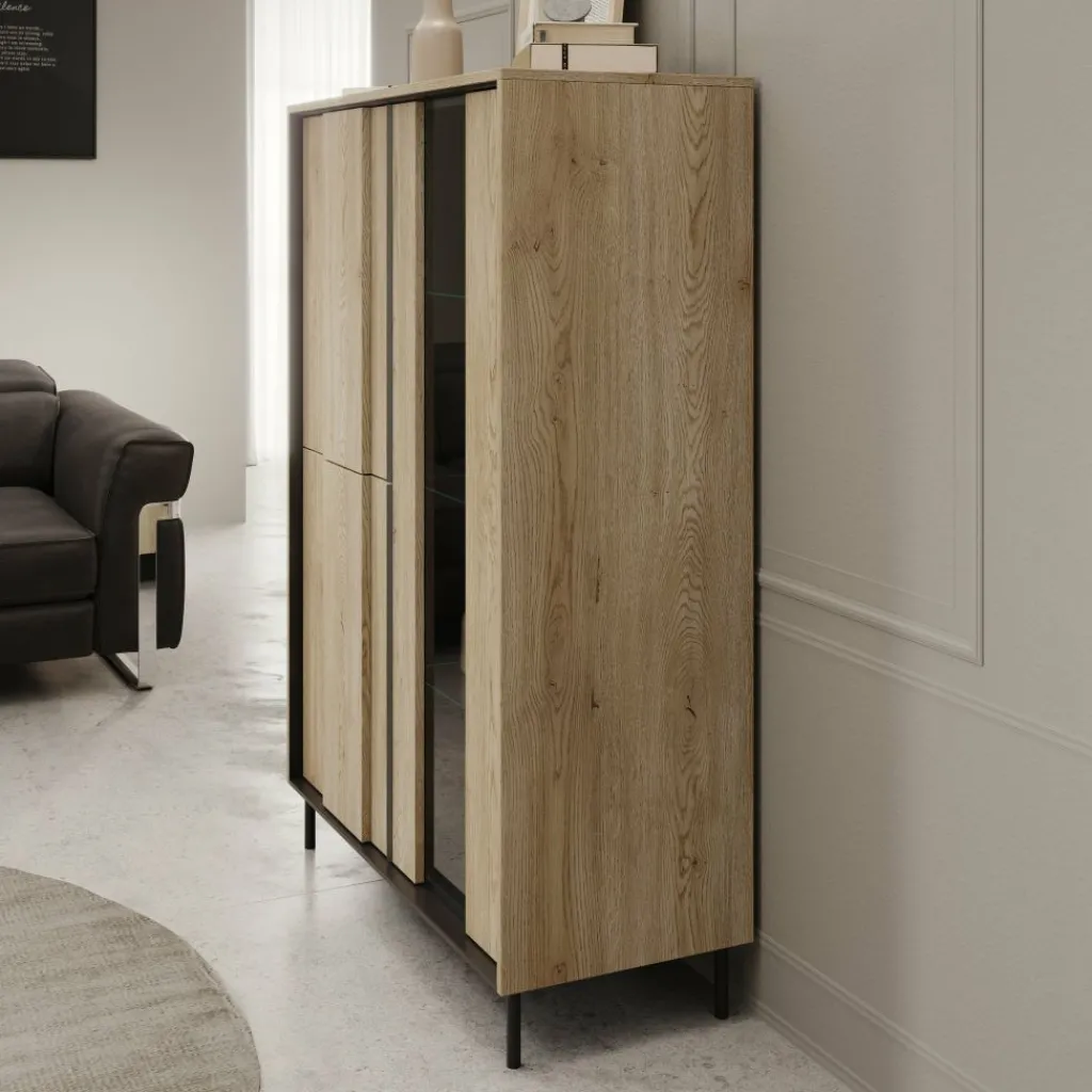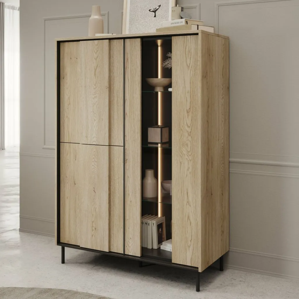De vitrinekast is voorzien van drie deuren. Aan de rechterzijde bevindt zich een glazen deur met daarachter glazen legplanken. In dit vitrinedeel is ledverlichting aangebracht in de vorm van een verticale ledstrip. Deze ledverlichting is aangesloten op een drukknop die aan de zijkant van het meubel wordt bevestigd en zorgt voor verlichting van het open gedeelte. De linker- en middensectie zijn gesloten en bieden opbergruimte uit het zicht. De binnenzijde is donker afgewerkt en contrasteert met het lichte eikenpatroon aan de buitenkant.