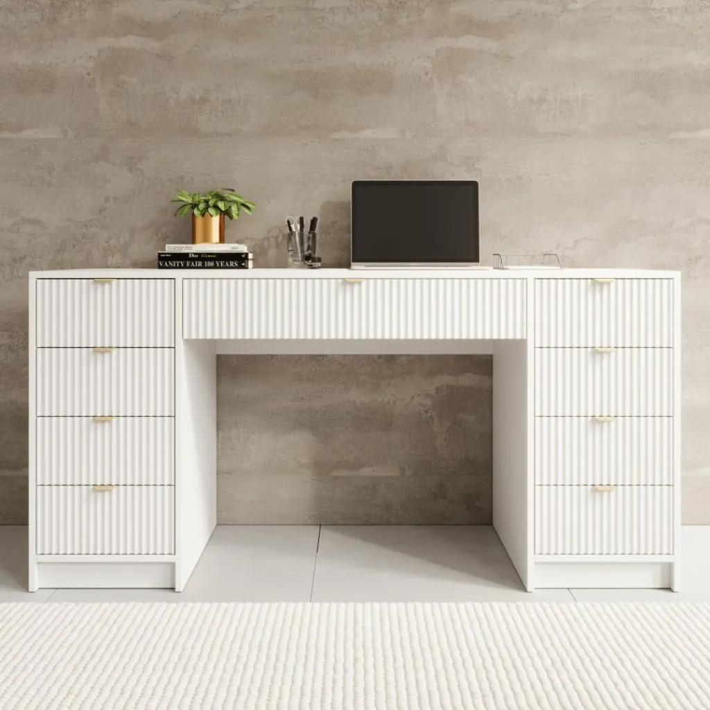 Dankzij de indeling met vier lades aan de linkerzijde, vier lades aan de rechterzijde én een brede middenlade, biedt deze kaptafel meer dan genoeg ruimte voor al je make-up, sieraden, haarproducten en andere essentials.