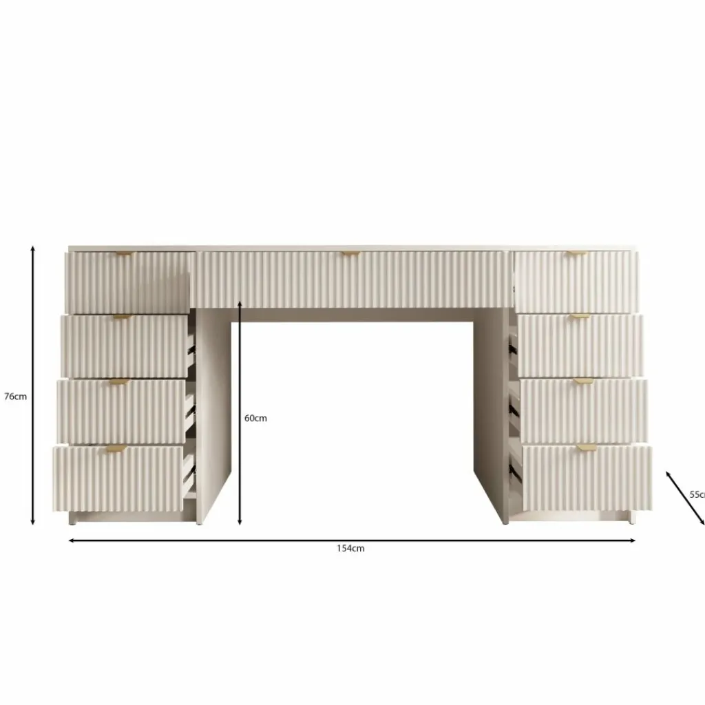 Bureau Tavares 2 combineert een stijlvolle afwerking met slimme opbergruimte. De geribbelde ladefronten en goudkleurige grepen geven het meubel een moderne, elegante uitstraling, terwijl het royale werkblad van 154 cm breed en 55 cm diep veel ruimte biedt om prettig te werken.