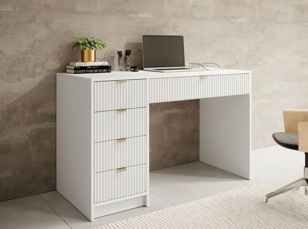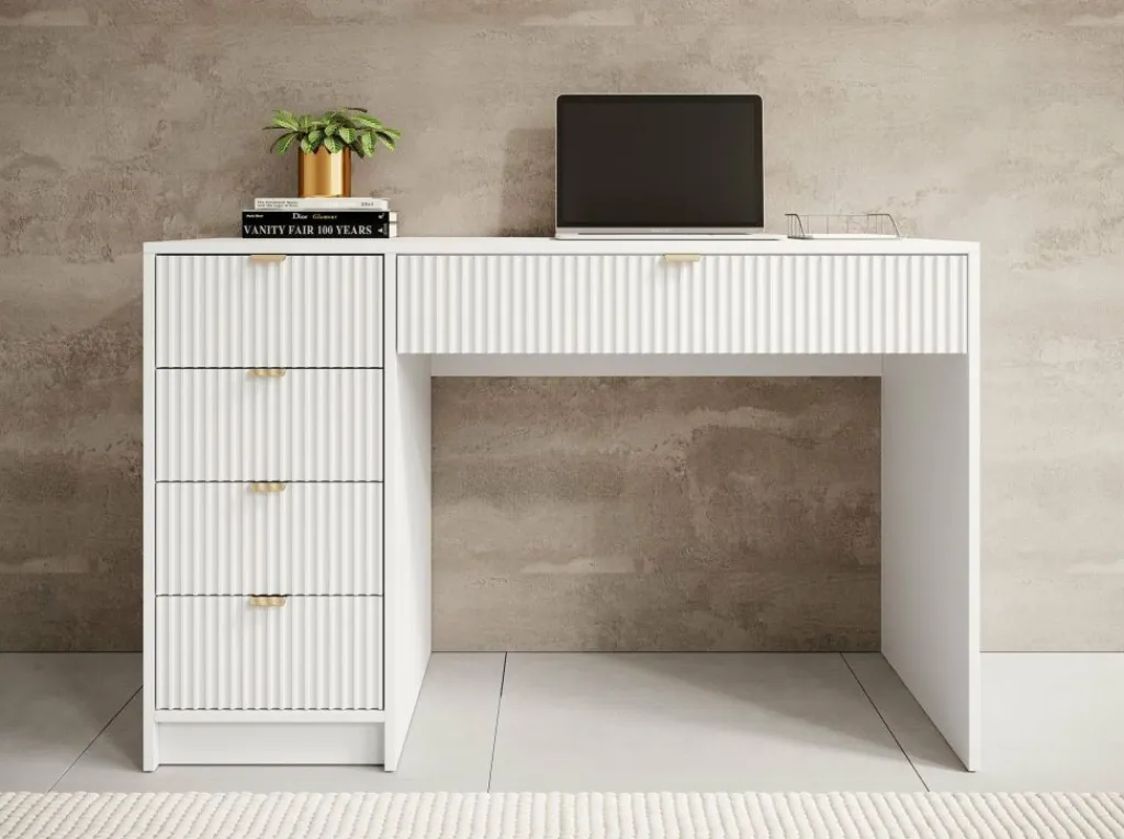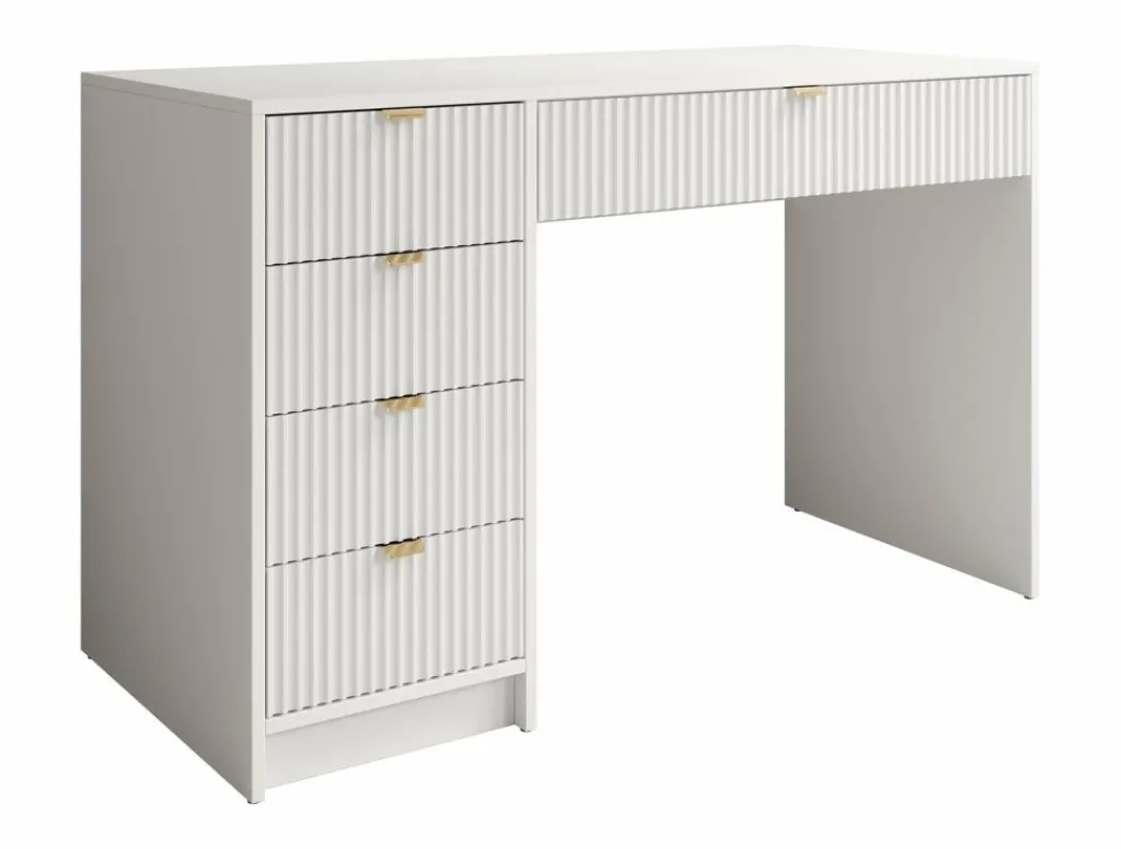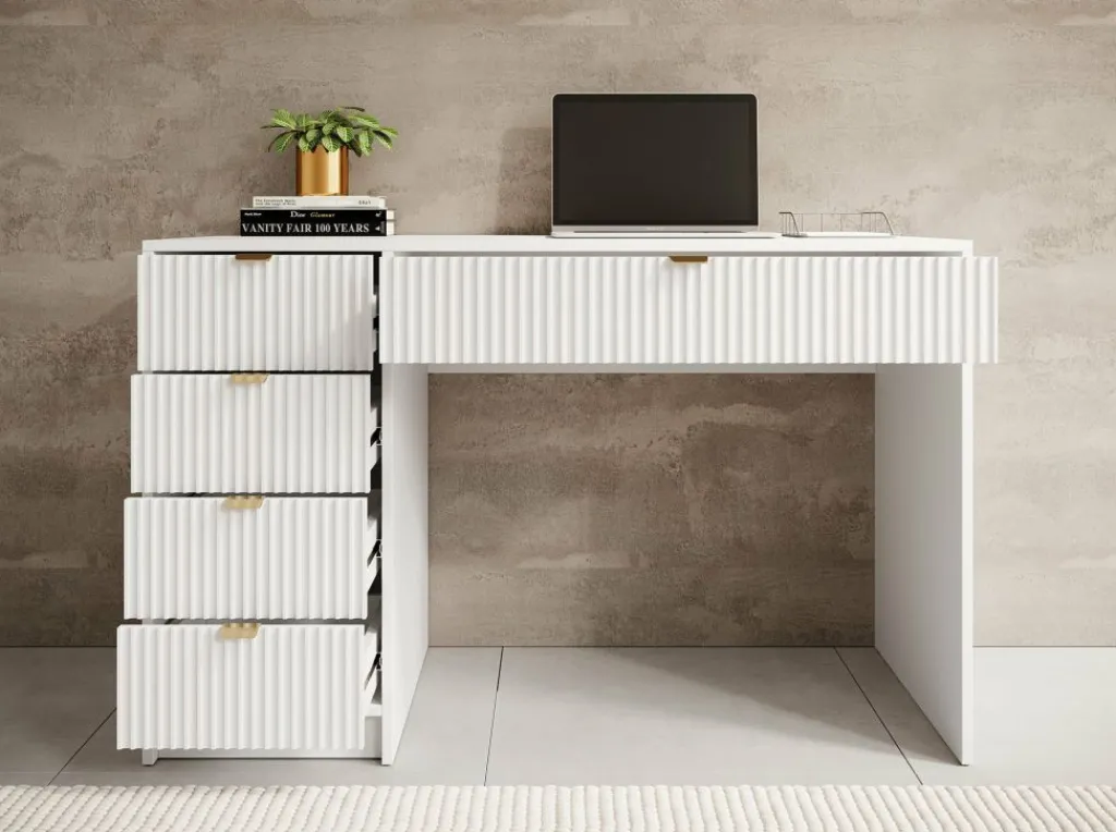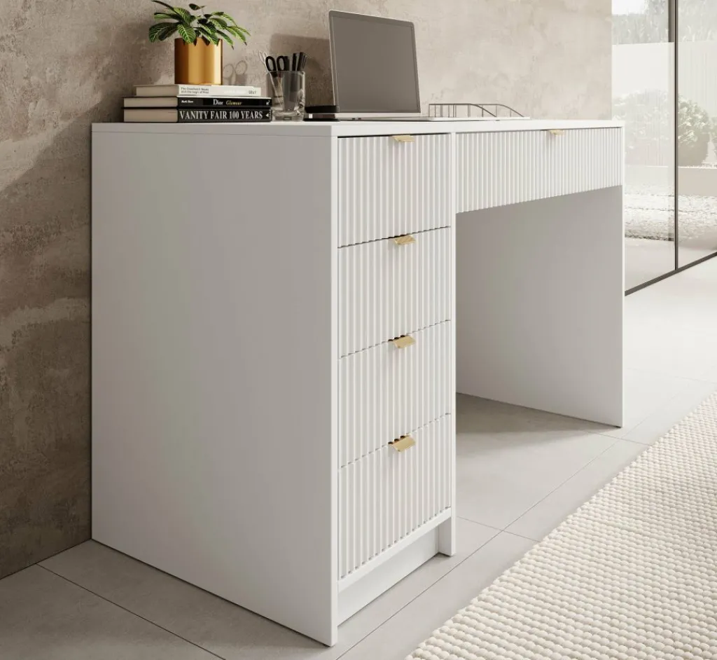 Kaptafel Tavares is een stijlvol meubelstuk dat perfect past in een hotel chique interieur. Uitgevoerd in een frisse witte kleur en afgewerkt met verfijnde goudkleurige handgrepen.
