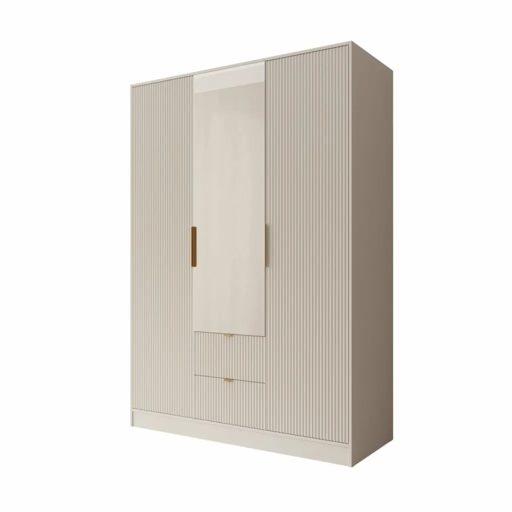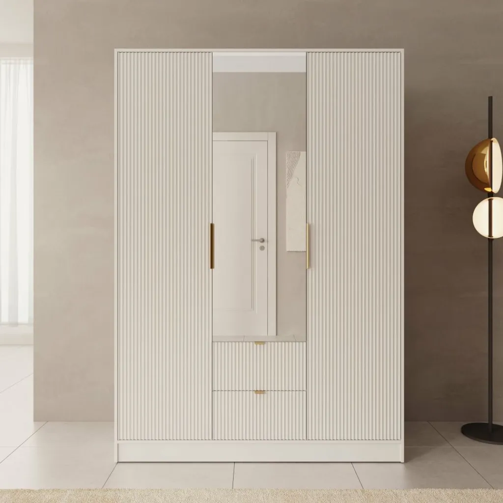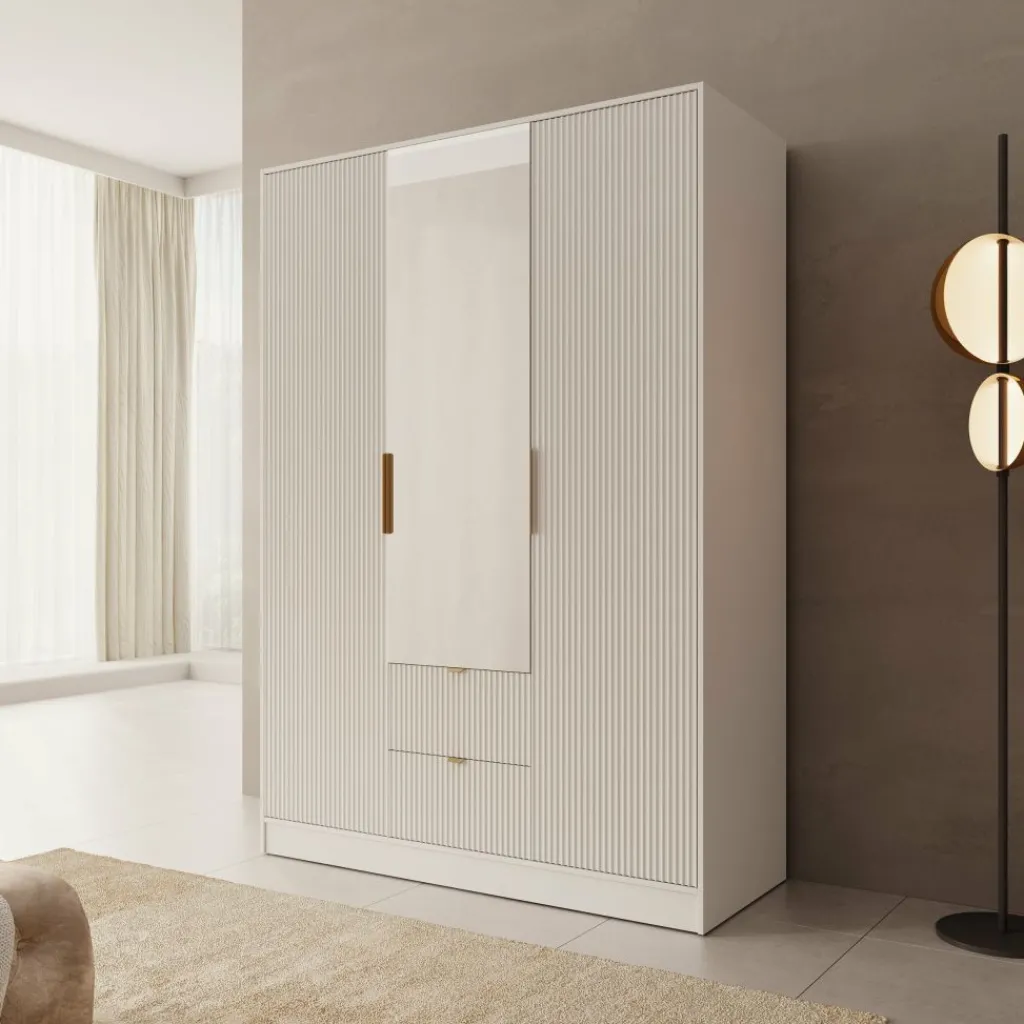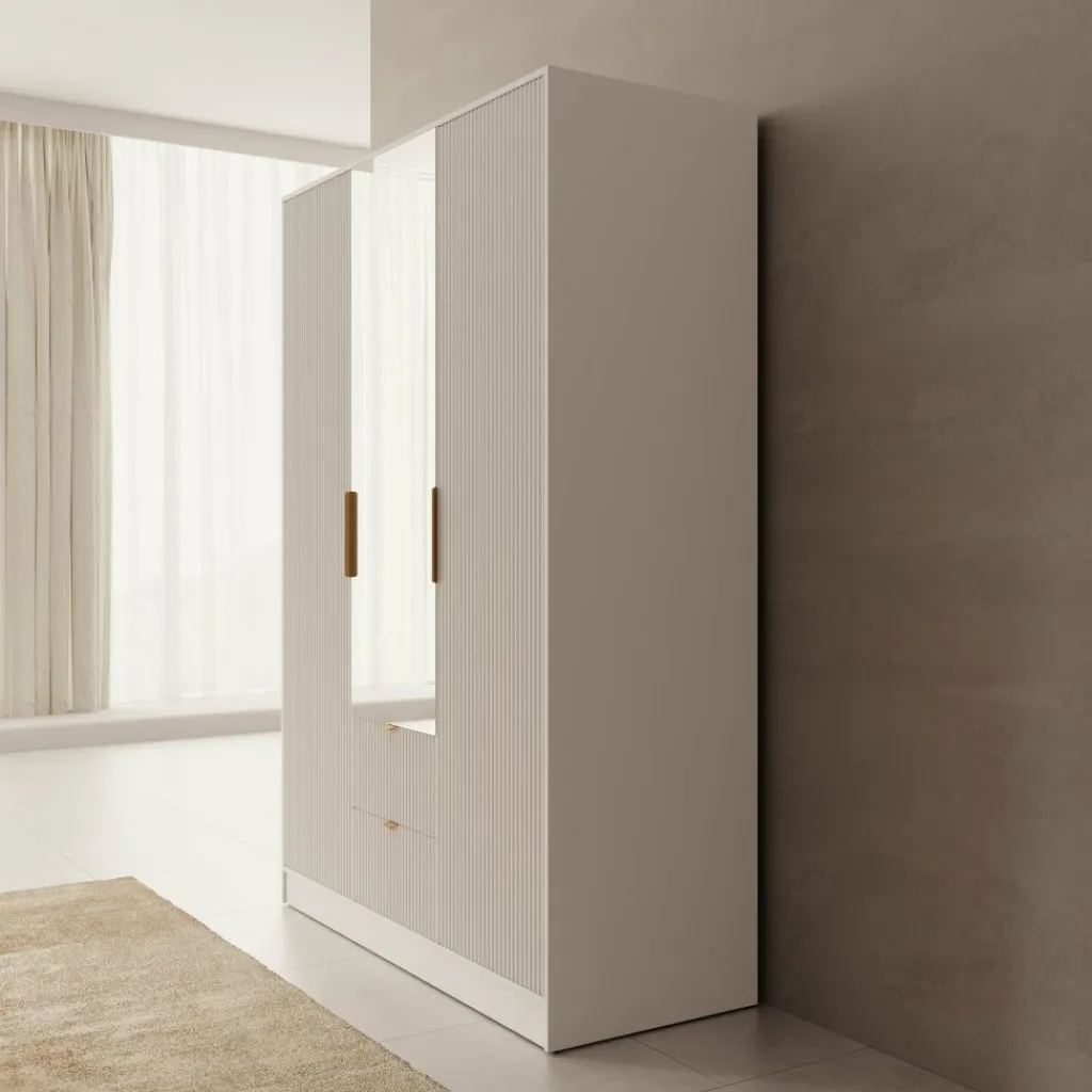 De Tavares kledingkast in wit biedt overzicht en opbergruimte voor je complete garderobe. Met drie deuren, een geïntegreerde spiegel en twee lades heb je direct een praktische indeling tot je beschikking. De verticale lijnen geven het ontwerp een rustige structuur en zorgen voor een strak geheel in de slaapkamer.