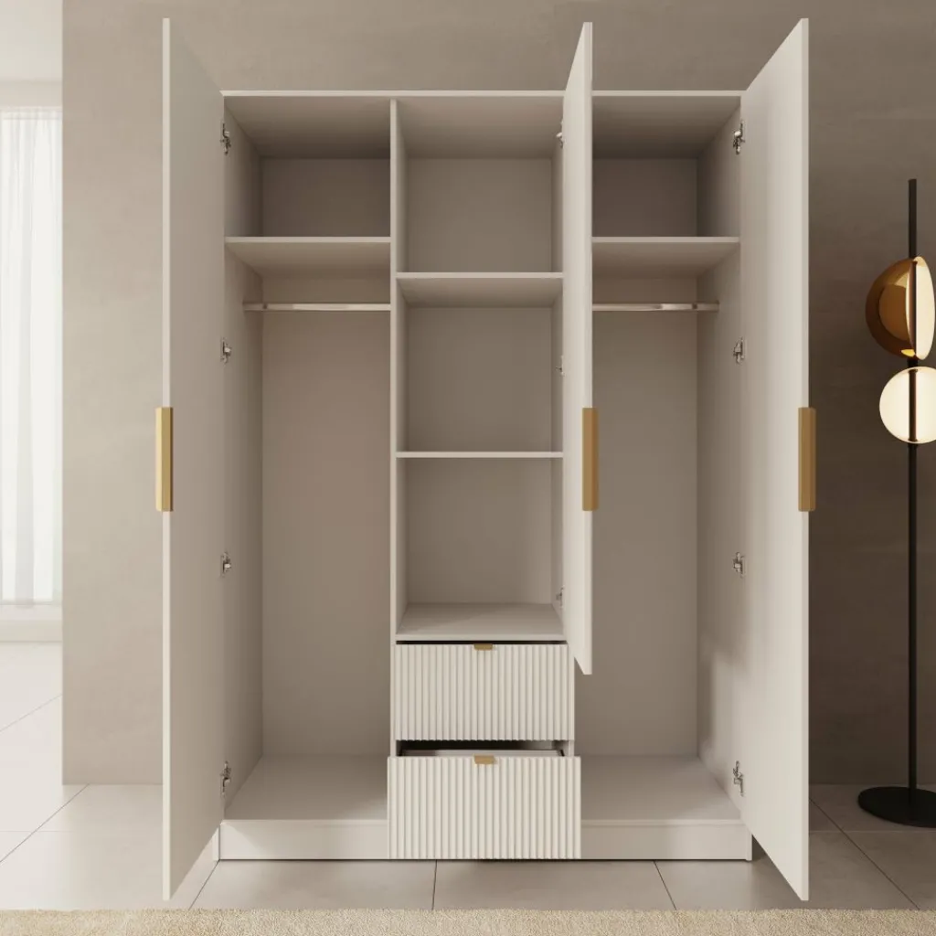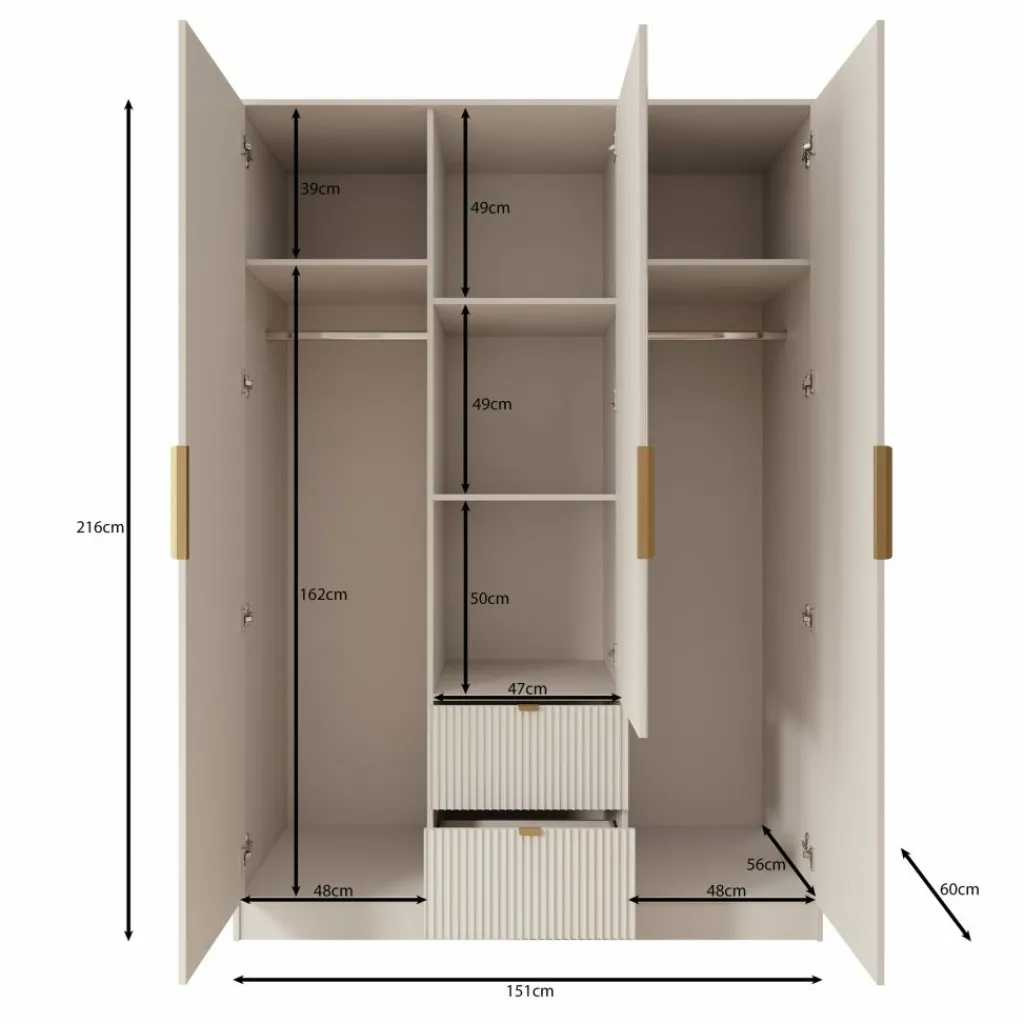 Achter de deuren vind je een ruime combinatie van legplanken en twee kledingroedes, waardoor zowel gevouwen kleding als langere outfits netjes opgeborgen blijven. De lades zijn ideaal voor kleinere items zoals accessoires of ondergoed. De kast staat stevig, opent soepel en is ontworpen om dagelijks gebruik probleemloos aan te kunnen.