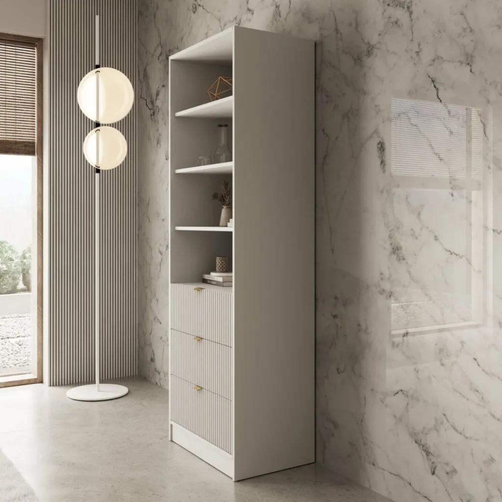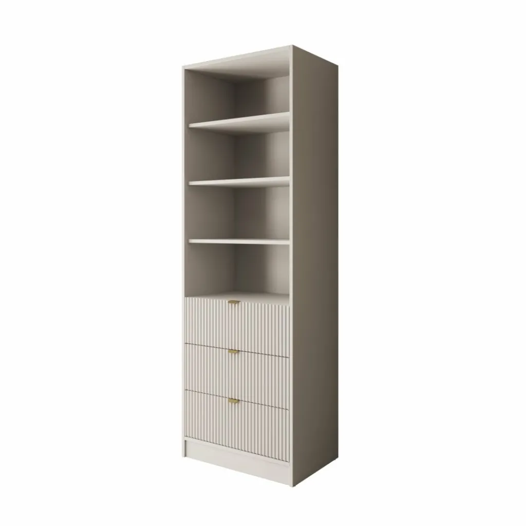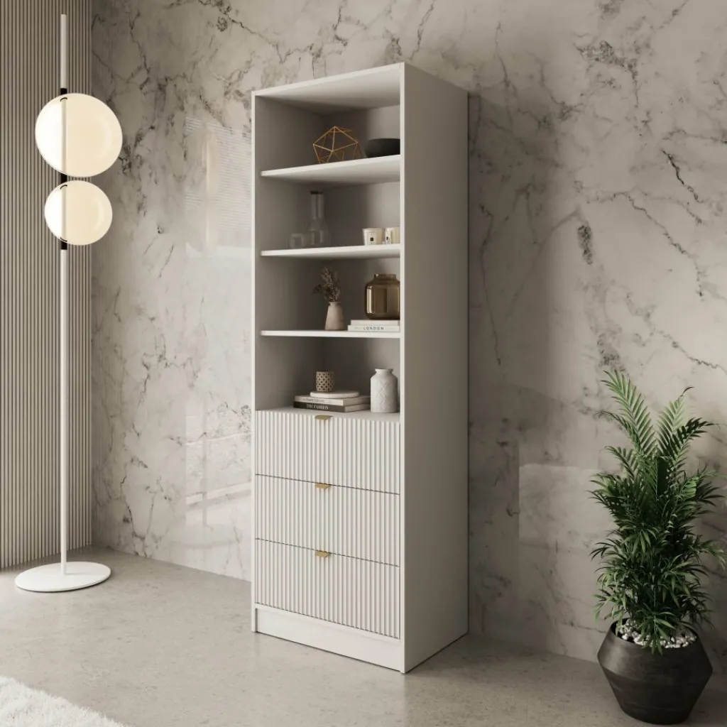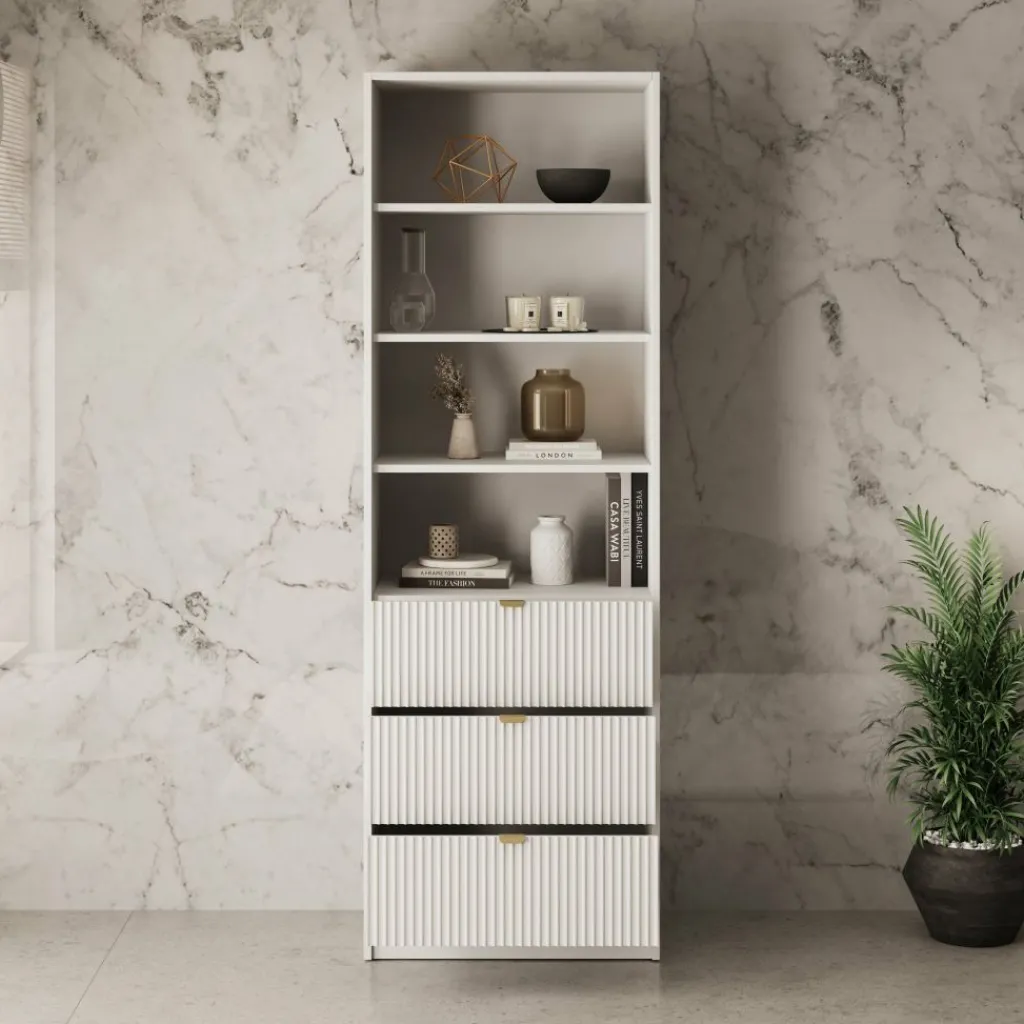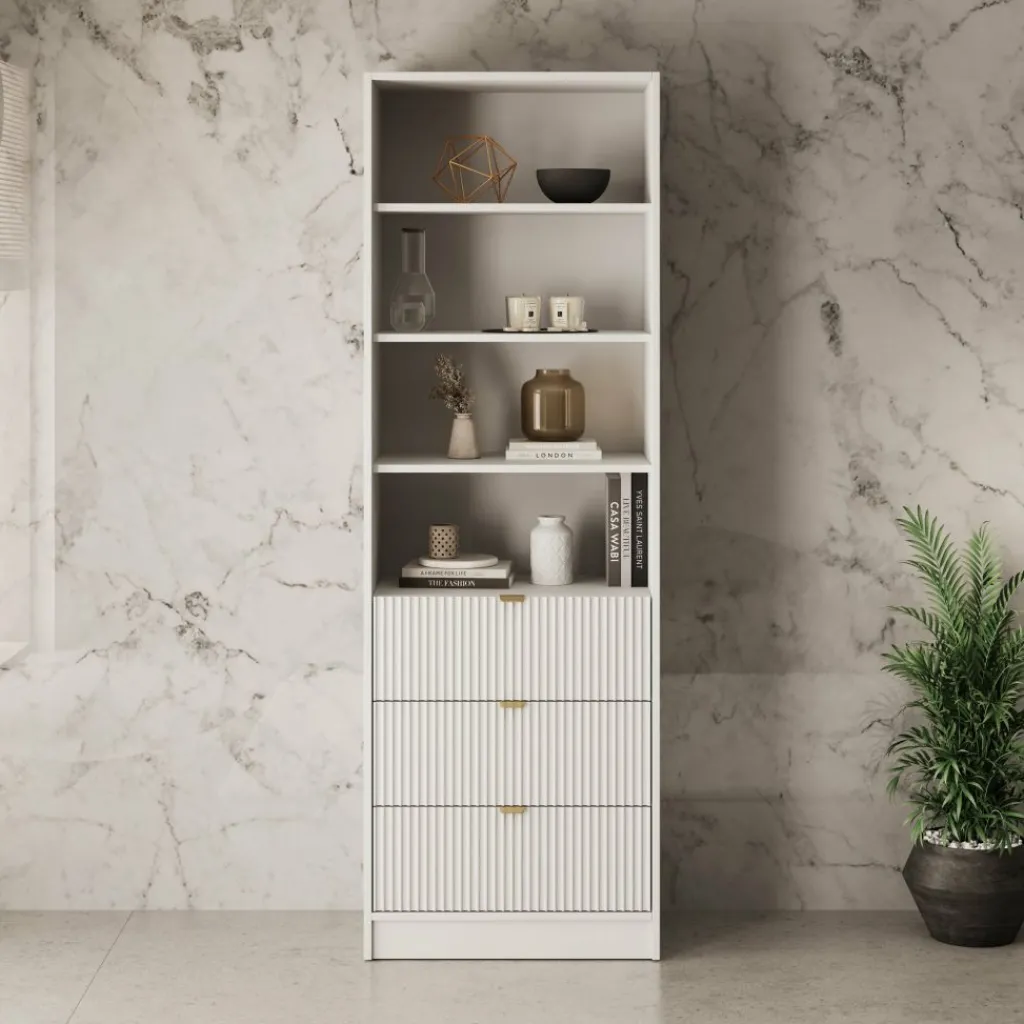De Tavares-boekenkast in wit heeft een strakke en lichte uitstraling, waardoor hij eenvoudig in verschillende interieurs past. De kast beschikt over drie open schappen voor boeken en accessoires, aangevuld met drie lades voor extra opbergruimte. De verticale structuur in de ladefronten brengt een stijlvol detail aan, terwijl de gouden accenten voor een subtiel contrast zorgen. Het slanke ontwerp maakt de kast geschikt voor elke ruimte waar je zowel opberging als presentatie zoekt.