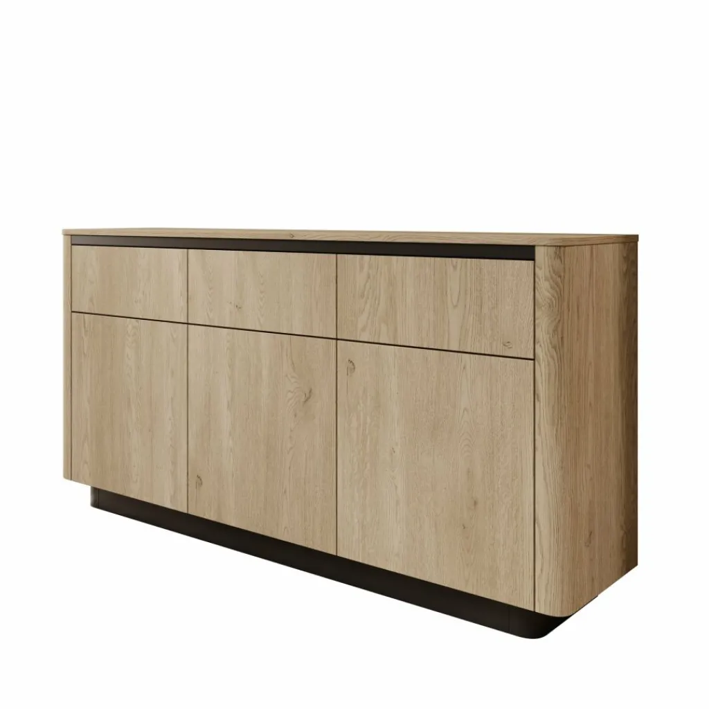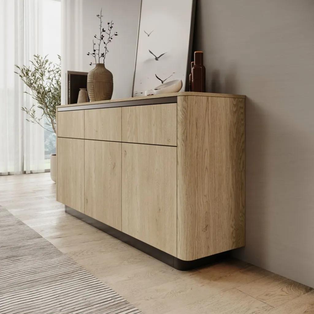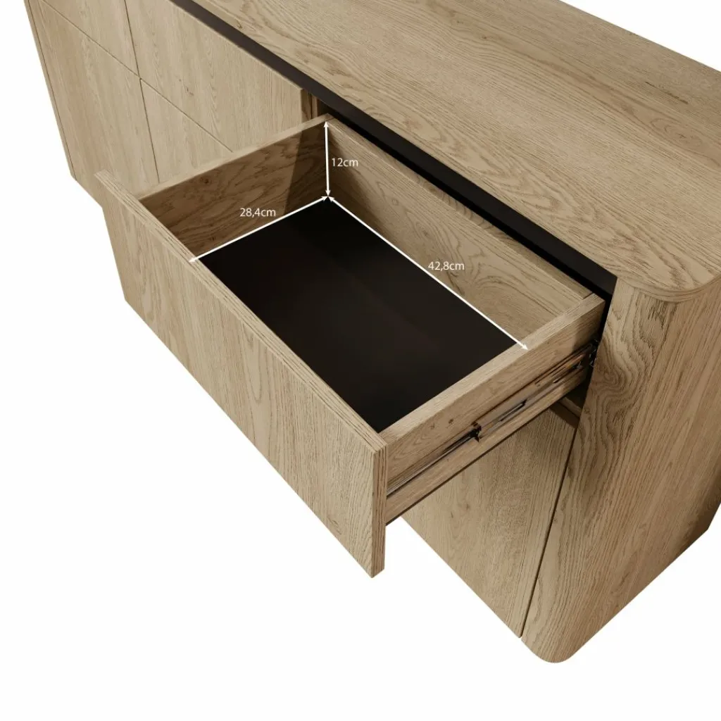 Het Taywan dressoir in eiken heeft een rustig en modern ontwerp met natuurlijke houtstructuren en afgeronde hoeken. De combinatie van het eikenhout met de donkere plint en bovenrand zorgt voor een mooi contrast en geeft het meubel een stevige, uitgebalanceerde uitstraling.