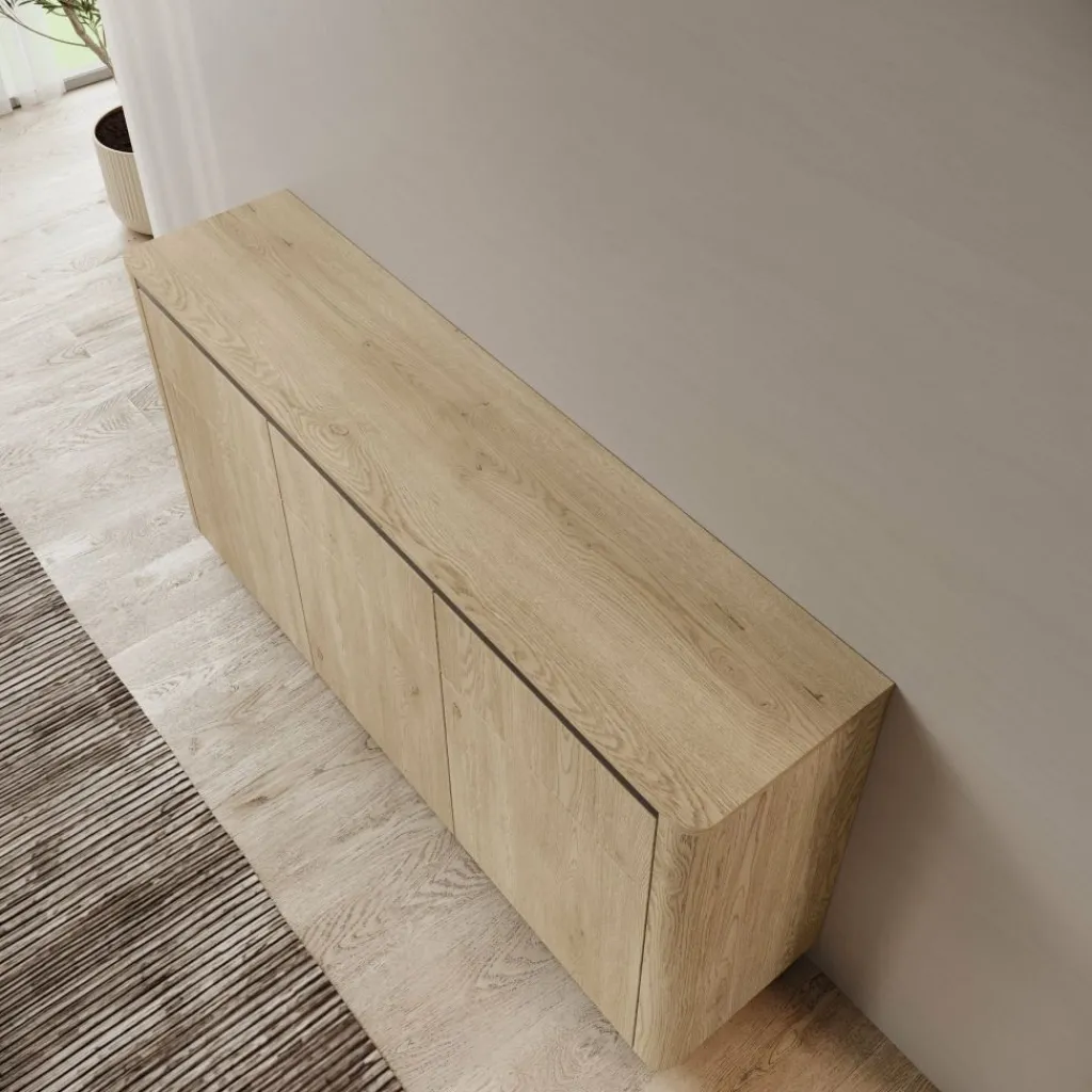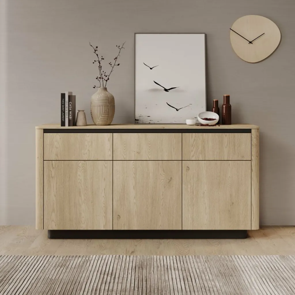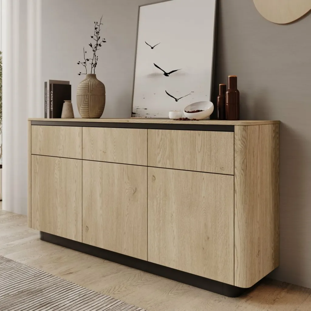 Het Taywan dressoir in eiken heeft een rustig en modern ontwerp met natuurlijke houtstructuren en afgeronde hoeken. De combinatie van het eikenhout met de donkere plint en bovenrand zorgt voor een mooi contrast en geeft het meubel een stevige, uitgebalanceerde uitstraling.