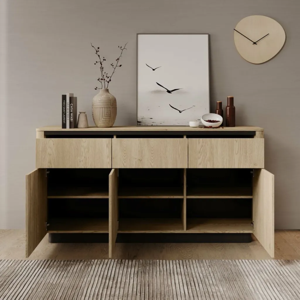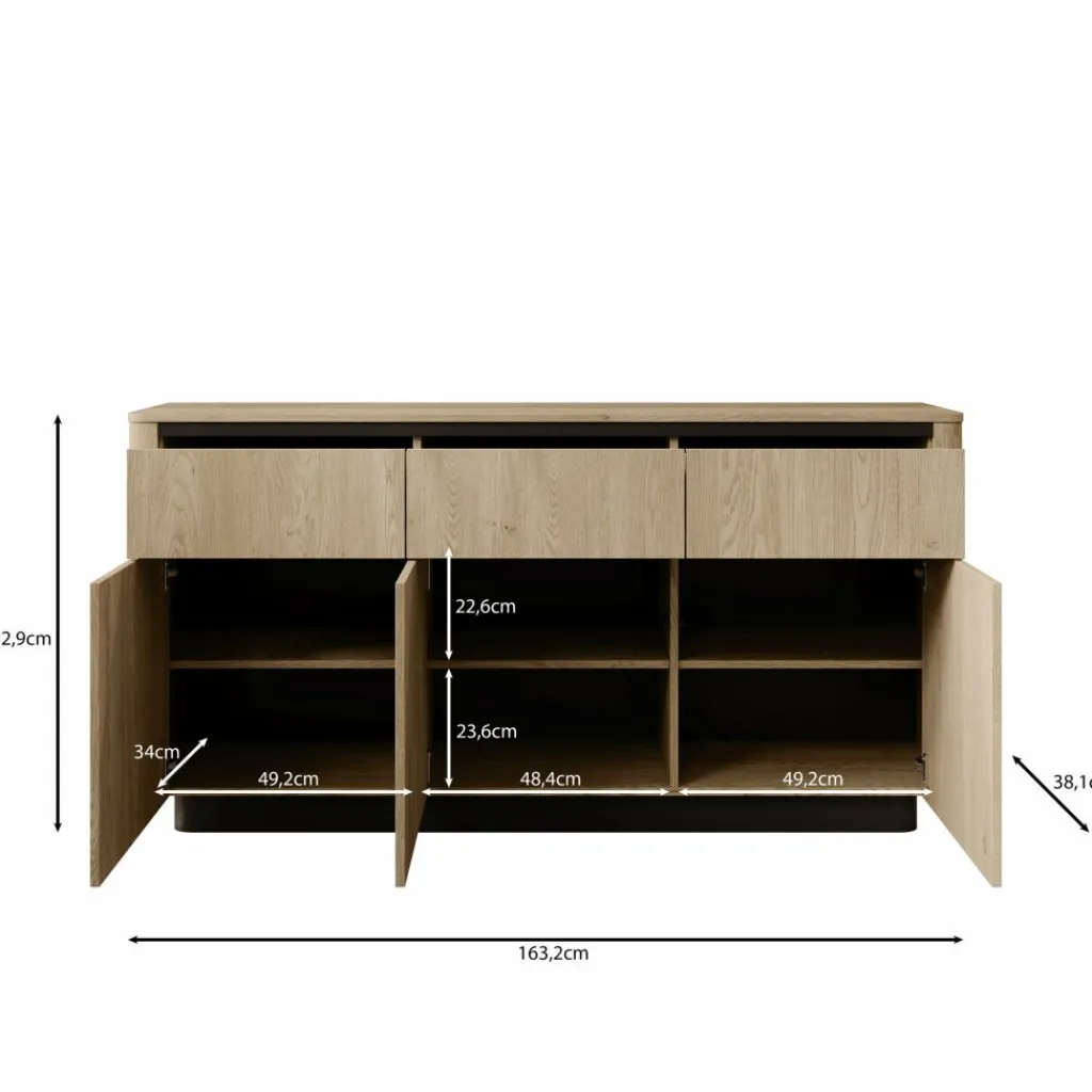 Het dressoir is voorzien van drie deuren en drie lades, die samen veel opbergruimte bieden voor servies, glaswerk of andere spullen. De fronten sluiten strak aan en behouden de strakke lijnen van het ontwerp.